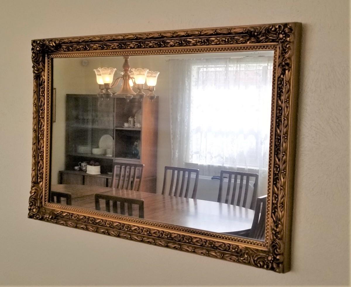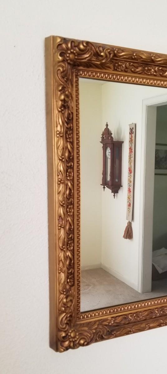 Nice vintage wall mirror - has hooks to hang vertically or horizonallly. Label on back states this was purchased in 1971. Good condition. Measures 36.5" x 23.5". Not especially heavy - frame is nicely rendered, but the piece is just decorative. Frame is heavy plastic made to look like gilded wood. A mid-century deceiver!