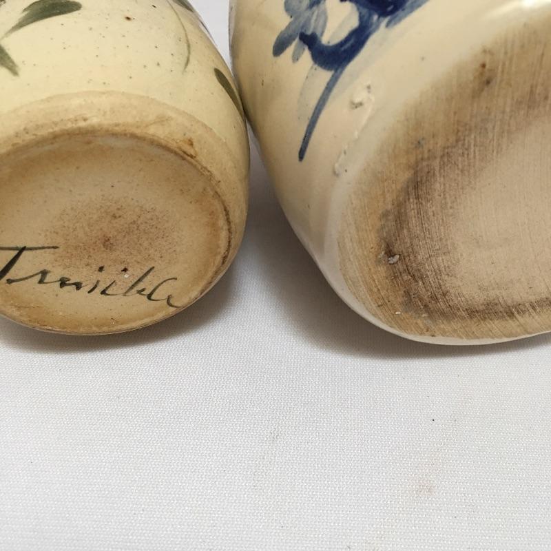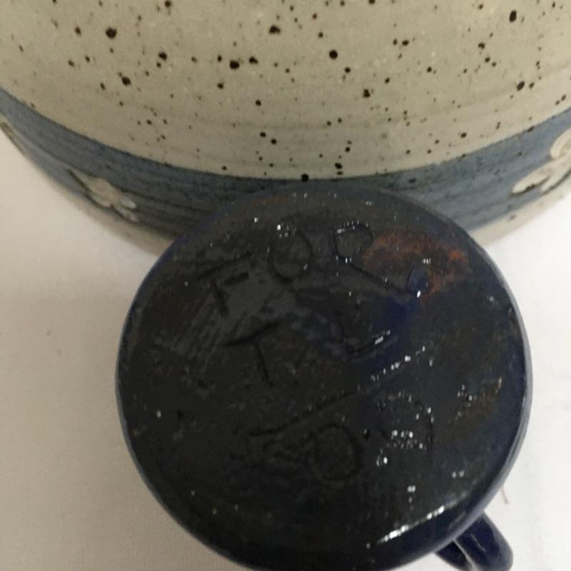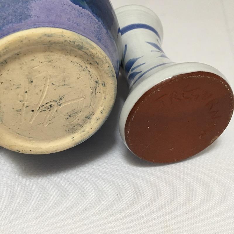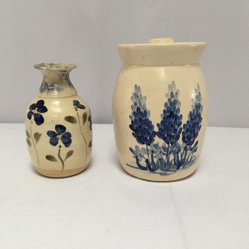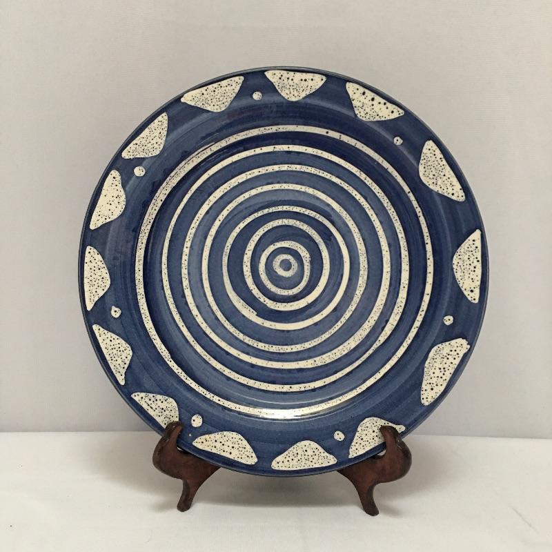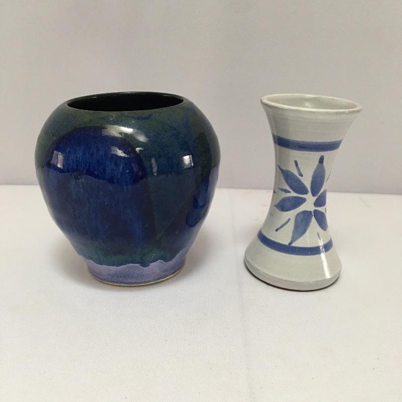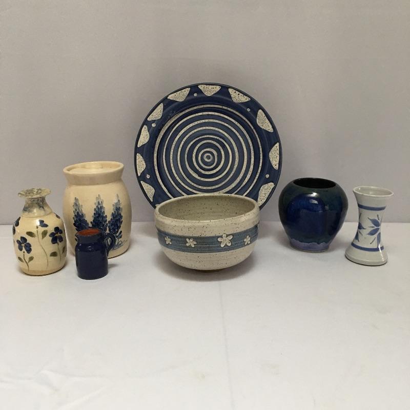 Blue Pottery includes swirl plate, bowl, three vases, mini pitcher and a jar with top. Some pieces signed. See photos. Plate measures 10.5”D.