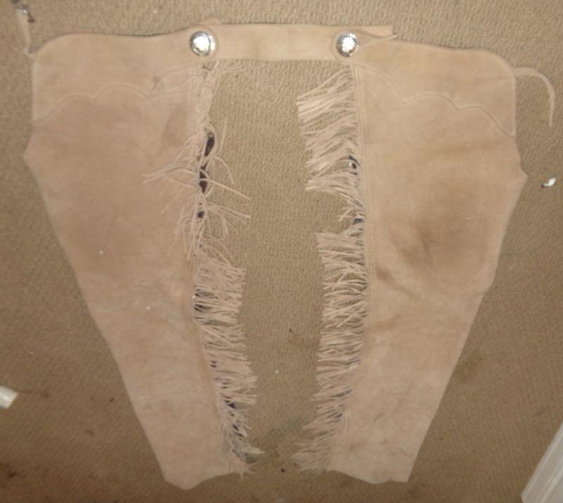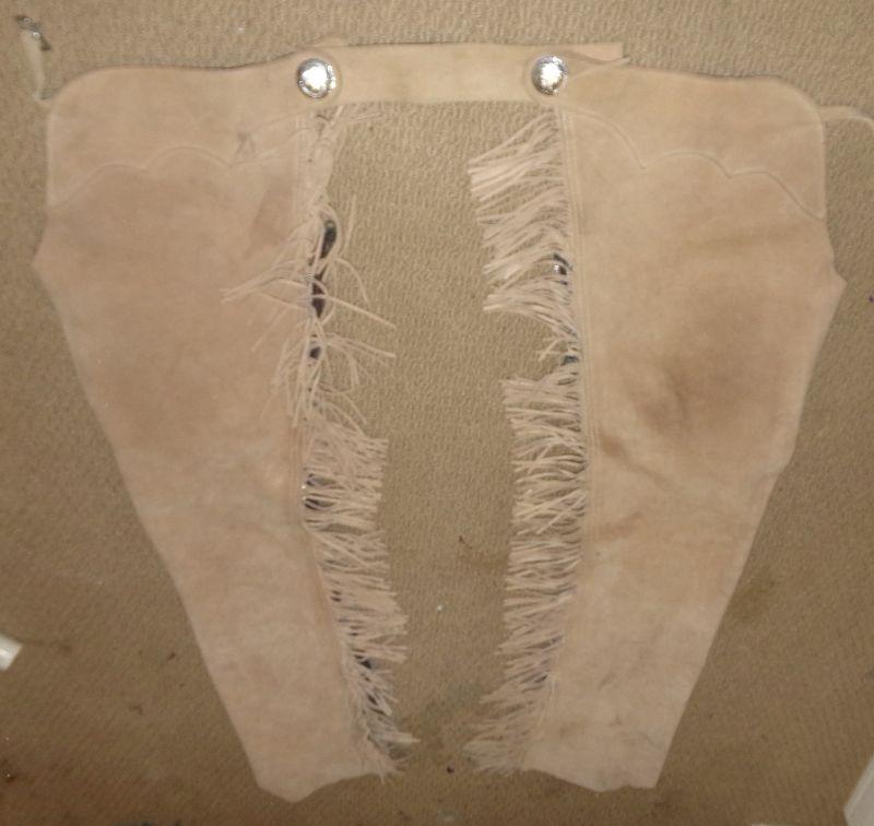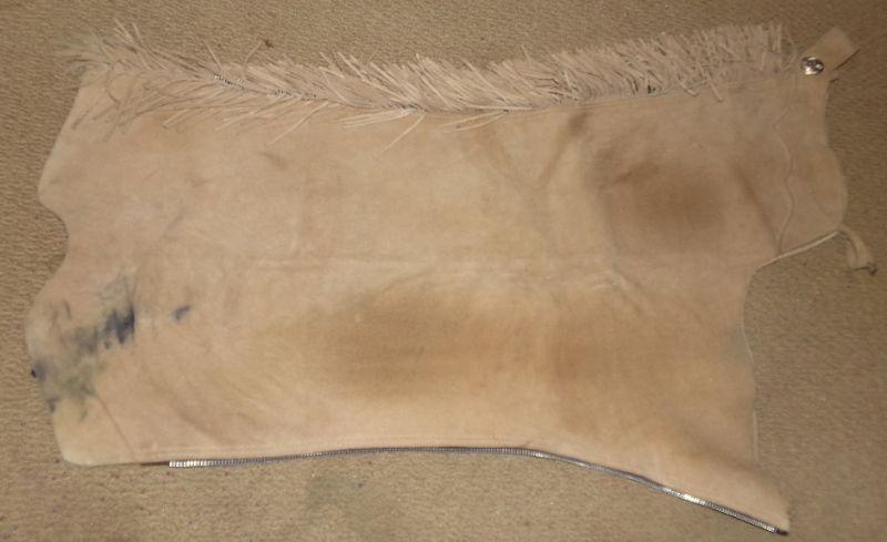 LIGHT BROWN LEATHER CHAPS WITH FRINGE, NO SIZE SEEN, SOME STAINS