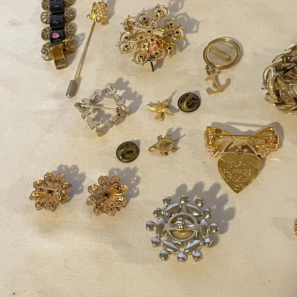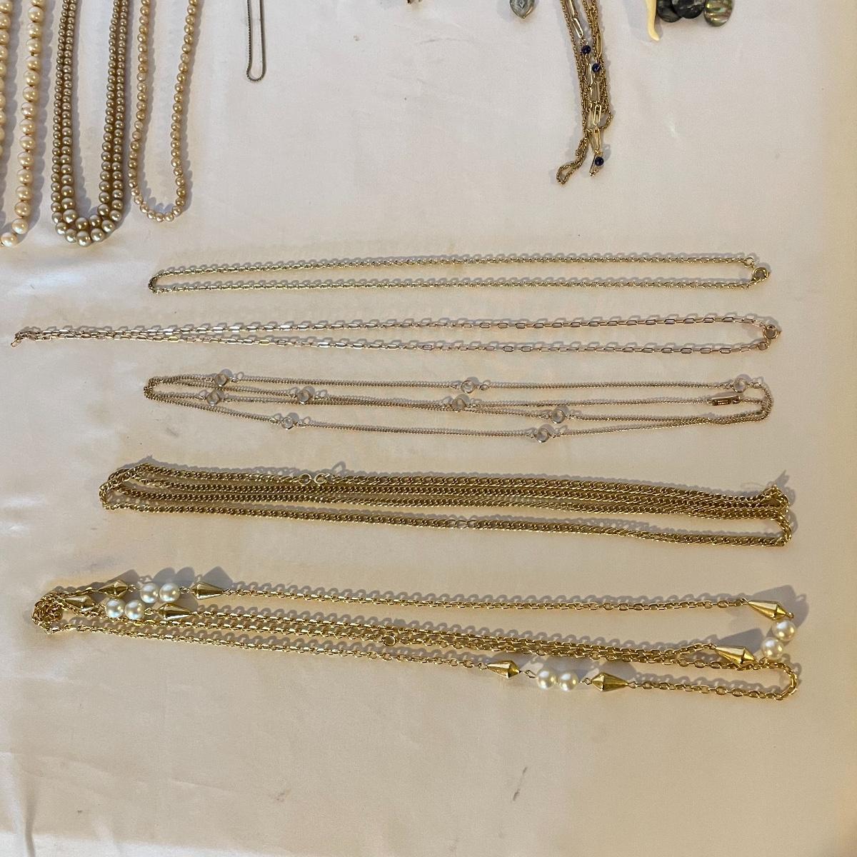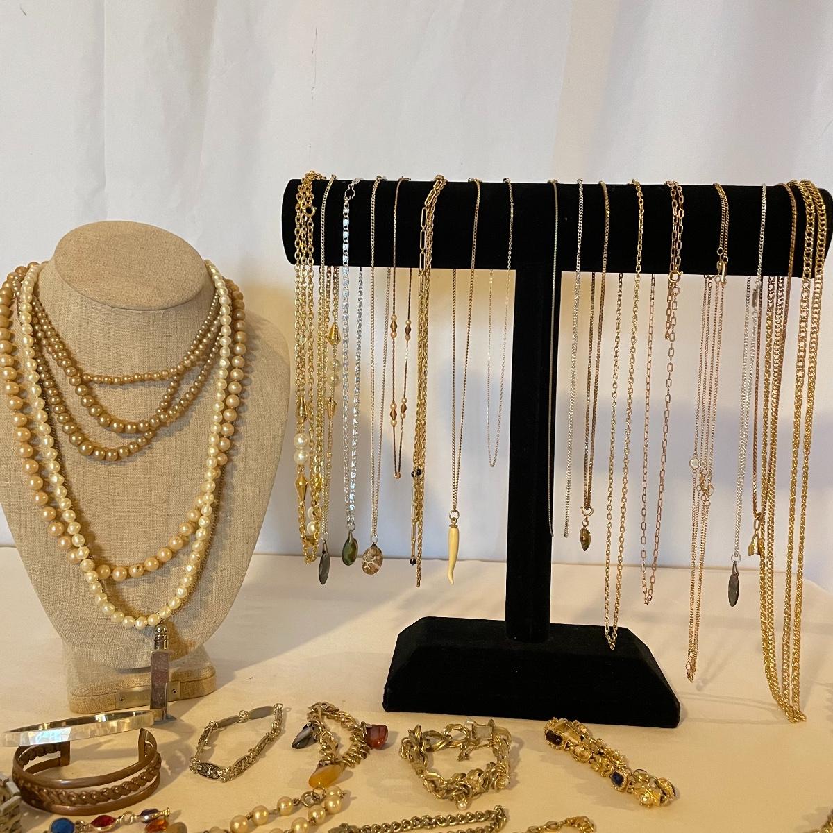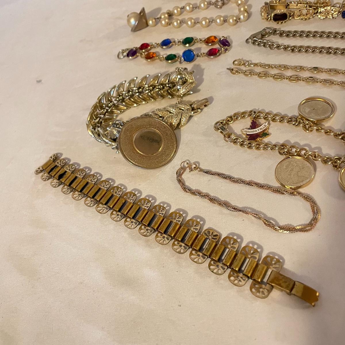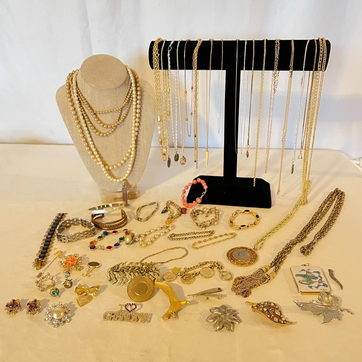 This is a classic must-have collection from everyday to elegant. Selection includes twenty four necklaces with chains, pearls and shells. All known clasp markings are shown in photos, with the exception of two more Germany markings on the shell necklaces. Necklaces range from 16” to 56” Lot features older and newer pieces and even a perfume #1 pendant. This collection also offers a variety of over fifteen bracelets, all metal with stone, bead, charms and more. Lastly, brooches, lingerie clips and an adorable frog hat pin. See images. Shipping available.