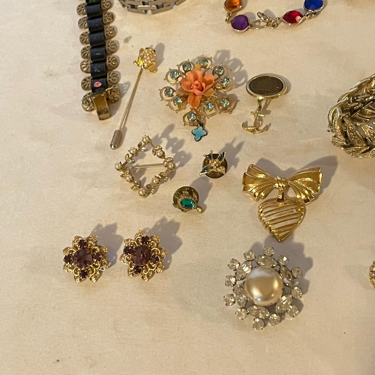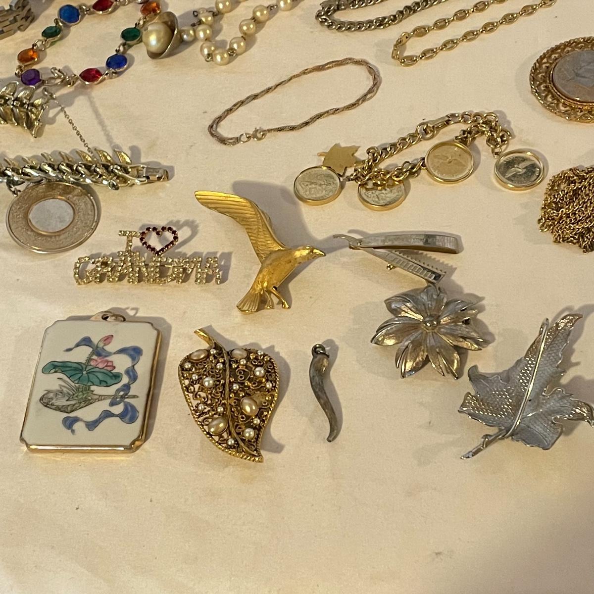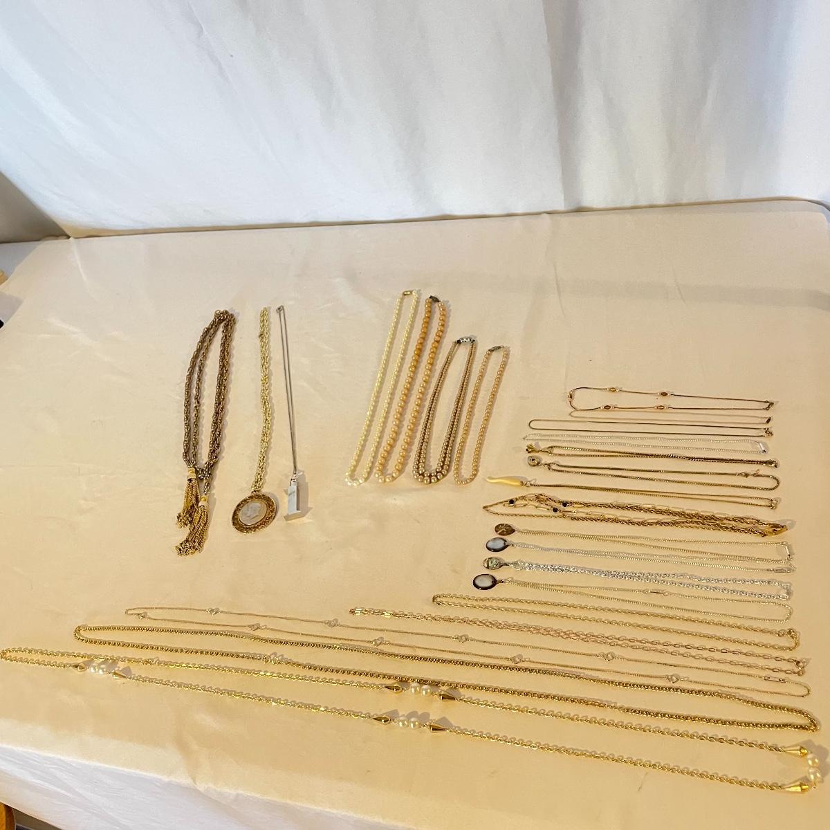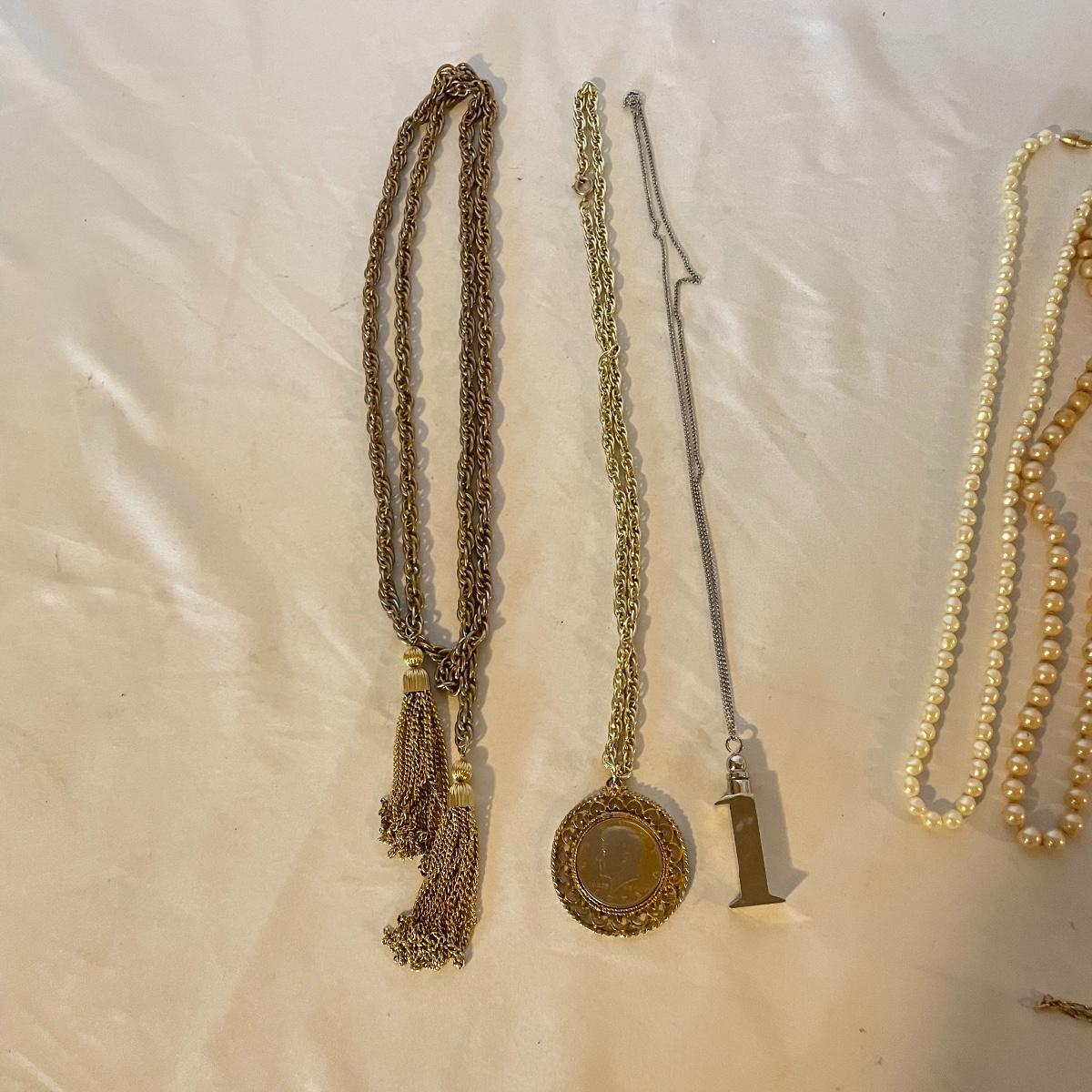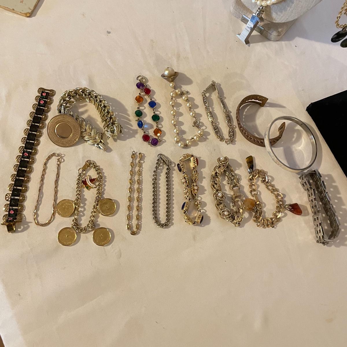 This is a classic must-have collection from everyday to elegant. Selection includes twenty four necklaces with chains, pearls and shells. All known clasp markings are shown in photos, with the exception of two more Germany markings on the shell necklaces. Necklaces range from 16” to 56” Lot features older and newer pieces and even a perfume #1 pendant. This collection also offers a variety of over fifteen bracelets, all metal with stone, bead, charms and more. Lastly, brooches, lingerie clips and an adorable frog hat pin. See images. Shipping available.