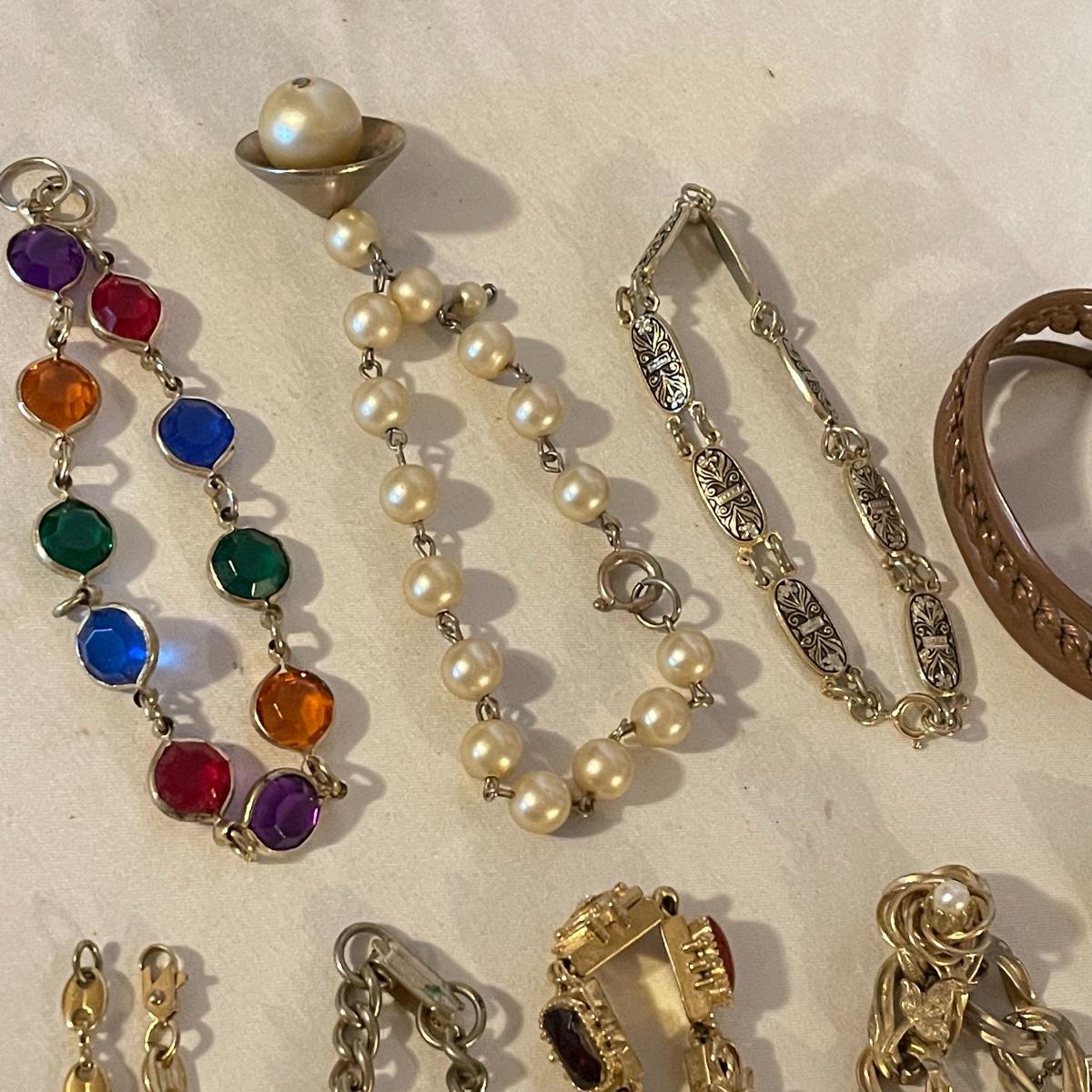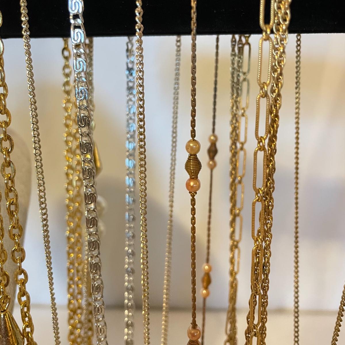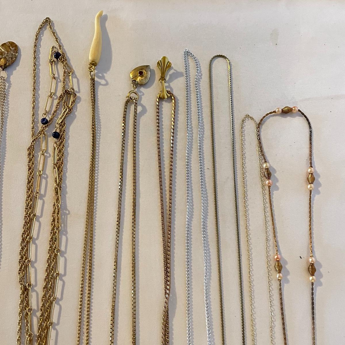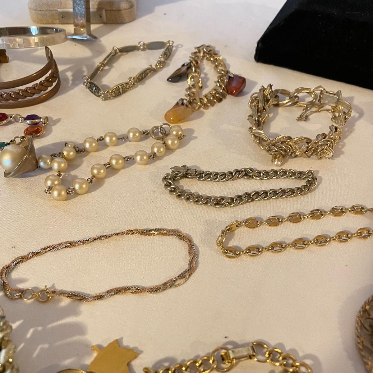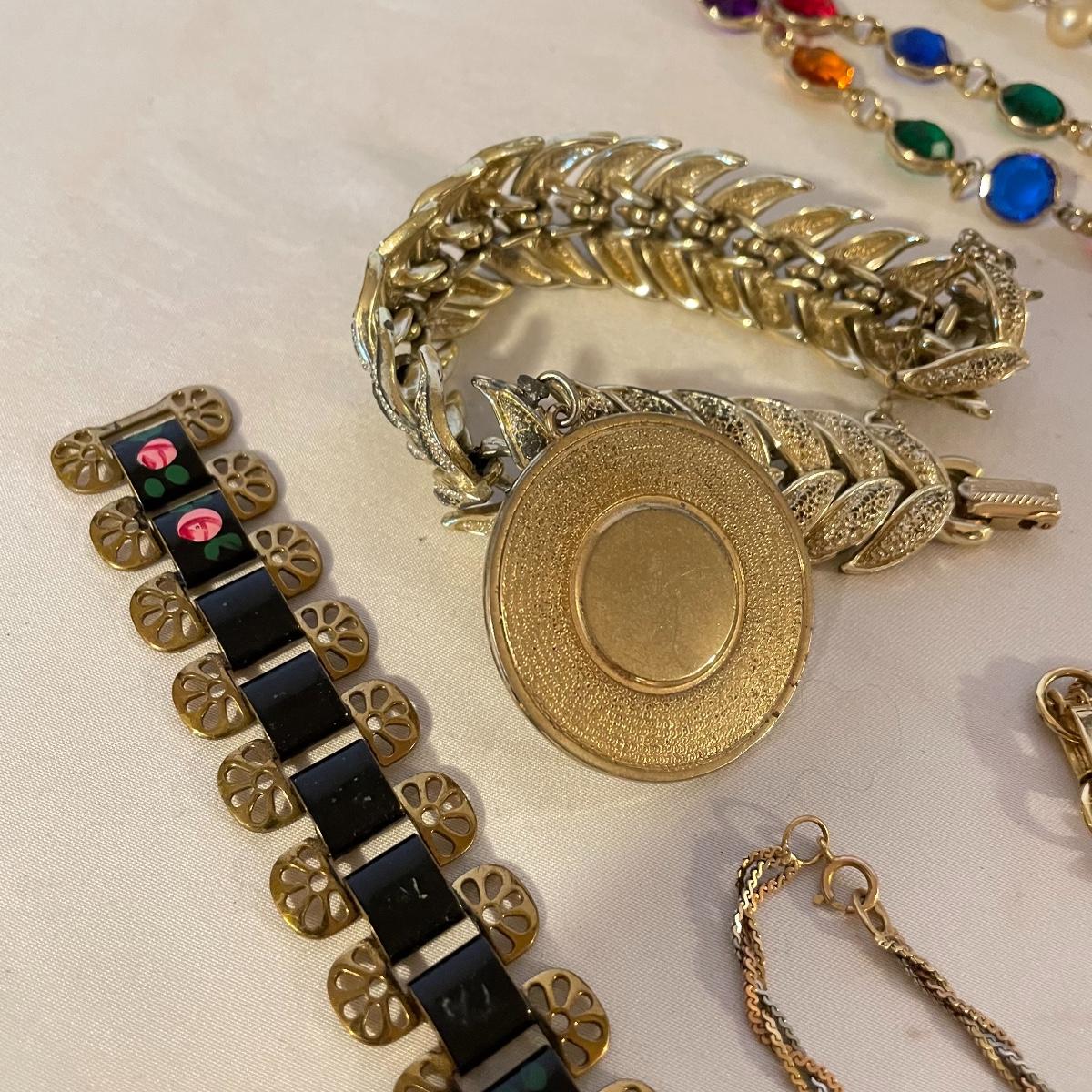 This is a classic must-have collection from everyday to elegant. Selection includes twenty four necklaces with chains, pearls and shells. All known clasp markings are shown in photos, with the exception of two more Germany markings on the shell necklaces. Necklaces range from 16” to 56” Lot features older and newer pieces and even a perfume #1 pendant. This collection also offers a variety of over fifteen bracelets, all metal with stone, bead, charms and more. Lastly, brooches, lingerie clips and an adorable frog hat pin. See images. Shipping available.