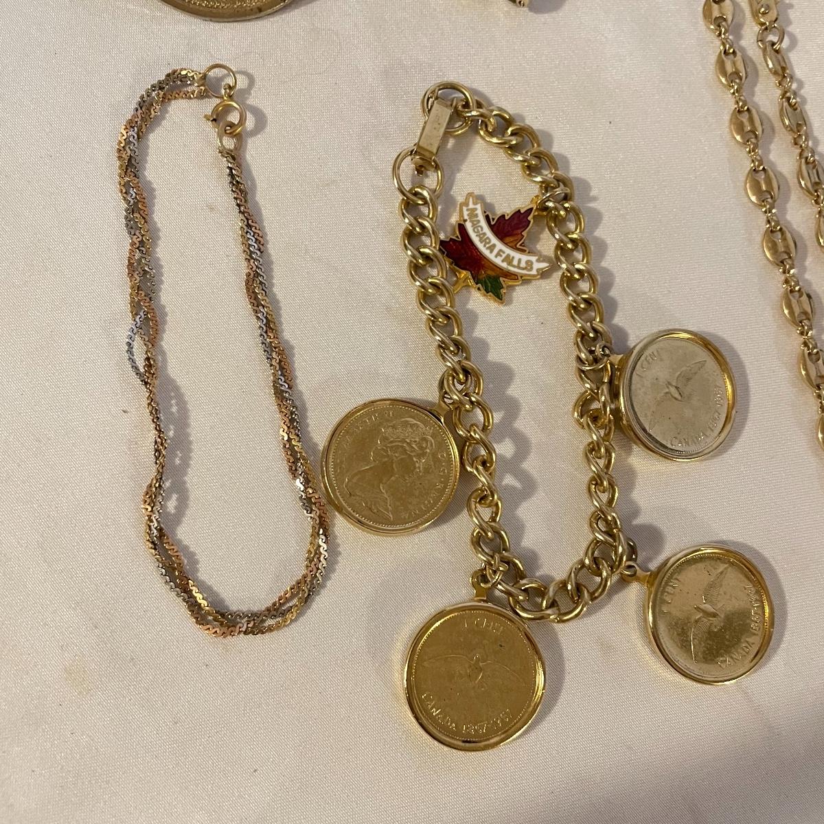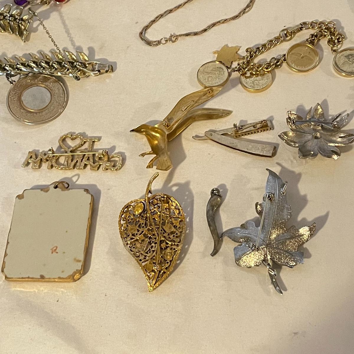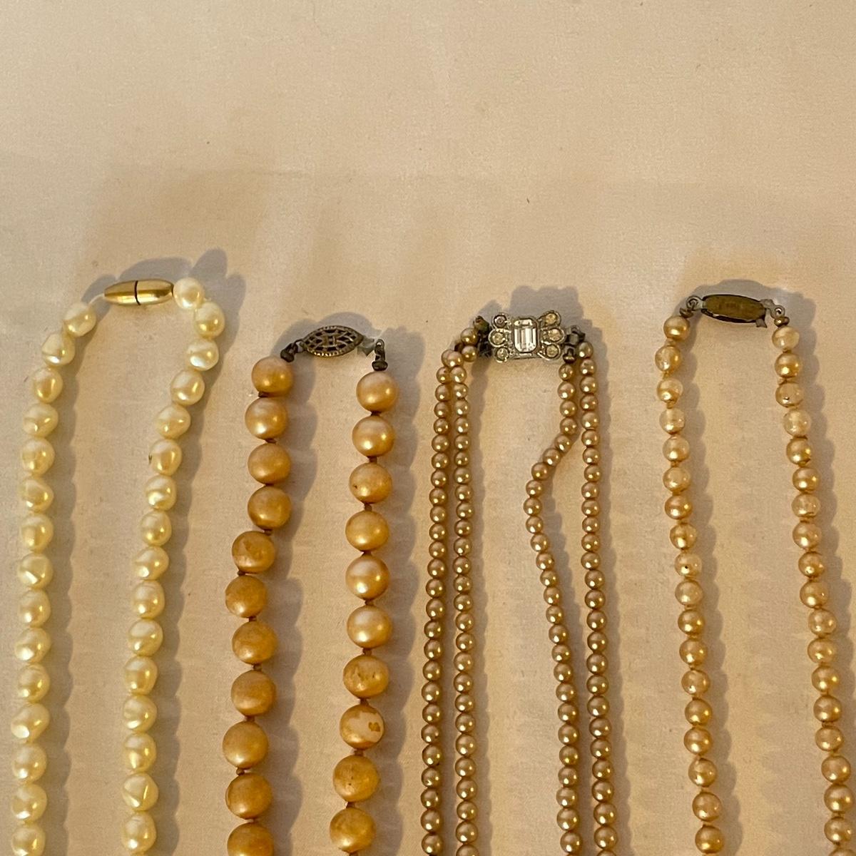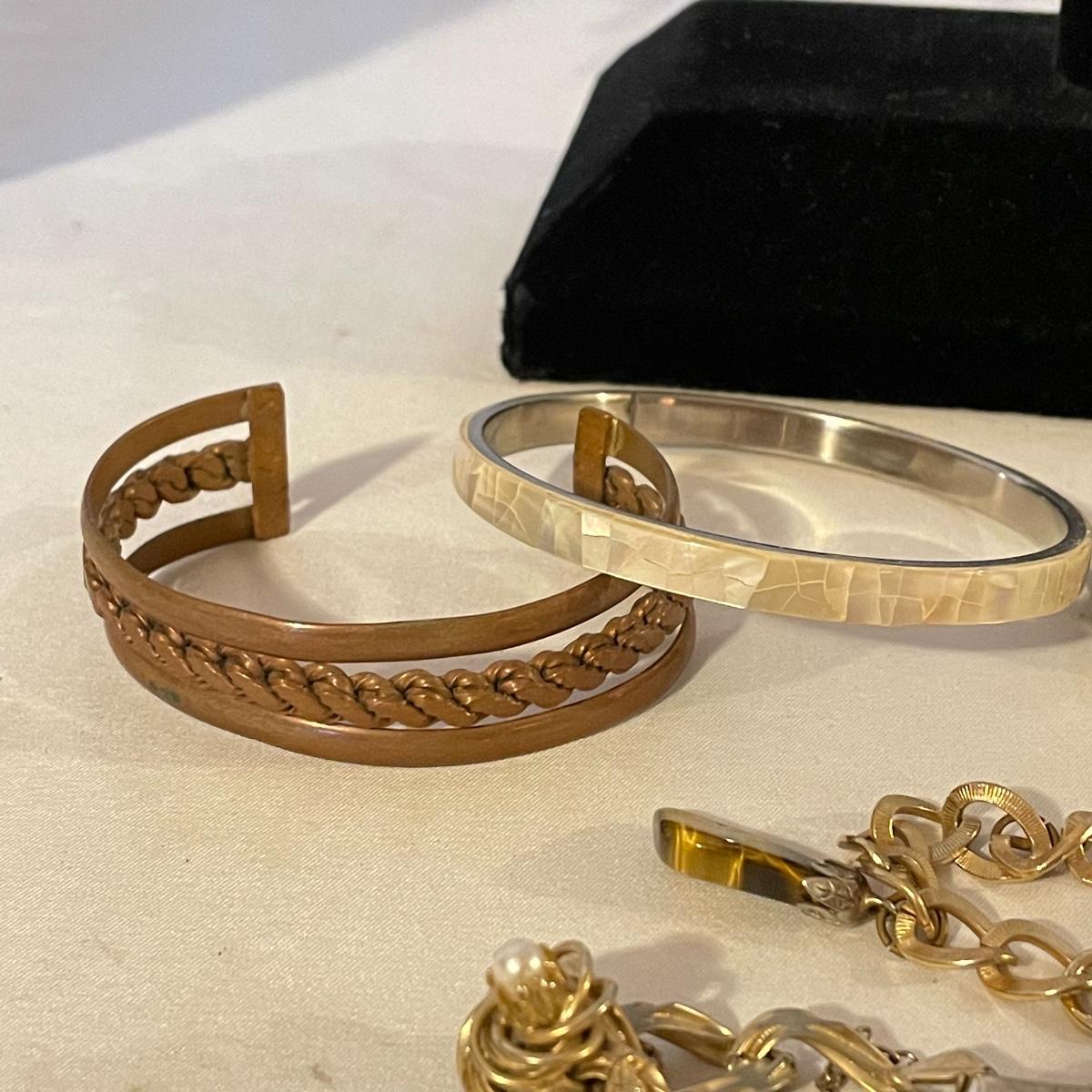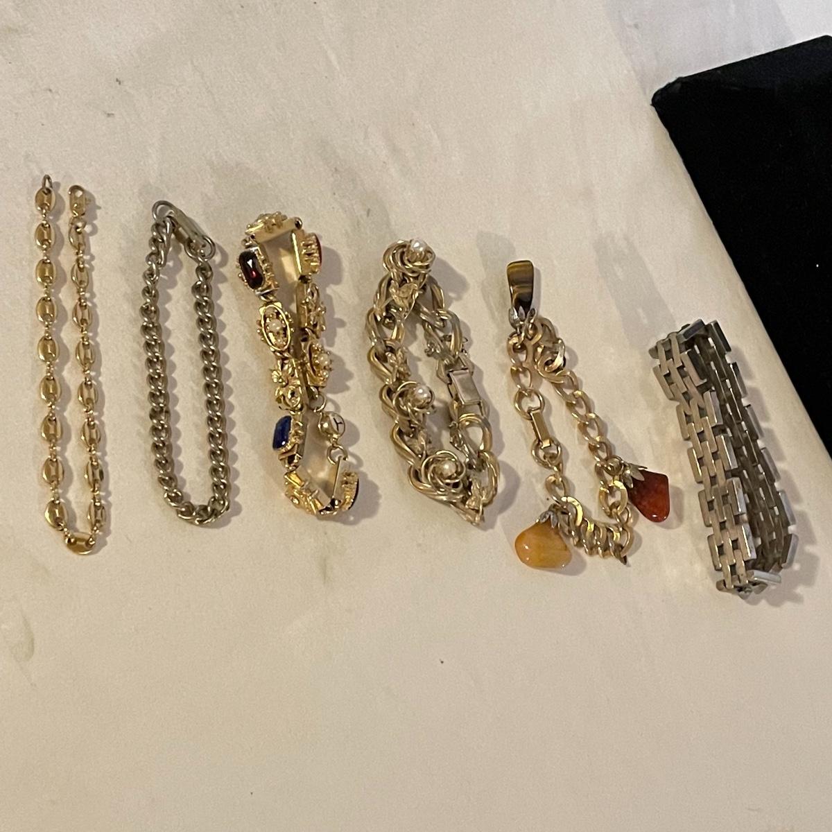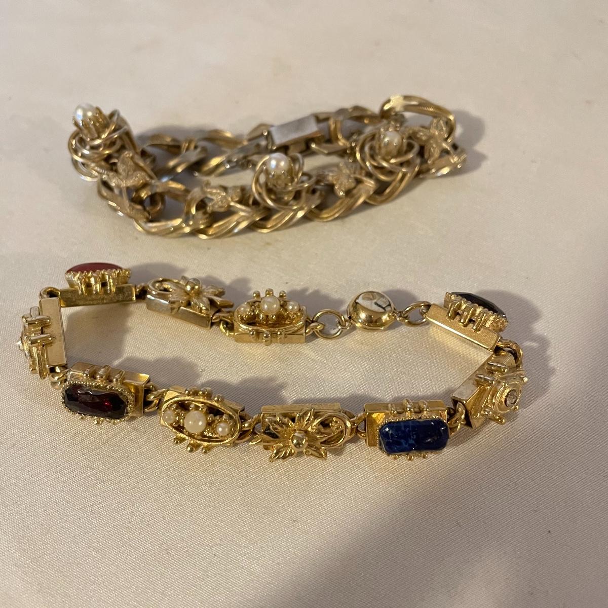 This is a classic must-have collection from everyday to elegant. Selection includes twenty four necklaces with chains, pearls and shells. All known clasp markings are shown in photos, with the exception of two more Germany markings on the shell necklaces. Necklaces range from 16” to 56” Lot features older and newer pieces and even a perfume #1 pendant. This collection also offers a variety of over fifteen bracelets, all metal with stone, bead, charms and more. Lastly, brooches, lingerie clips and an adorable frog hat pin. See images. Shipping available.