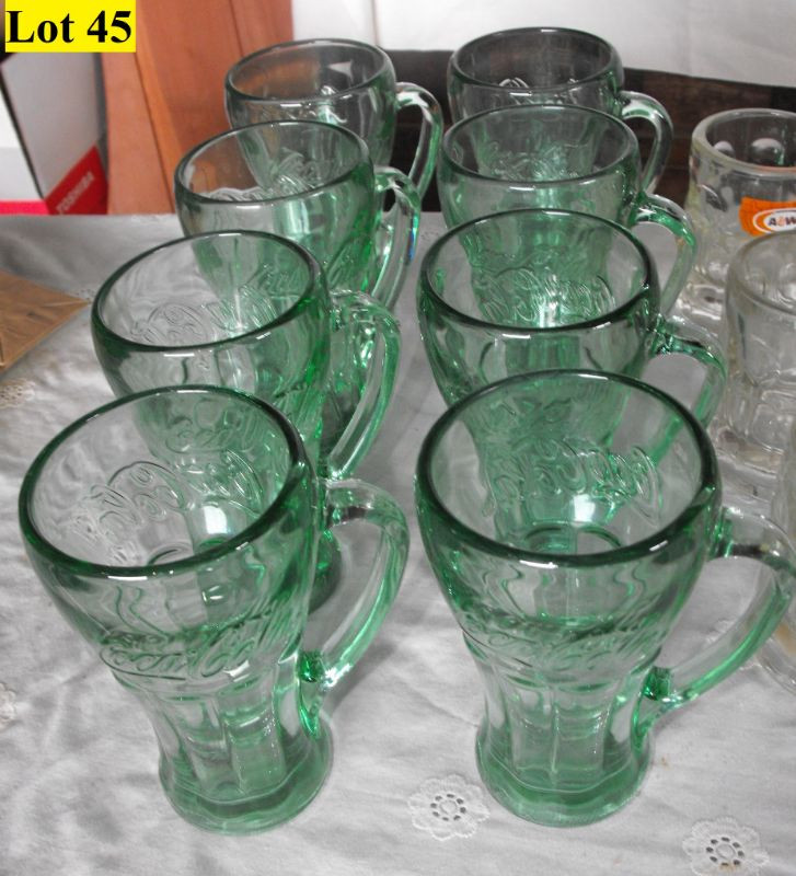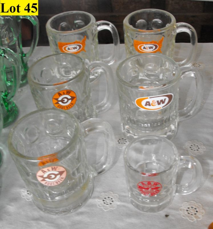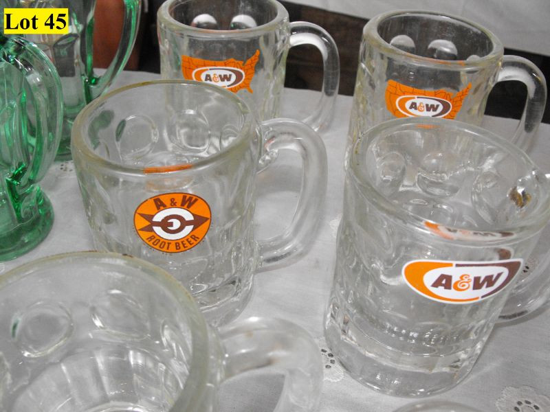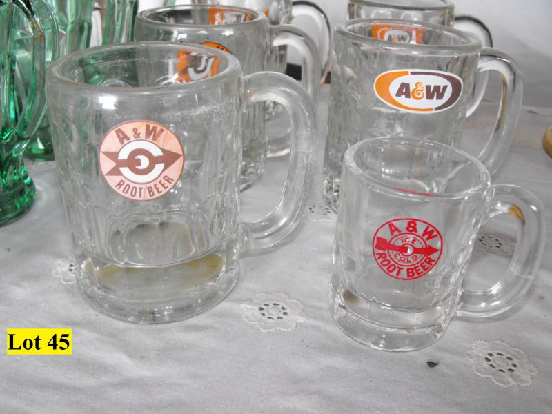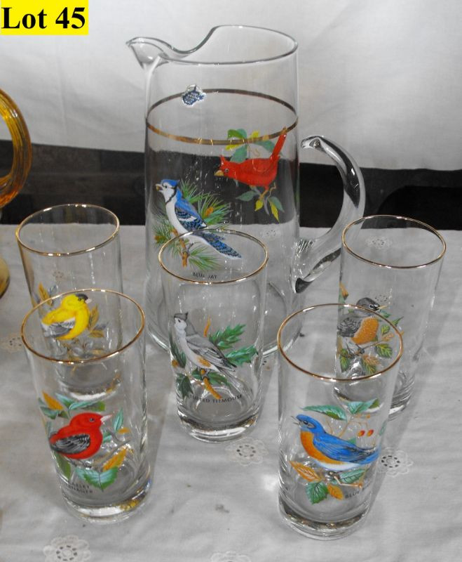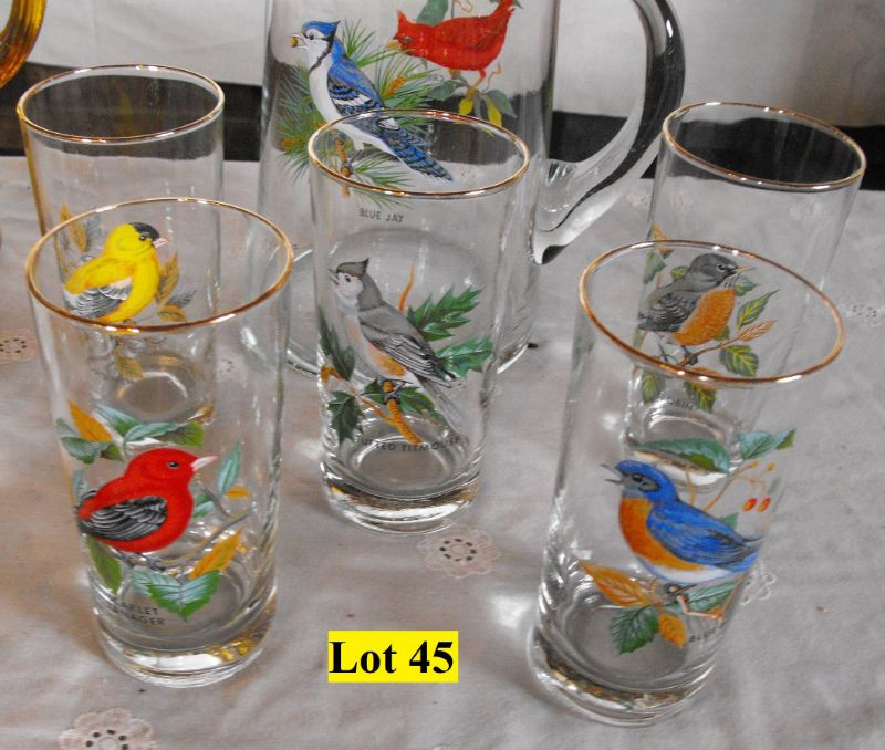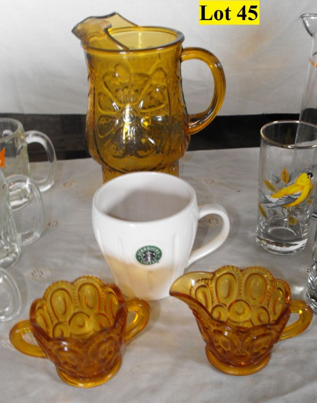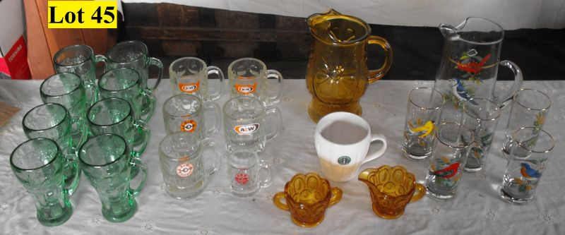 8 Coca Cola Thick Handled Drinking Glasses, 6 Vintage A & W Mugs, Starbucks Mug, Gold Glass Cream and Sugar plus Gold Glass Pitcher. Set of 5 Bird Drinking Glasses and Matching Pitcher