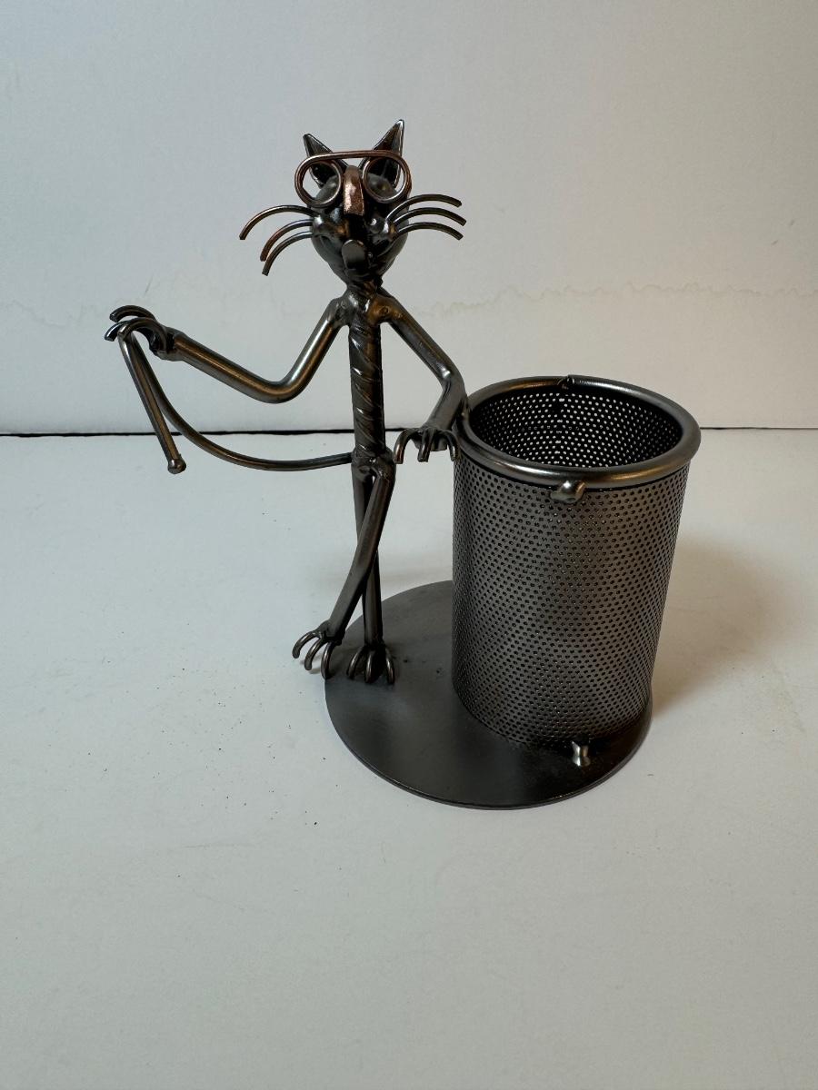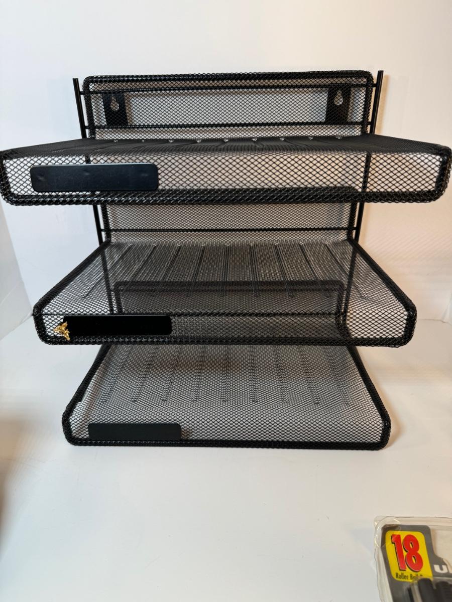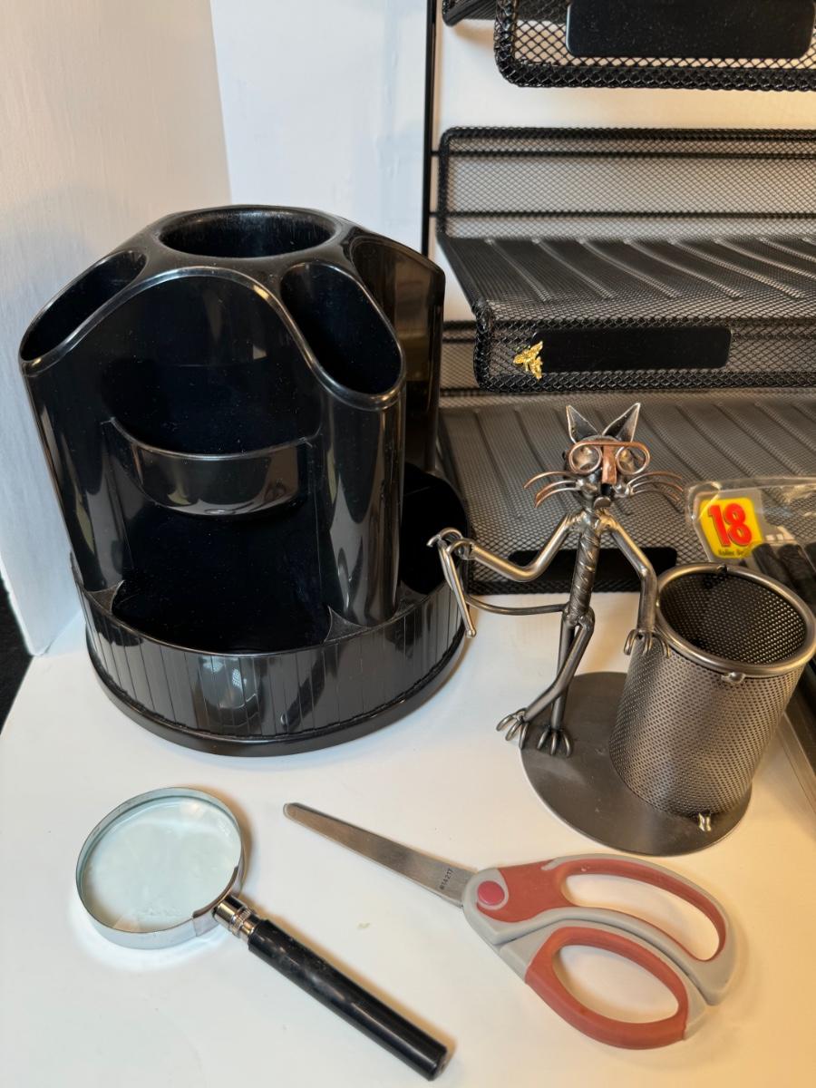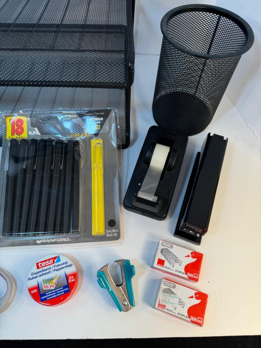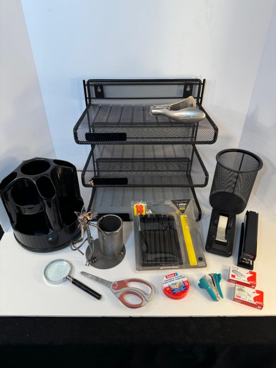 Includes 3 tier desktop black mesh metal horizontal file sorter, matching pen/scissor holder, black plastic spinning organizer with pair of scissors, Ponte #798 stapler, Swingline model #37201 stapler remover, magnifying glass, tesa double sided tape, 26/6 mm staples, and a metal cat pen holder.