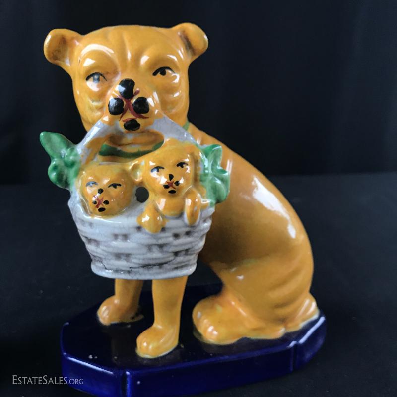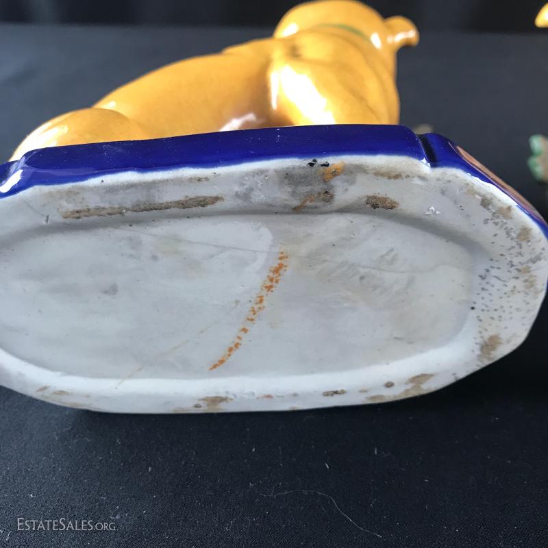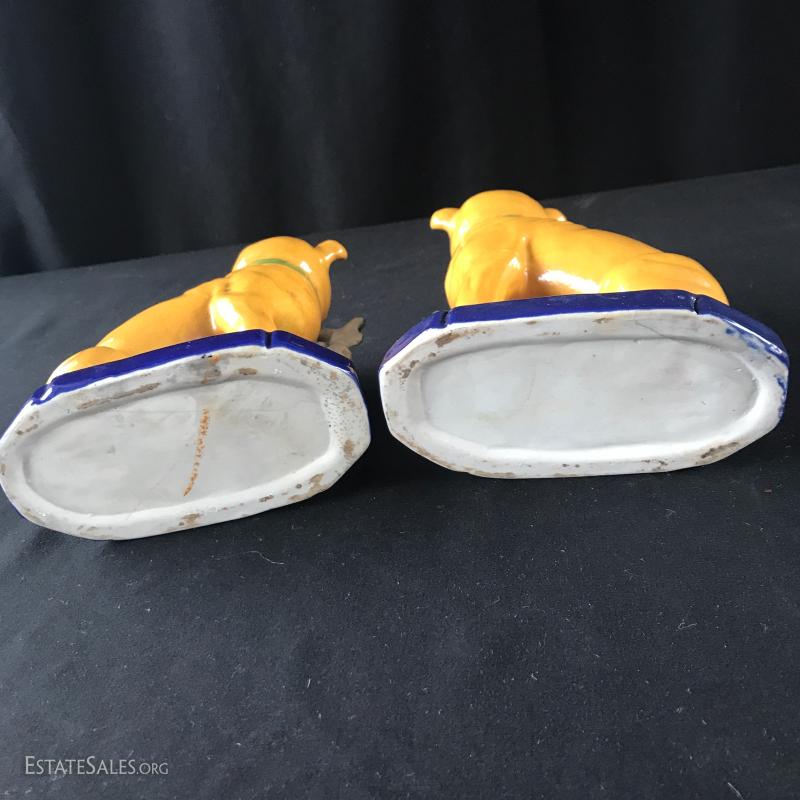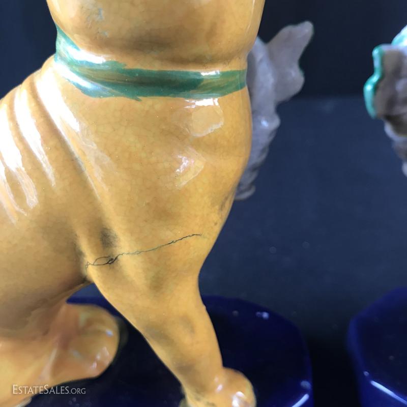 Foo dog-like ceramic bookends. Excellent mustard yellow and blue colors will brighten your bookshelf. Slight glaze crackling on one with small crack on base that does not effect sturdiness. See pic. 5”l x 3.5”w x 6”tall. Shipping available or local pick up in Asheville, NC.