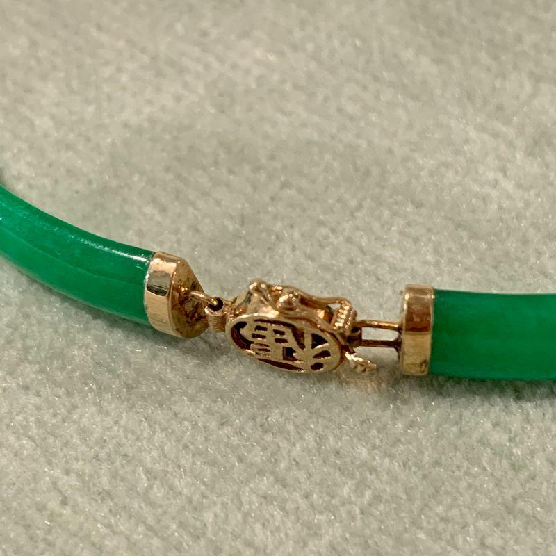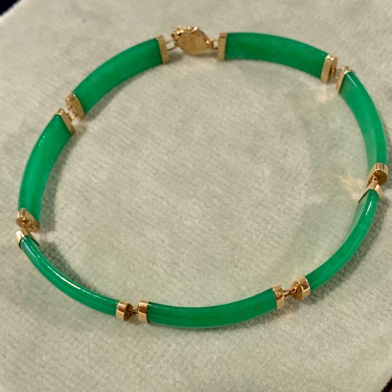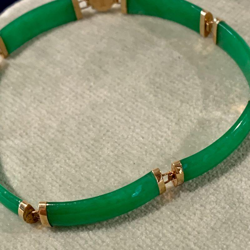 Curved bands of green jade capped with 14K gold & 14K gold clasp. 8" long. 3/8" wide.