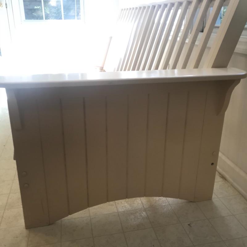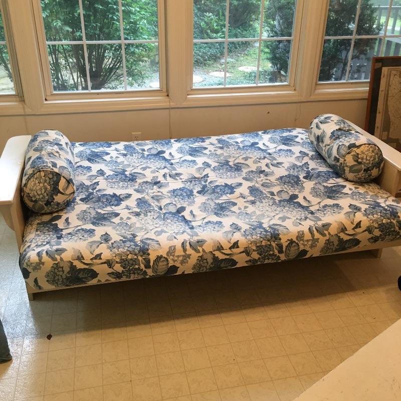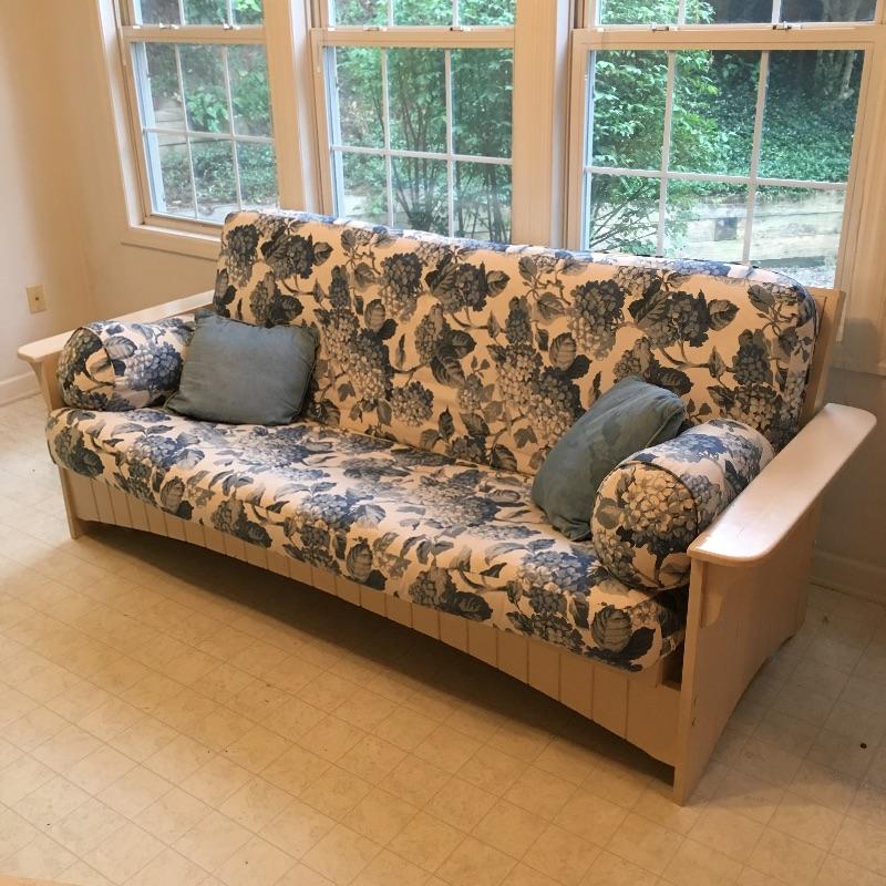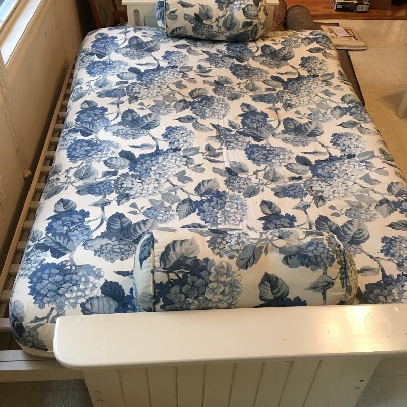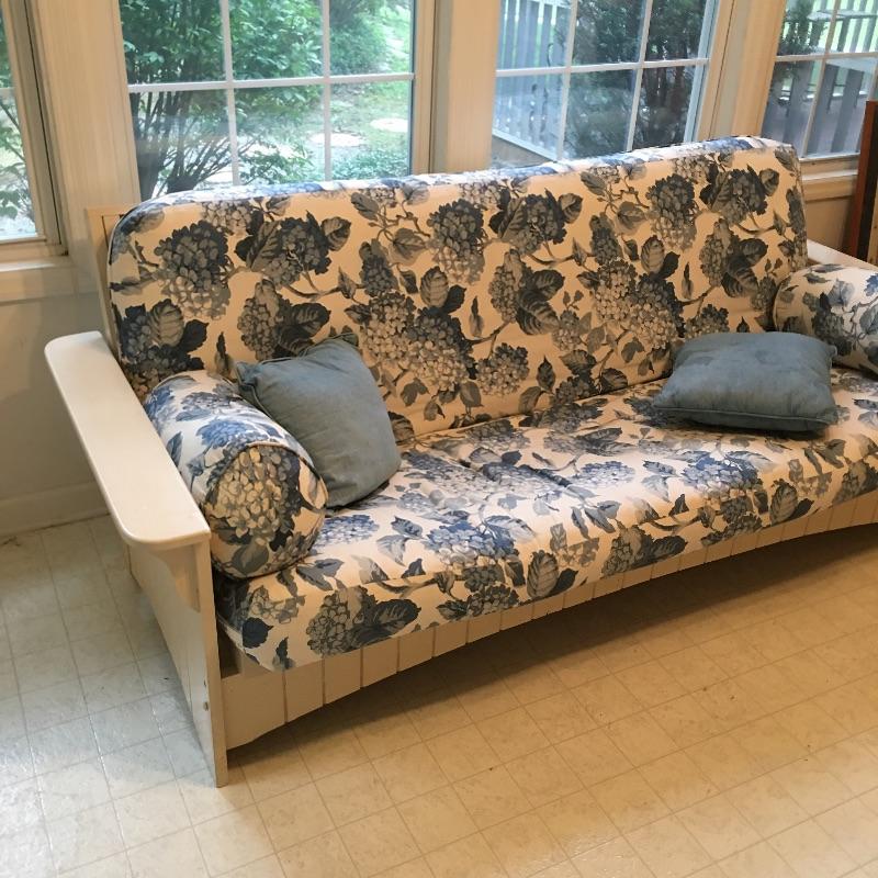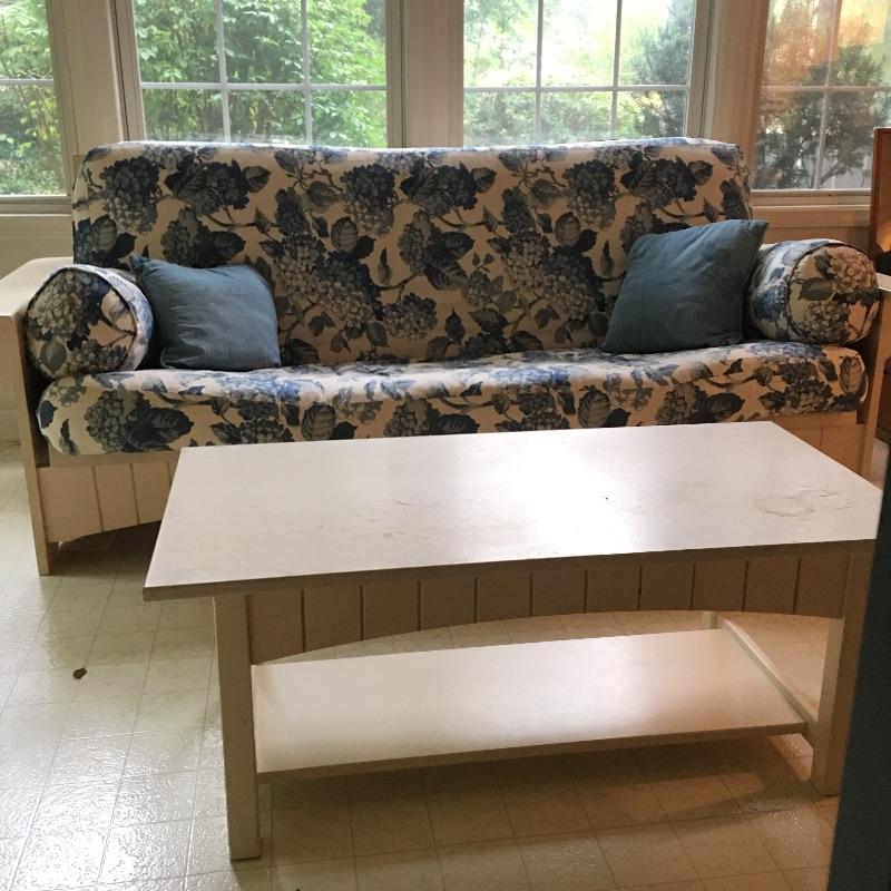 Get the New England coastal feel with this futon and coffee table. Futon measures 34” x 85” x 34” when upright and 53” x 85” x 23” when open. The coffee table measures 42” x 21” x 17”. This lot matches lots 39 and 135. Futon cover has stains and table has wear on top, see pictures.