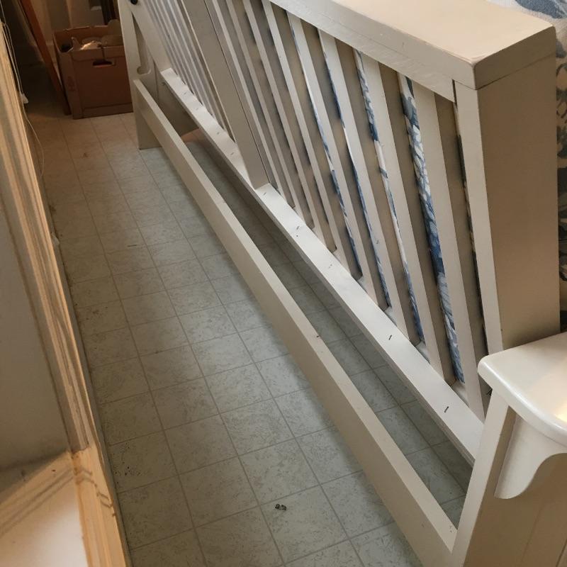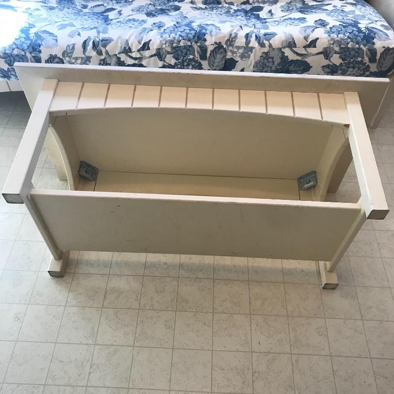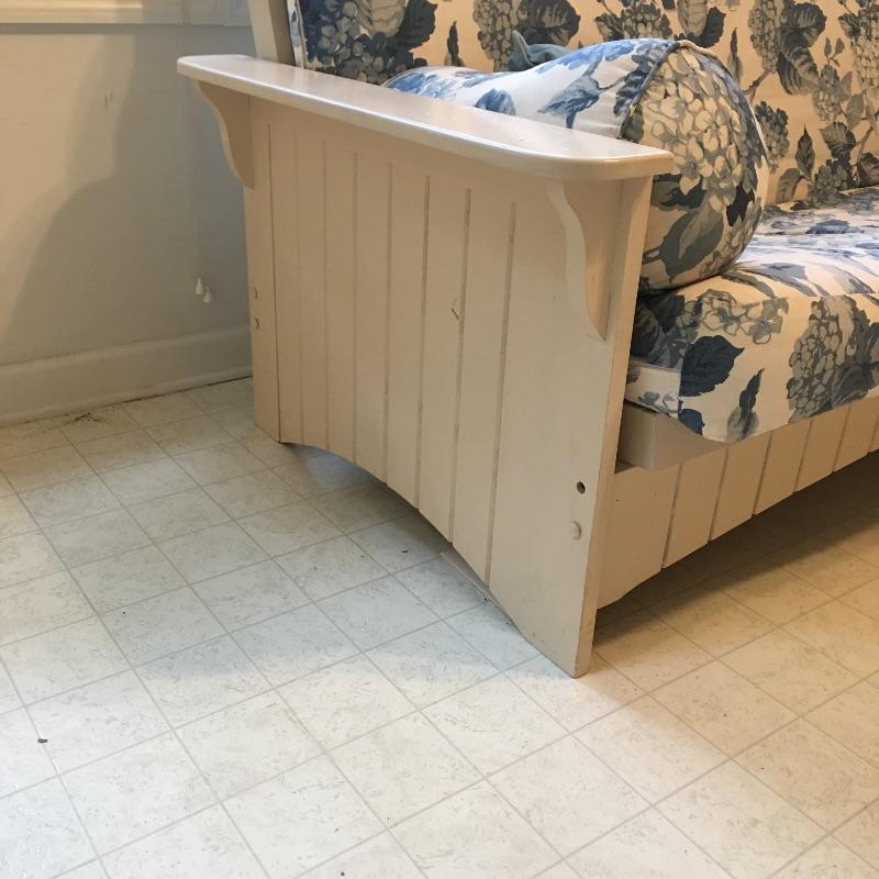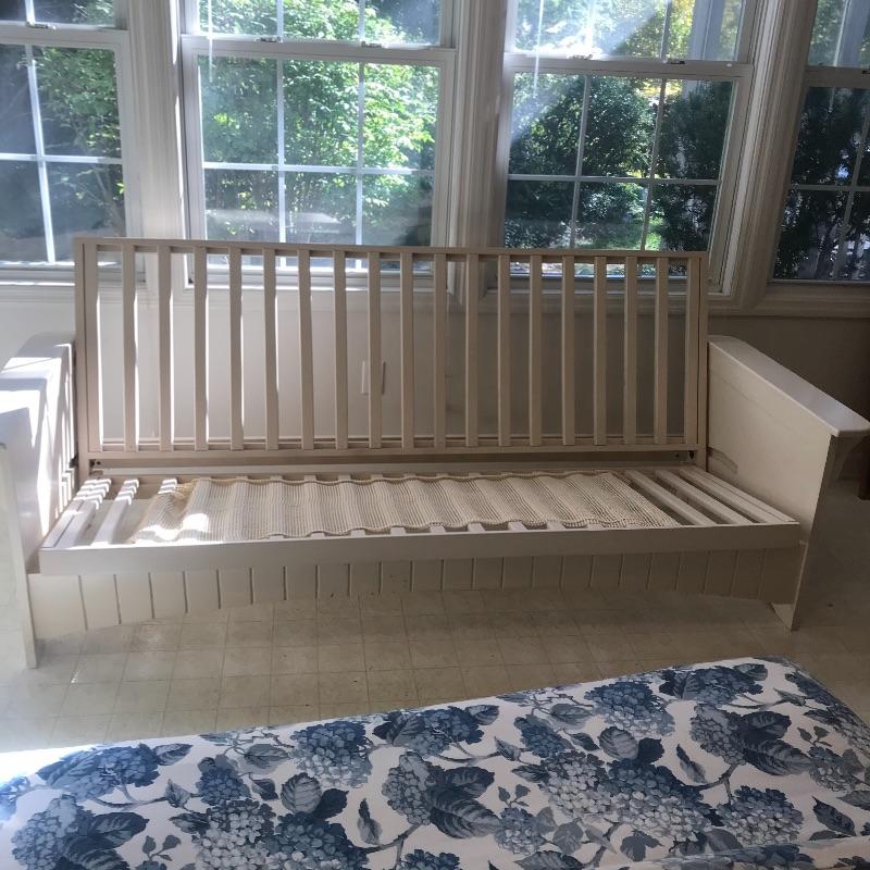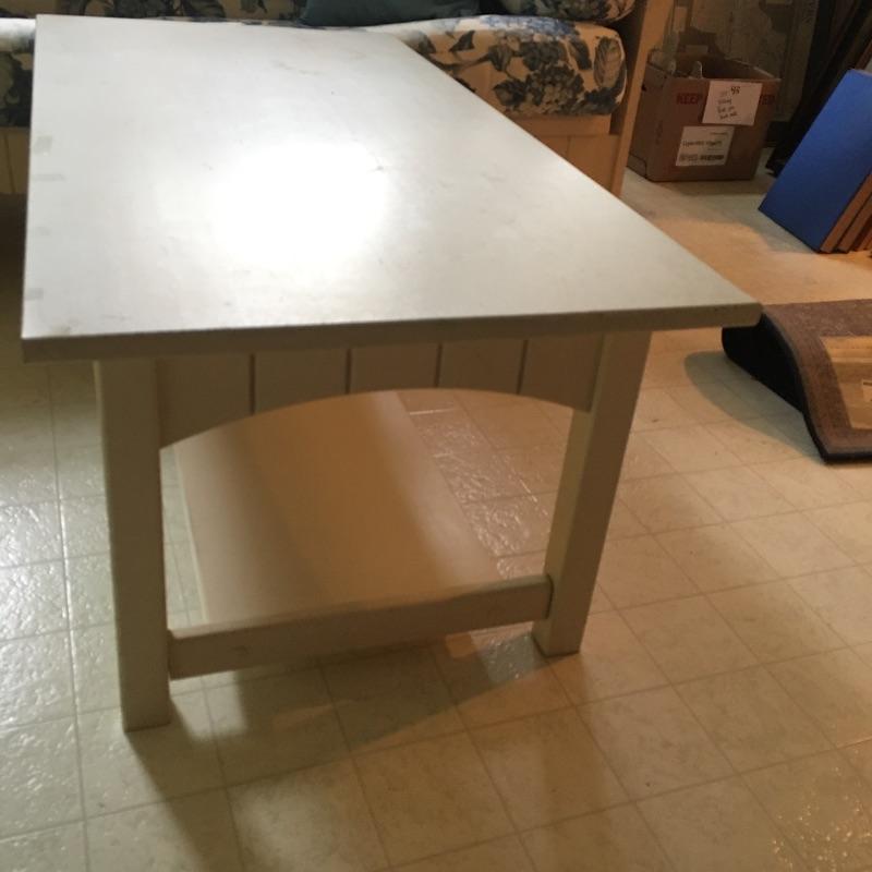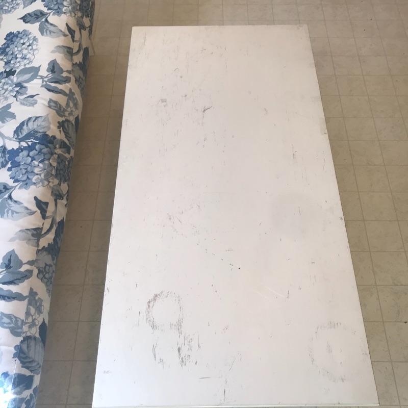 Get the New England coastal feel with this futon and coffee table. Futon measures 34” x 85” x 34” when upright and 53” x 85” x 23” when open. The coffee table measures 42” x 21” x 17”. This lot matches lots 39 and 135. Futon cover has stains and table has wear on top, see pictures.