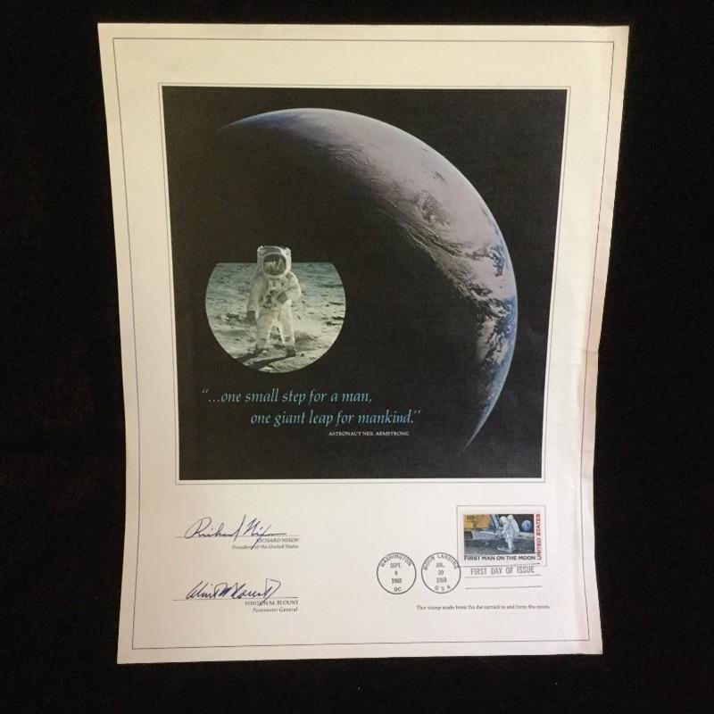 A commemorative Stamp signed by Richard Nixon in celebration of the moon landing by Neil Armstrong. Stamp is marked with dye carried to and from the Moon.