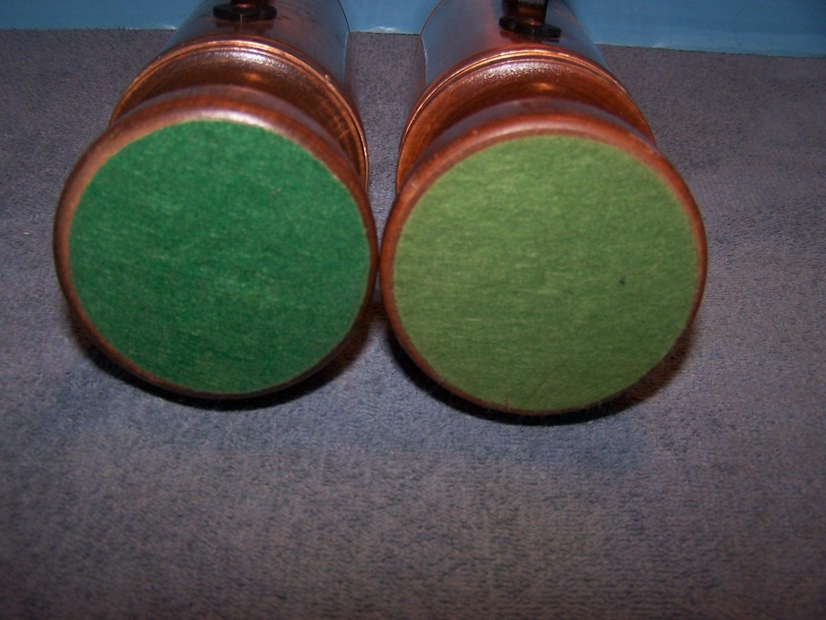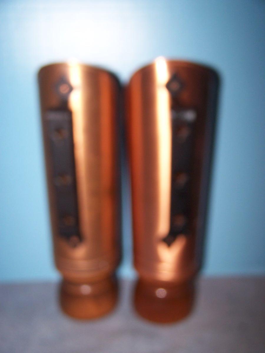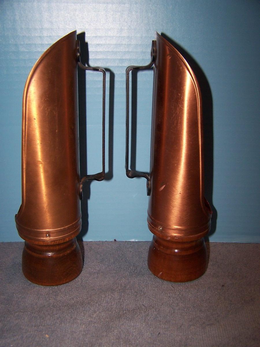 THESE ARE A GREAT PAIR OF MID-CENTURY MODERN COPPER WOOD TALL CANDLEHOLDERS... UNMARKED.... THEY ARE 10 1/2'' TALL... THEY NEED A GOOD BATH... THEY HAVE SOME SMALL DARK SPOTS, SEVERAL DINGS, GENERALLY, IN GOOD CONDITION... GREAT LOOKING!!!