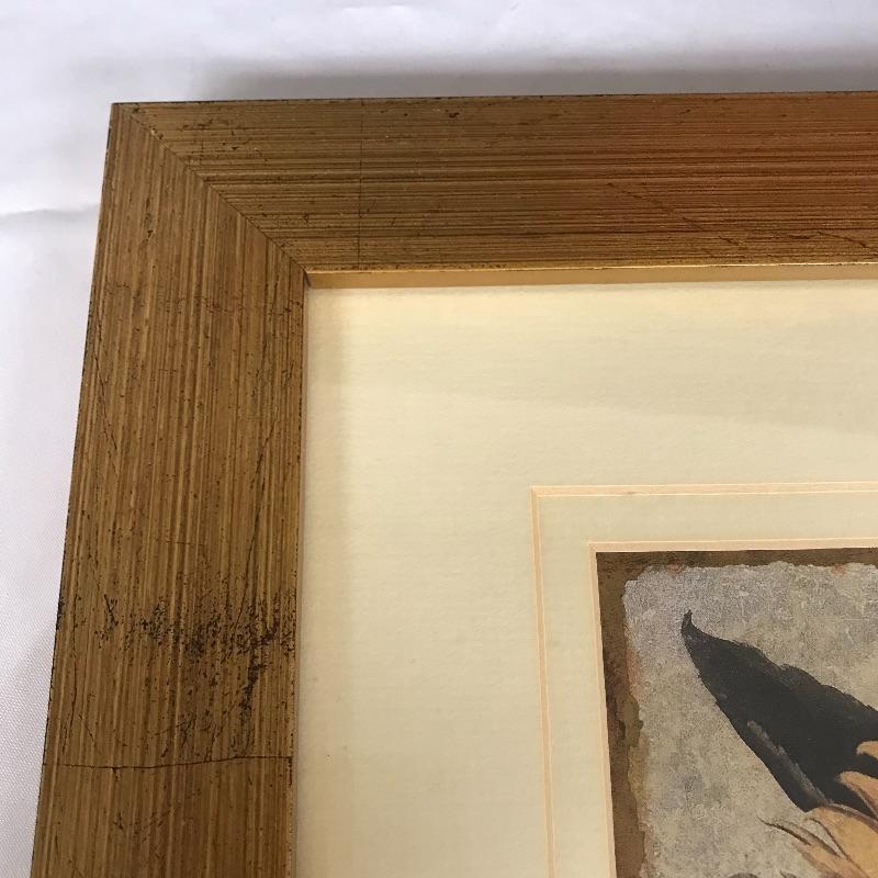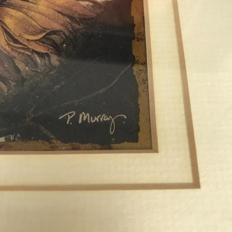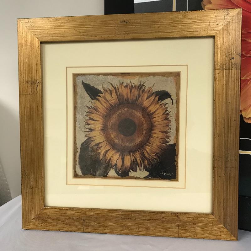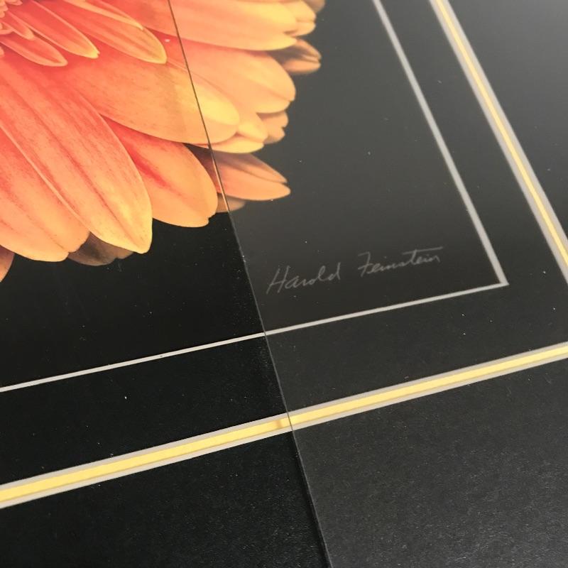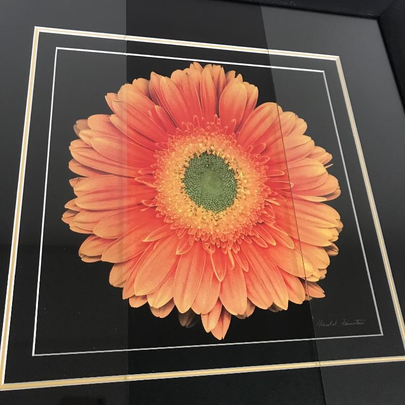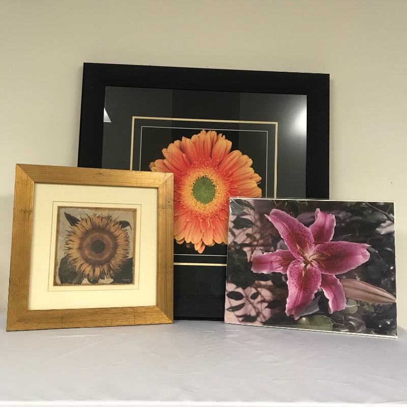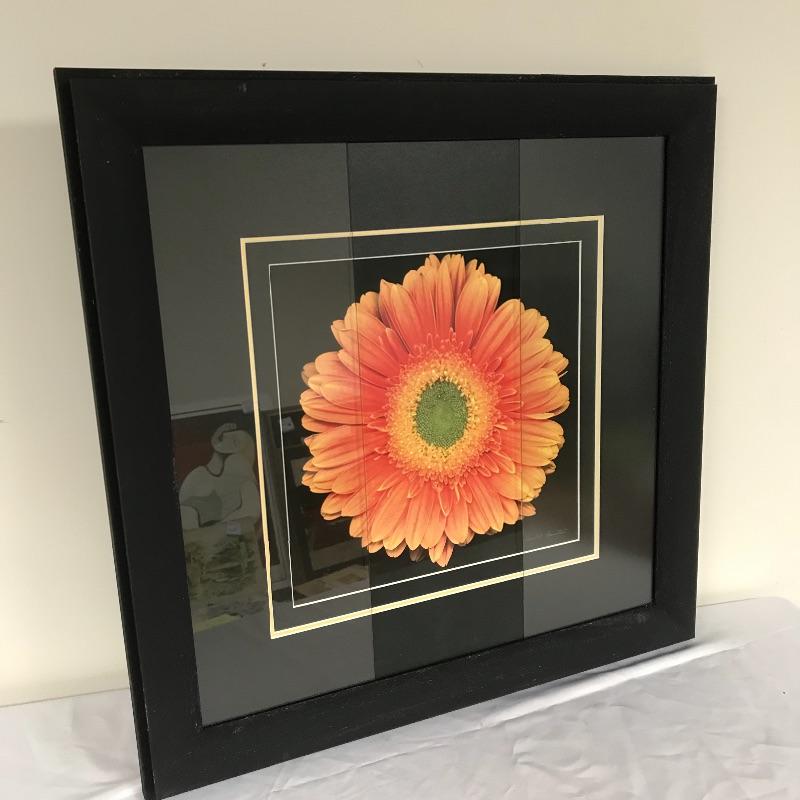 Three pieces of floral art. The Harold Feinstein signed large orange flower piece has a unique three panel glass in a man-made textured black frame. The middle panel appears to be low-glare while the outer two pieces with a higher gloss finish. Frame measures about 23.25”sq. Lot features a smaller gold painted wooden frame measuring 13”sq of a Sunflower by P. Murray. This art is matted and behind glass. Lastly, an unframed 11” x 14” photograph with artist David Koll information on a loose pamphlet in its protective plastic sleeve.