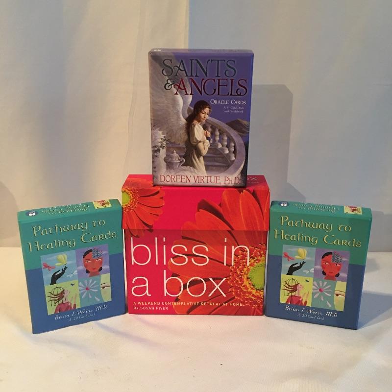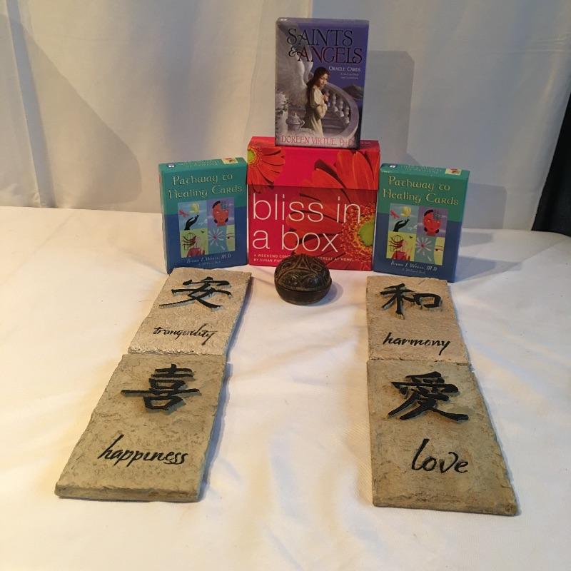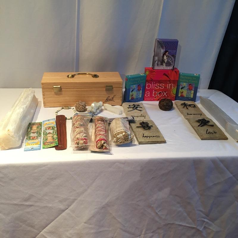 Lot includes a great collection of healing crystals, necklace, sage, healing cards, incense with wooden burner, four Asian wall Hangings, ladybug dish with lid and a collection of Bach floral remedies in a wooden box, the floral remedies have expired soma have lost their properties.
