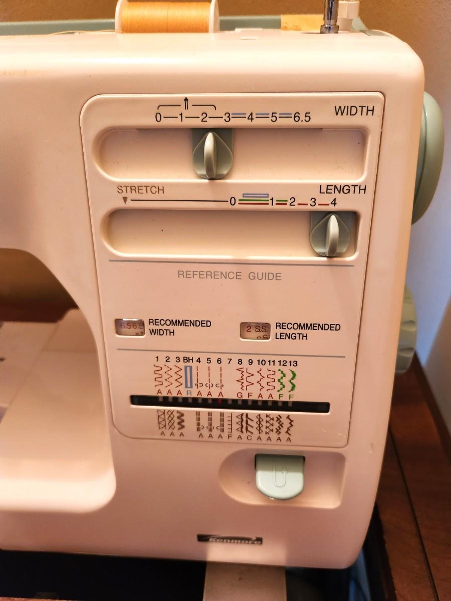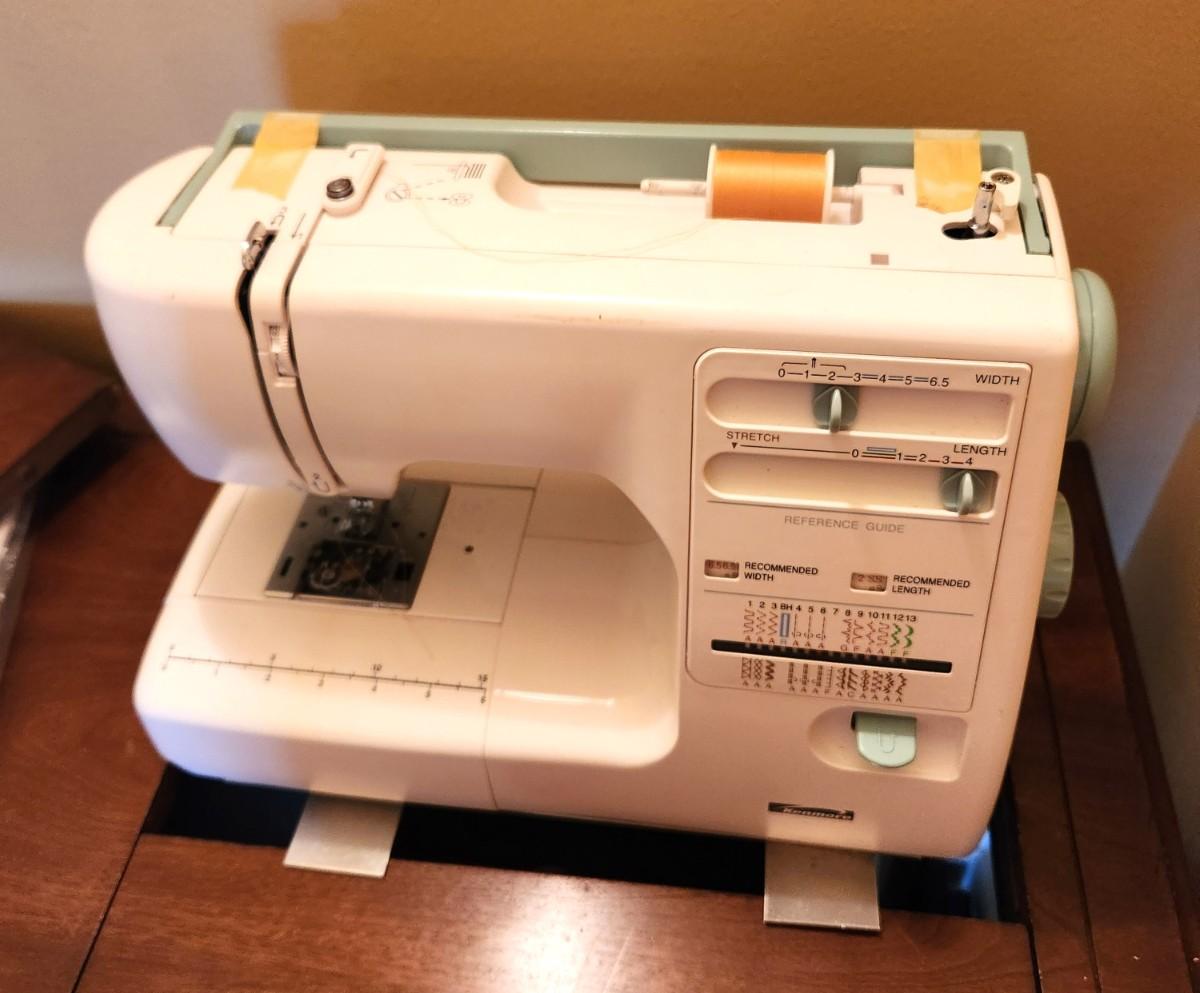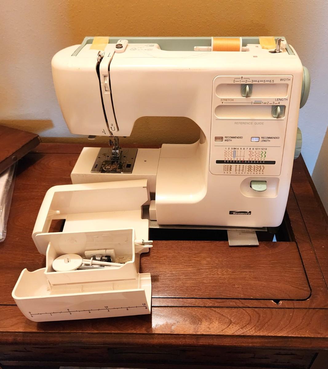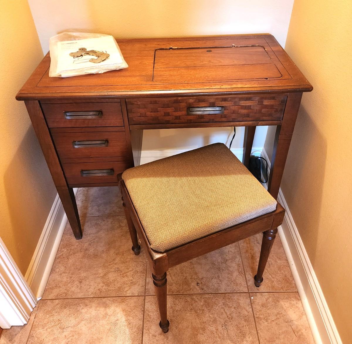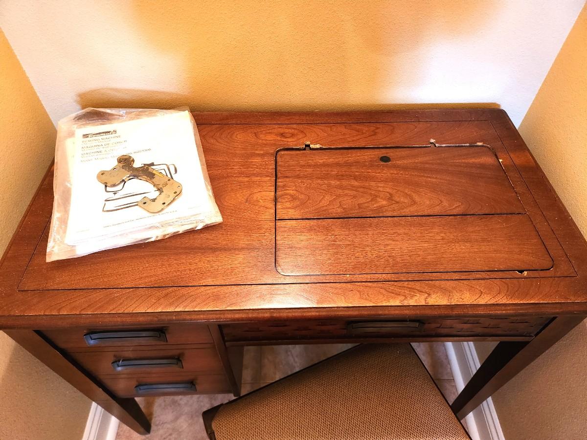 Kenmore Sewing Matching remounted in Mid Century modern Cabinet - matching bench. Has book and repair receipt dated 2007. 3 feet across, 30" tall, 19" deep. Please view all photos.