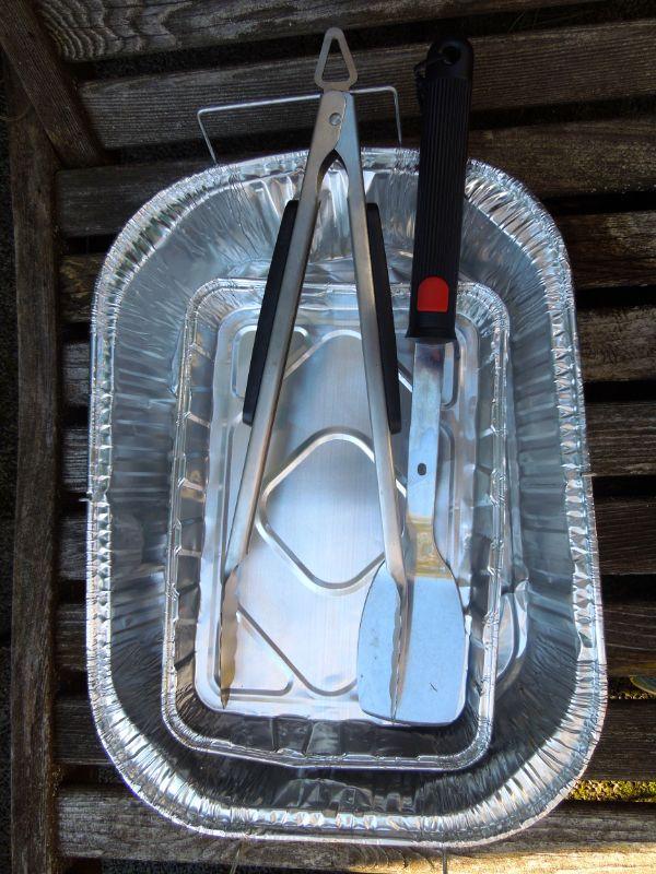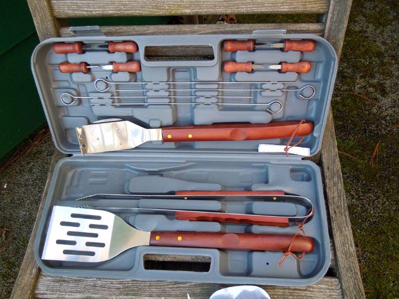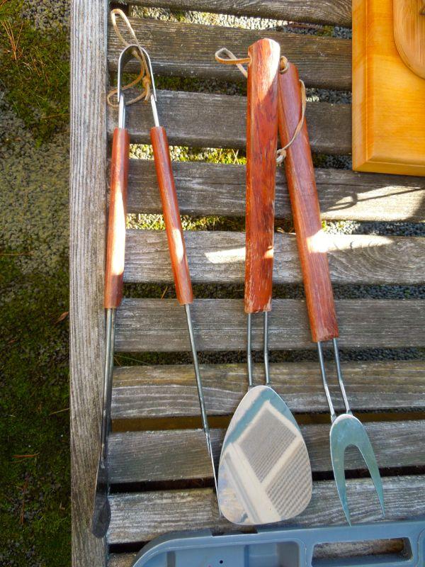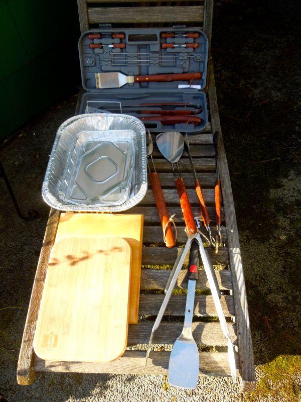 Wood cutting boards; bamboo cutting board; 3 aluminum roasting pans; large set of grill tools in case; 2 tongs; 2 spatulas; 1 grill fork. Clean.