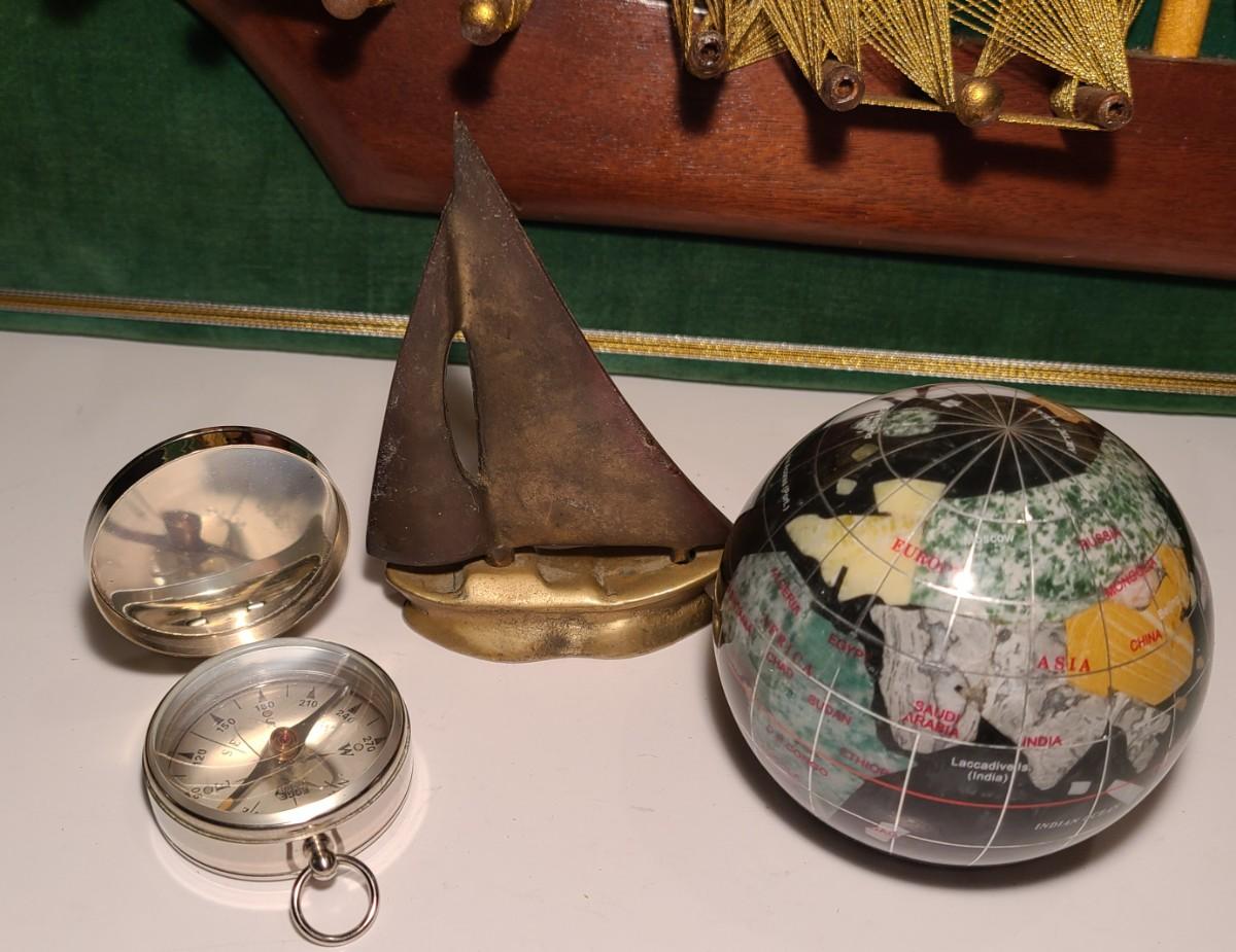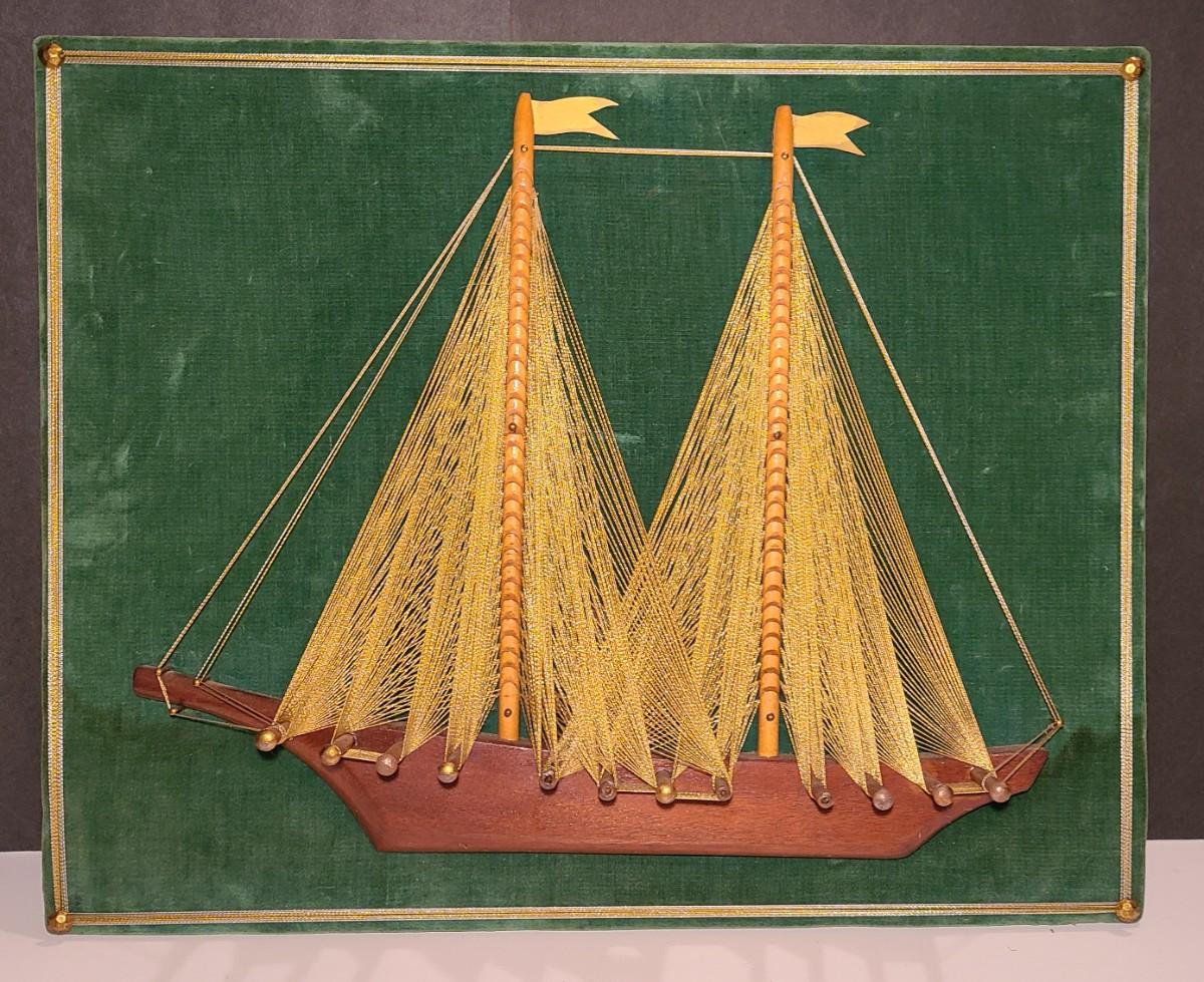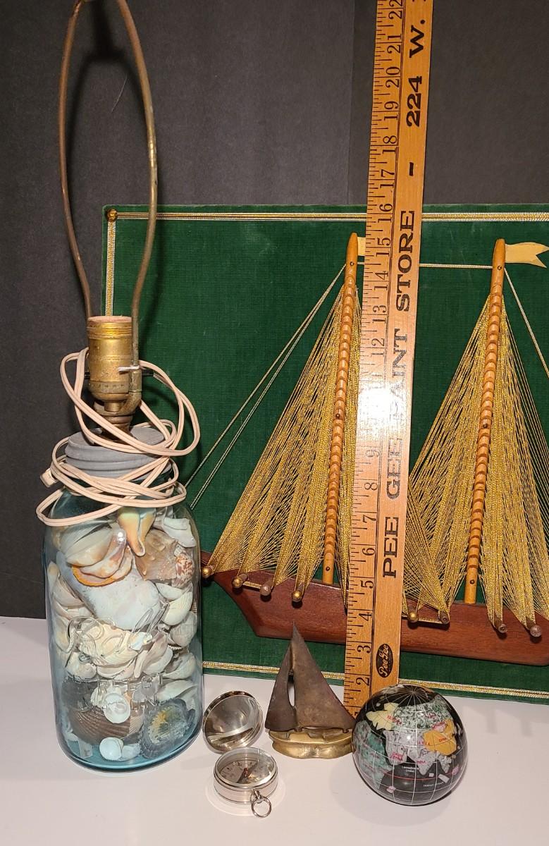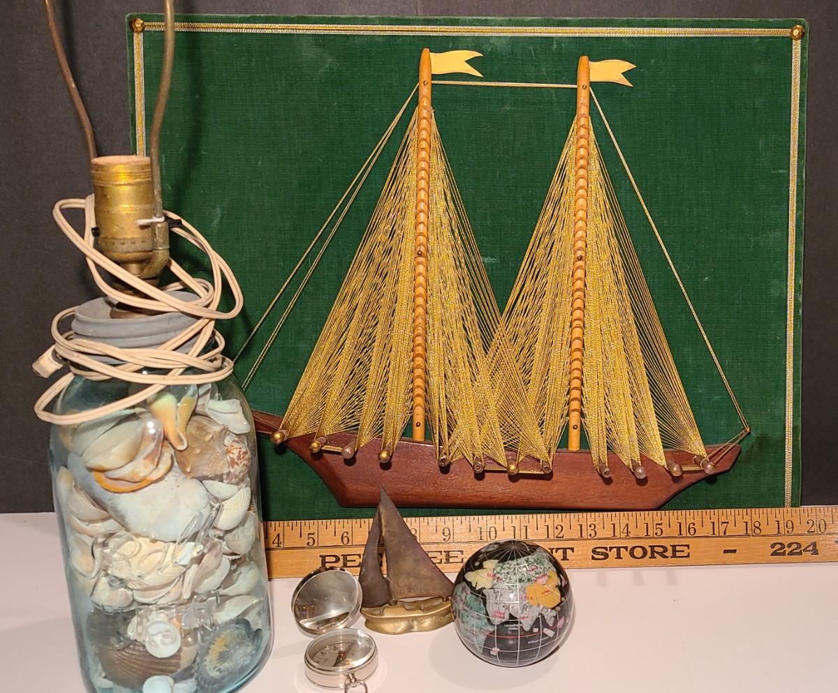MCM green velvet artwork made of string and teakwood of ship, Blue Ball Jar seashell lamp, brass ship figurine, compass and more. Please see all pictures for content of the lot, condition of the lot, and measurements if taken. Pictures are the best representation of the items listed and items are untested unless indicated in description. Thank you for looking and have fun bidding!