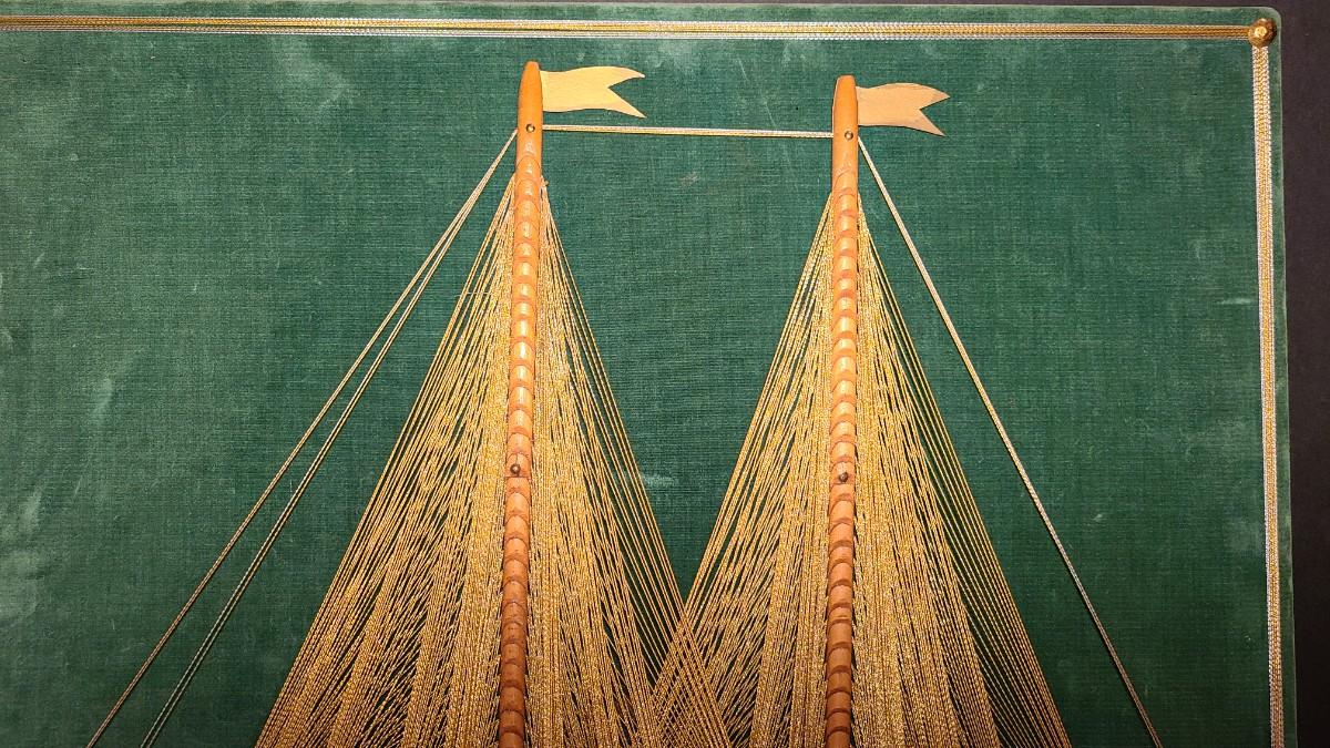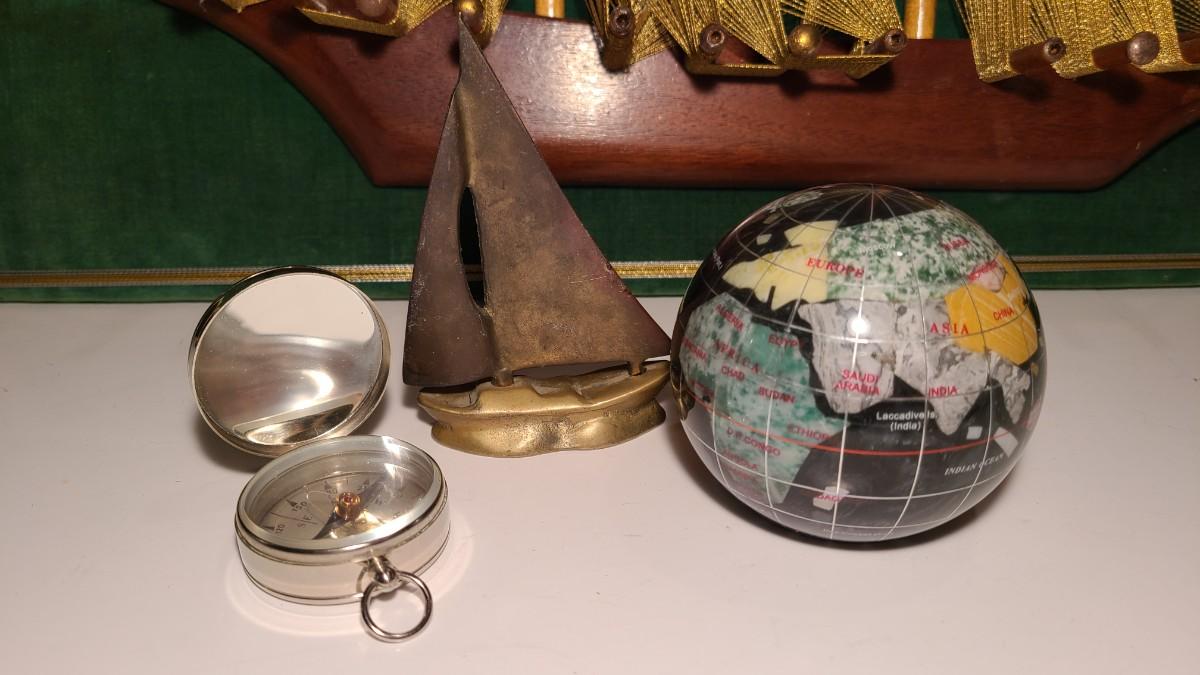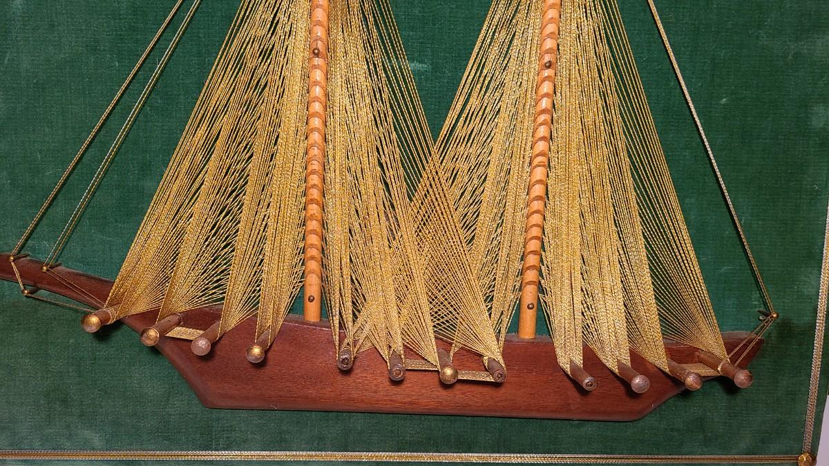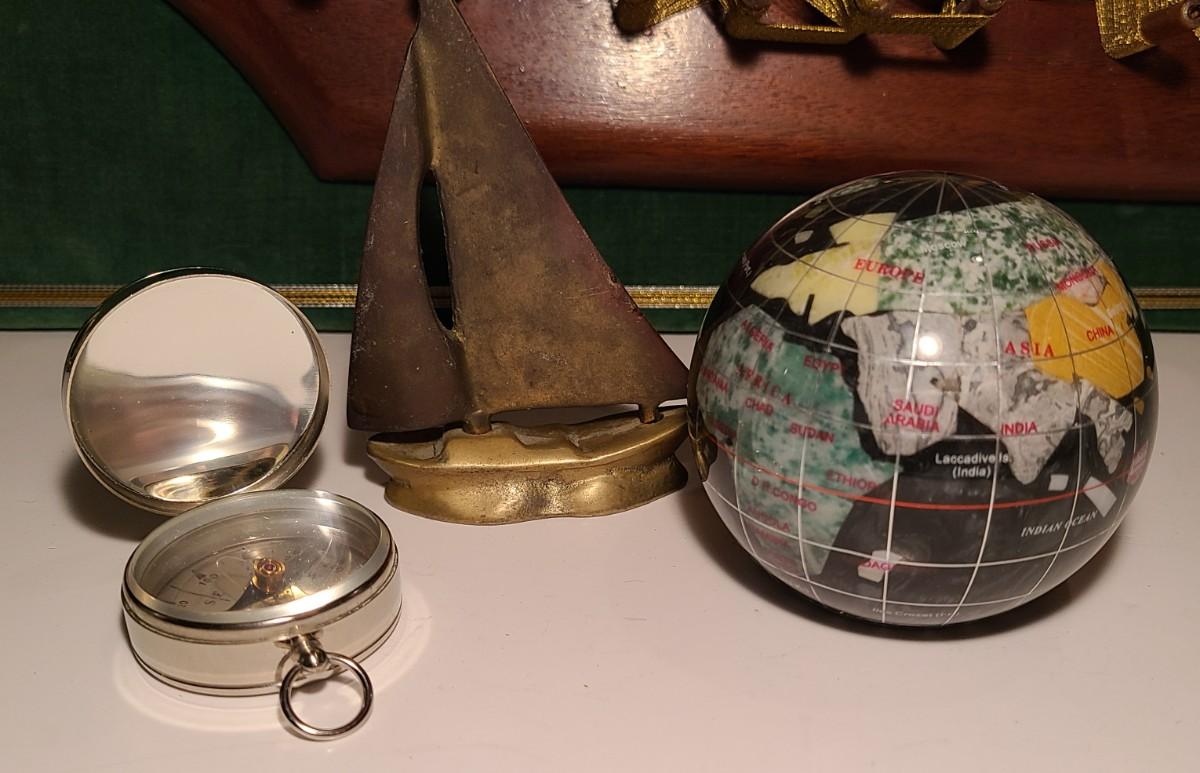 MCM green velvet artwork made of string and teakwood of ship, Blue Ball Jar seashell lamp, brass ship figurine, compass and more. Please see all pictures for content of the lot, condition of the lot, and measurements if taken. Pictures are the best representation of the items listed and items are untested unless indicated in description. Thank you for looking and have fun bidding!
