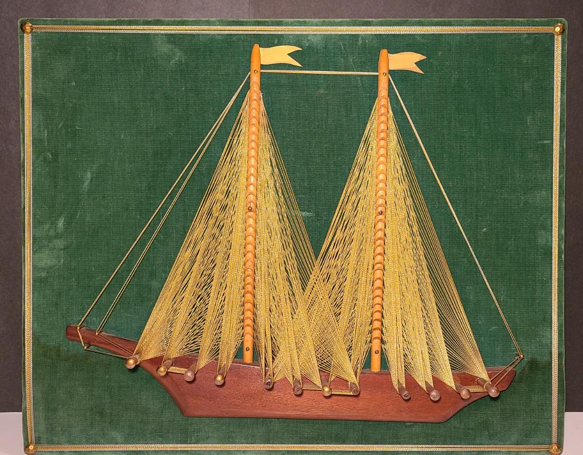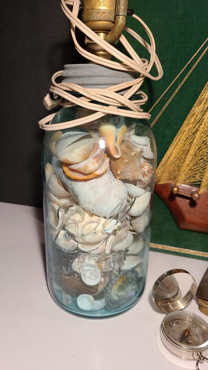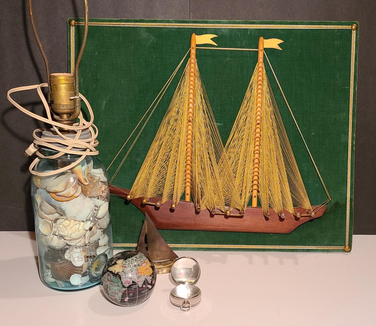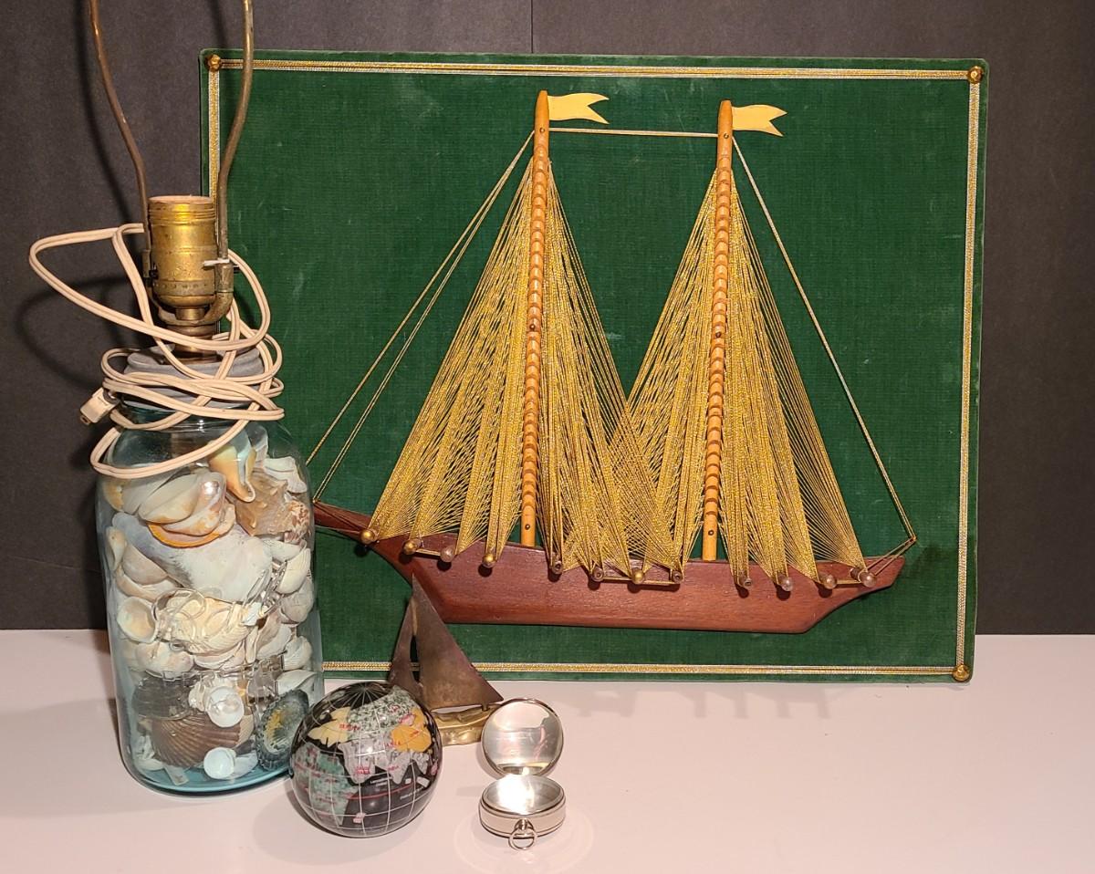 Lot 45: MCM String Art Ship, Ball Jar Seashell Lamp & More