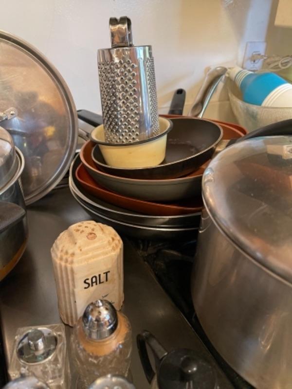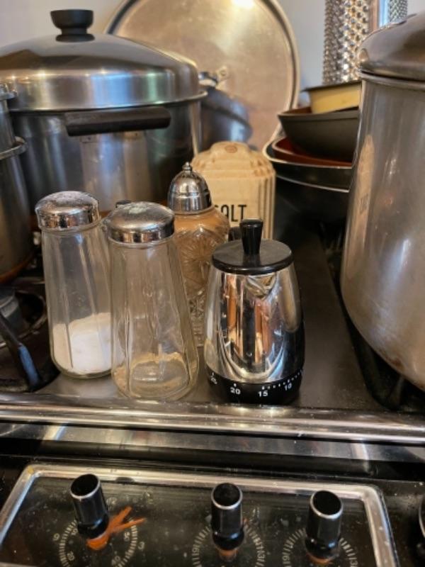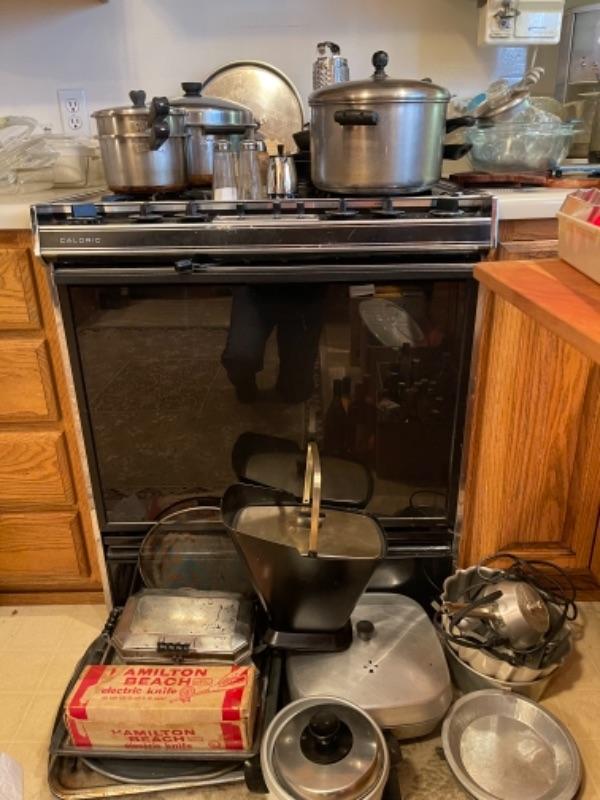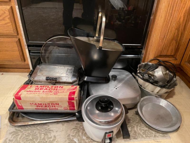 Lot 45. Mid-century West Bend ice bucket, cookware, vintage electric knife (Hamilton Beach), panini maker, baking sheets, bundt cake pans, rice cooker, double broiler--$25
