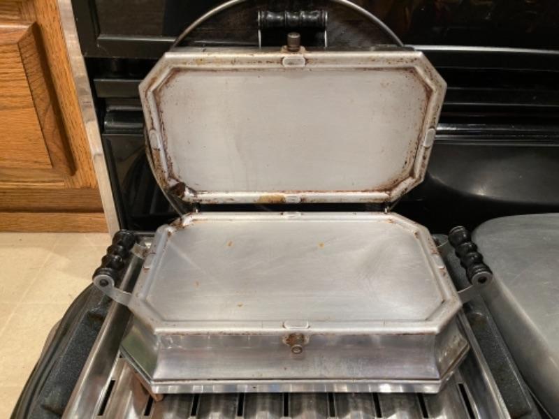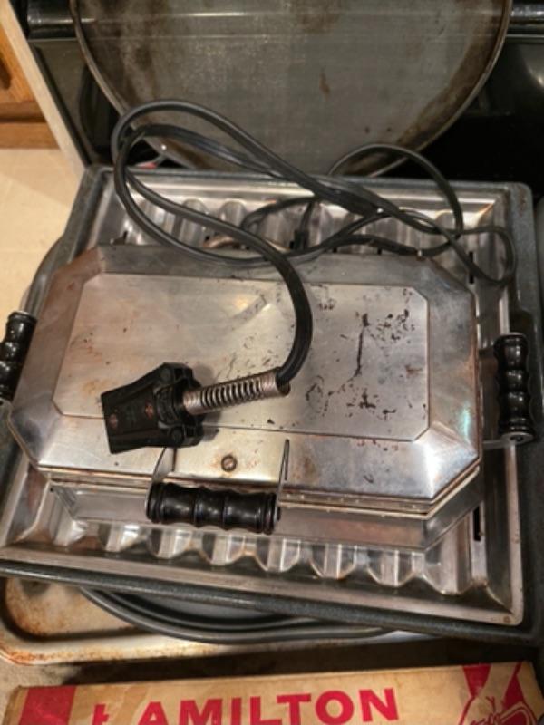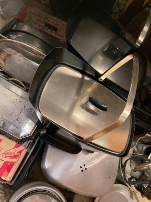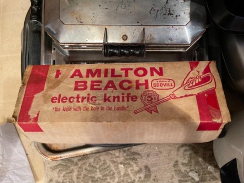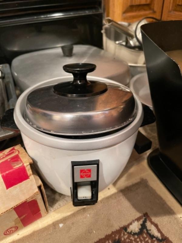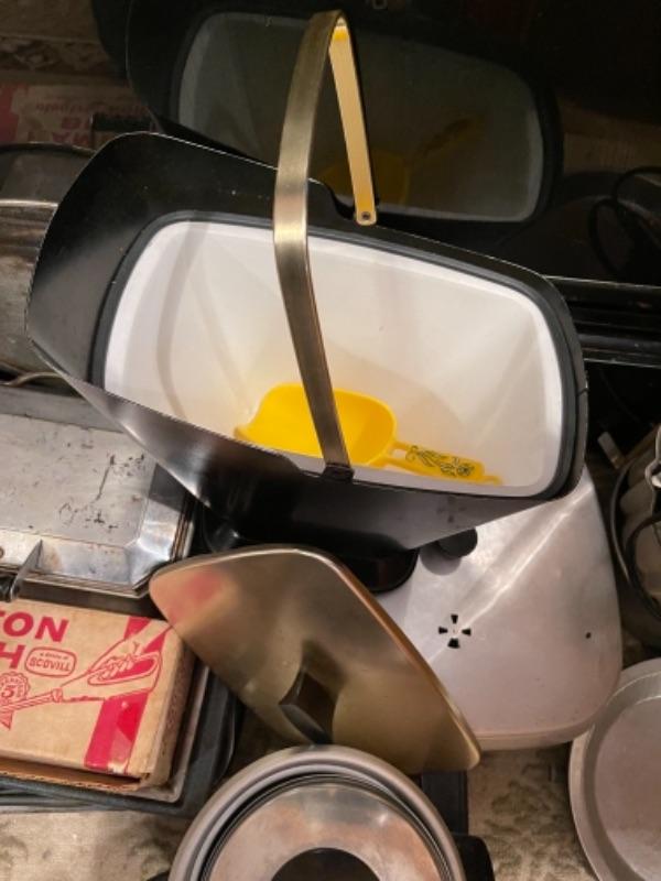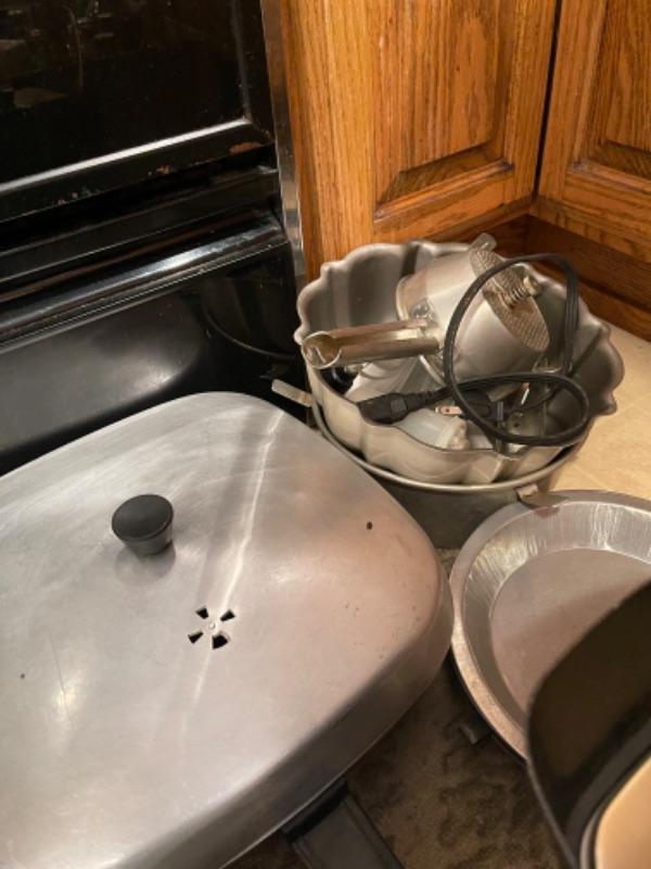 Lot 45. Mid-century West Bend ice bucket, cookware, vintage electric knife (Hamilton Beach), panini maker, baking sheets, bundt cake pans, rice cooker, double broiler--Was $55 - - Now $25