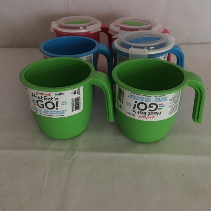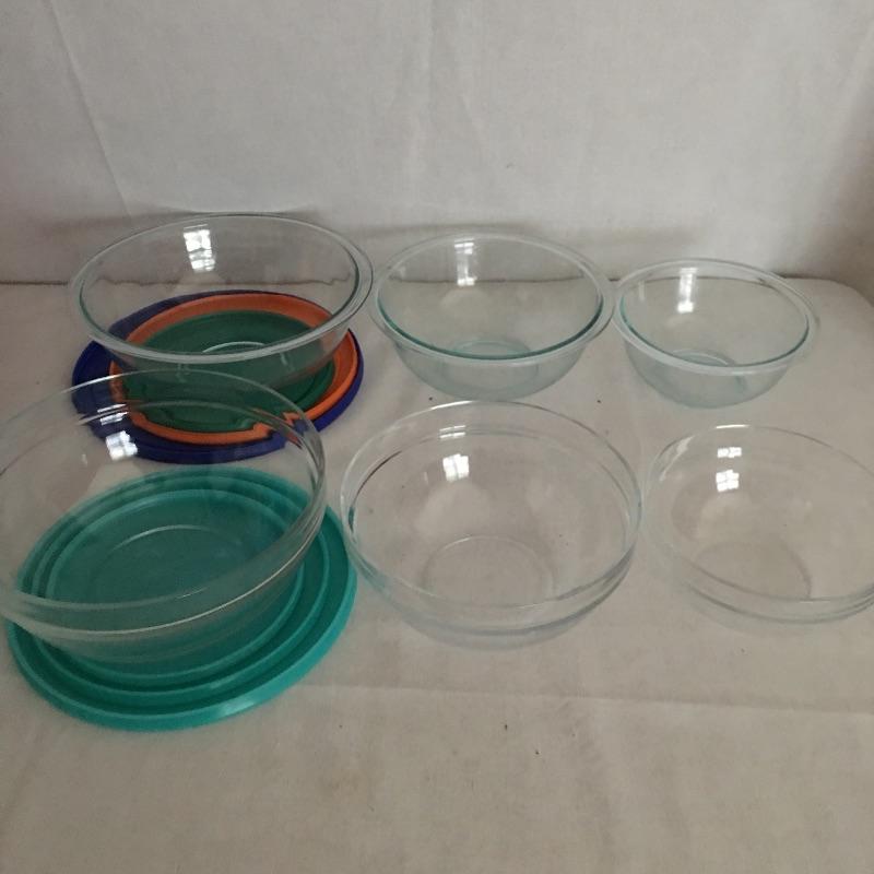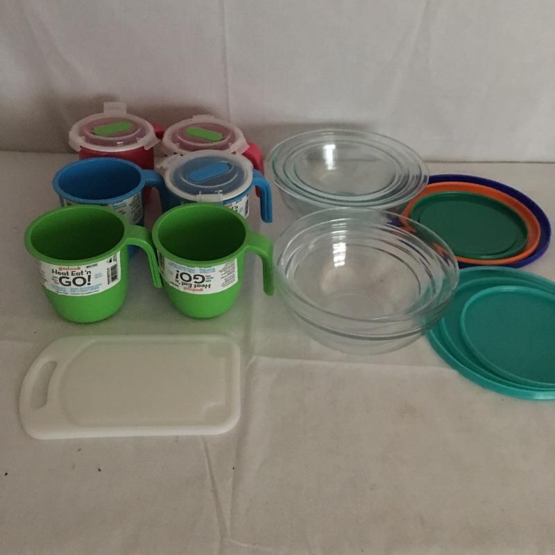 Two sets of glass nesting bowls,one unmarked the other is Pyrex and six microwave travel cups.