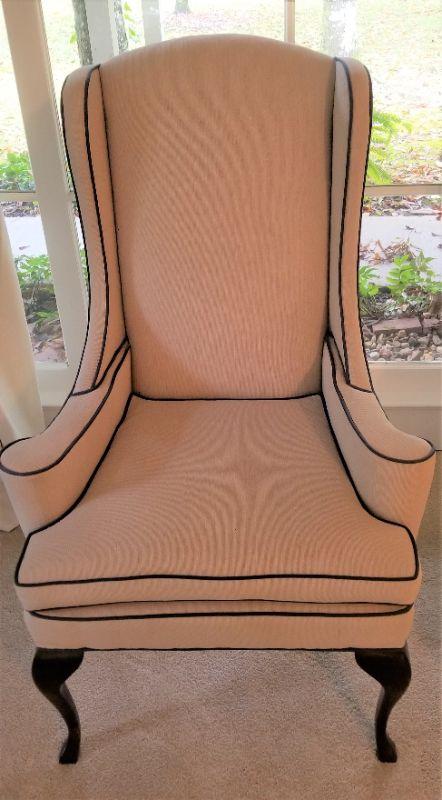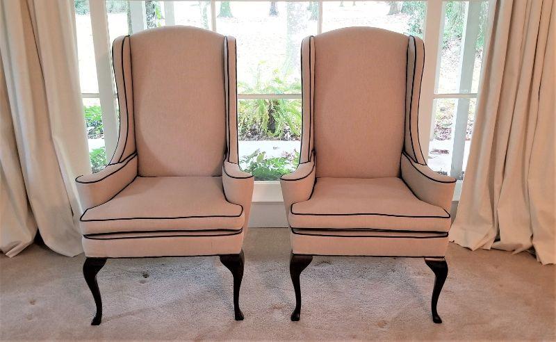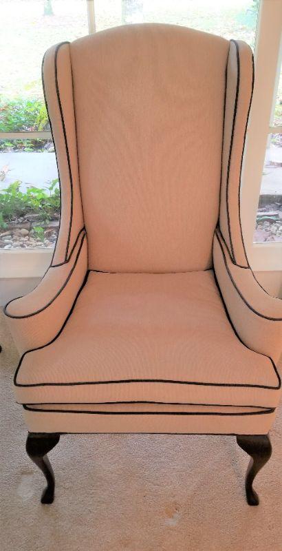 These chairs are vintage but have likely been reupholstered at some point. Queen Anne style legs, gently used. No maker noted. 29" across, 20" deep, 45" tall.