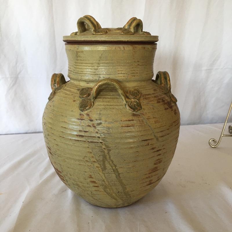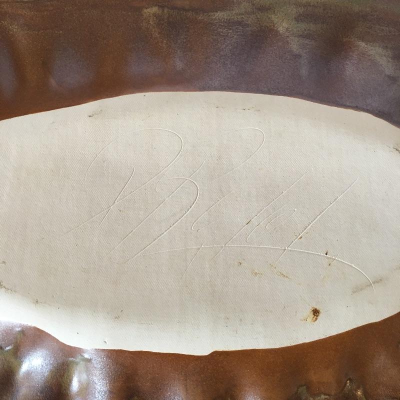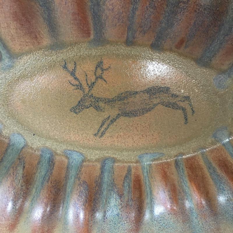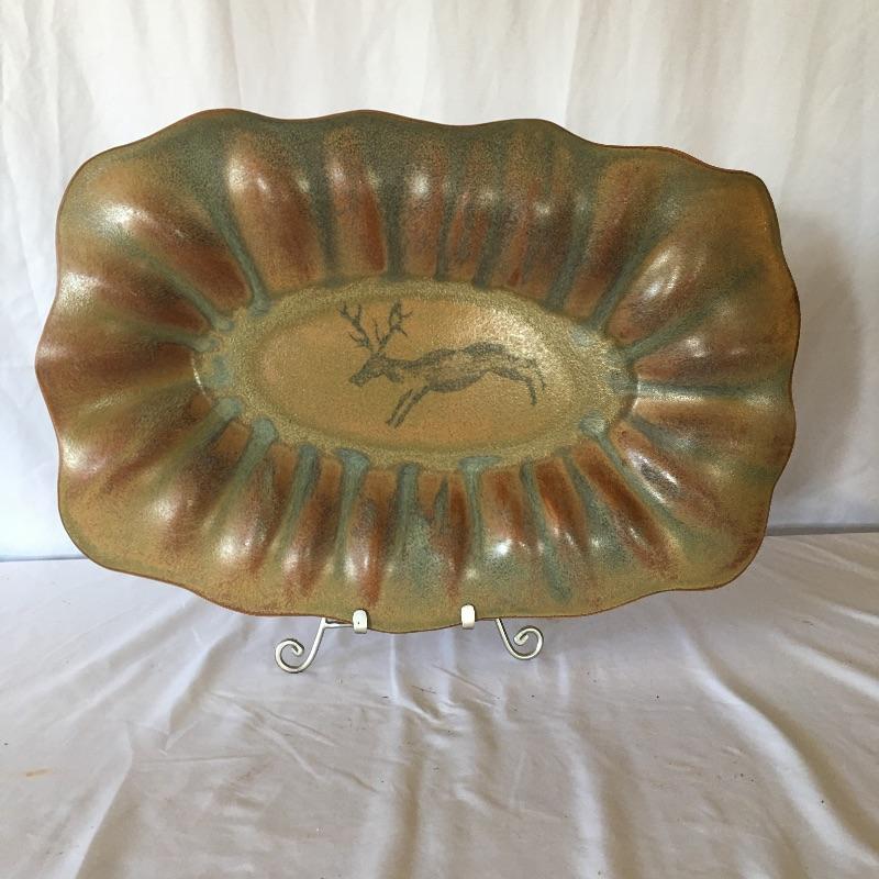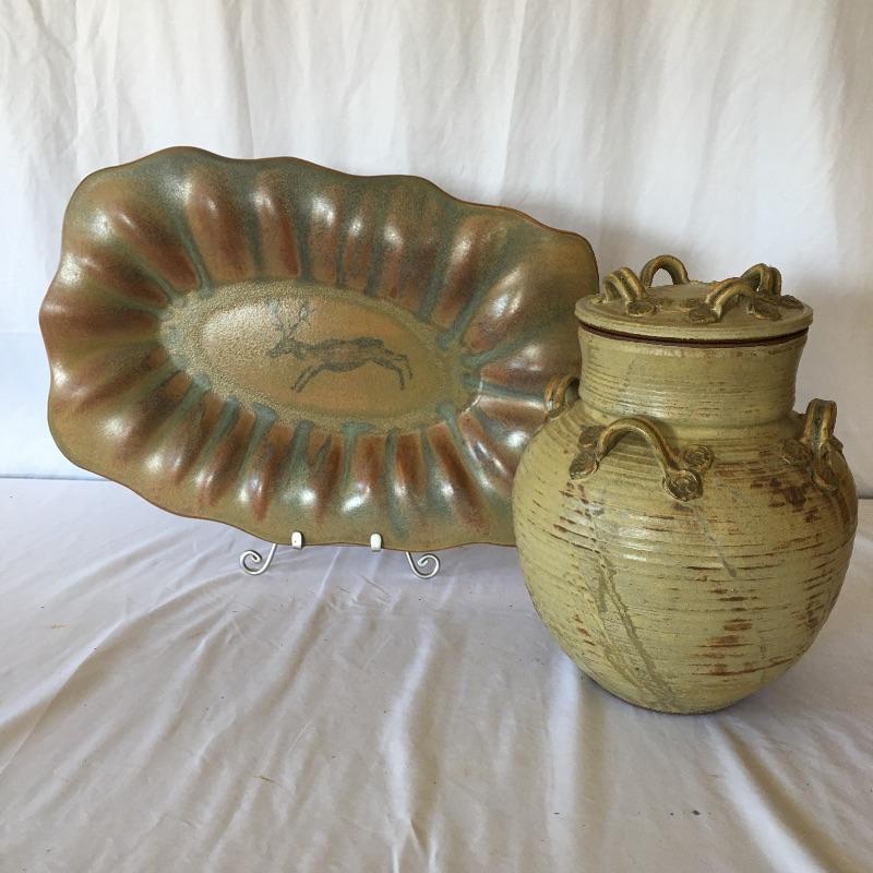 These two pieces of pottery are both signed and include a lidded large urn and a large serving tray with a running elk in its center.