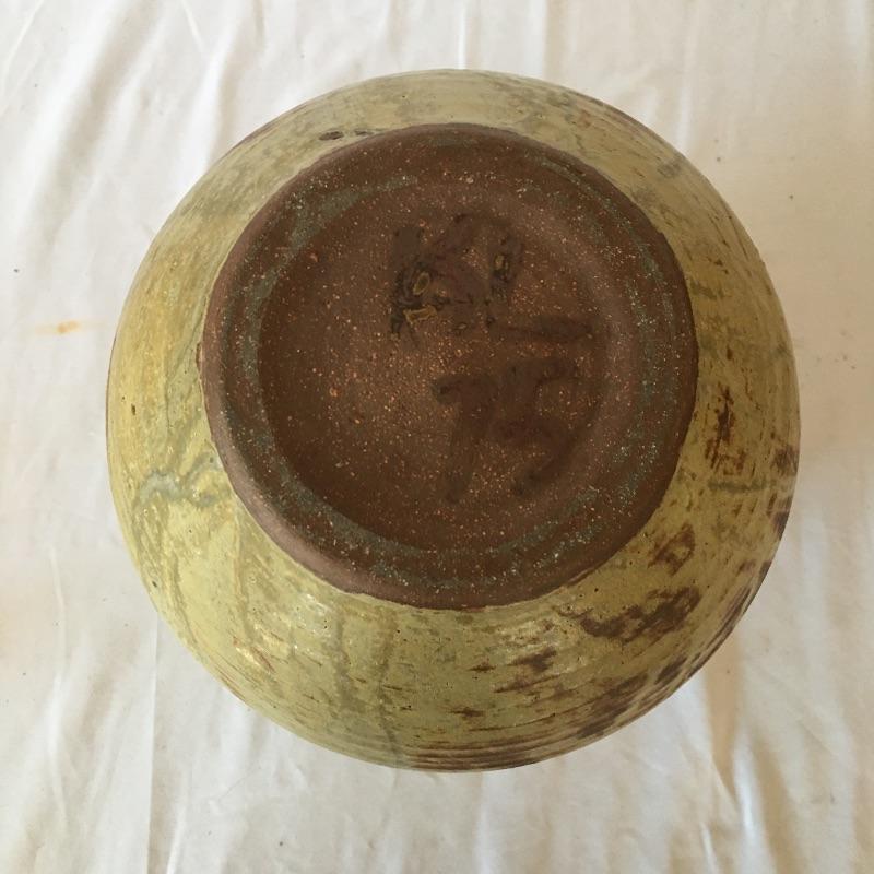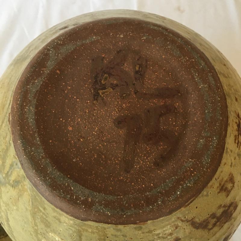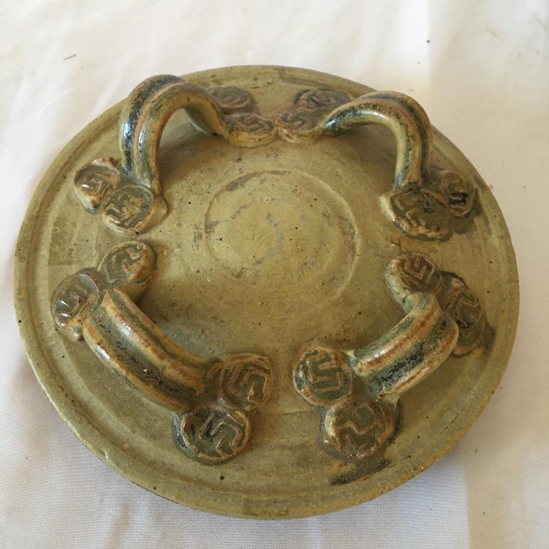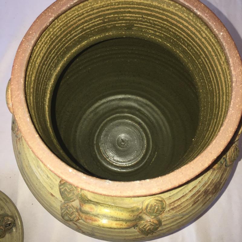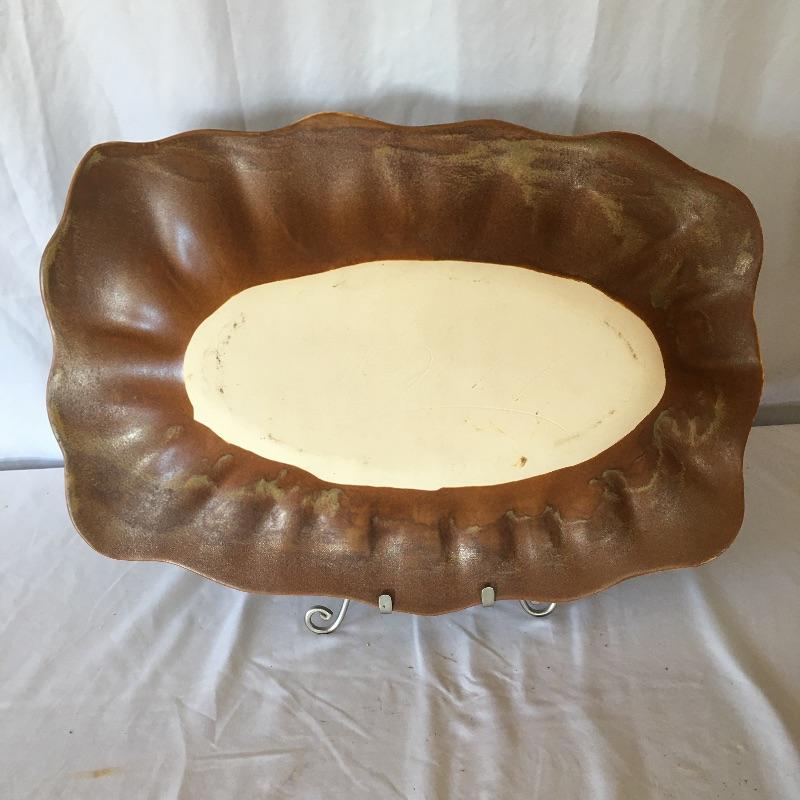 These two pieces of pottery are both signed and include a lidded large urn and a large serving tray with a running elk in its center.