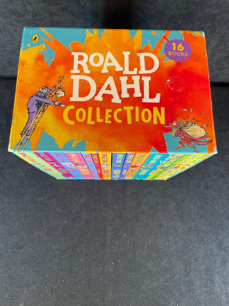 Includes 16 paperback Roald Dahl books. Titles are Boy, The Witches, The BFG, Matilda, George's Marvelous Medicine, Eiso Trout, Charlie and the Chocolate Factory, Charlie and the Great Glass Elevator, Fantastic Mr. Fox, Danny the Champion of the World, Going Solo, The Magic Finger, The Twits, The Giraffe and the Pelly and Me, James and the Giant Peach, and Billy and the Minipins.