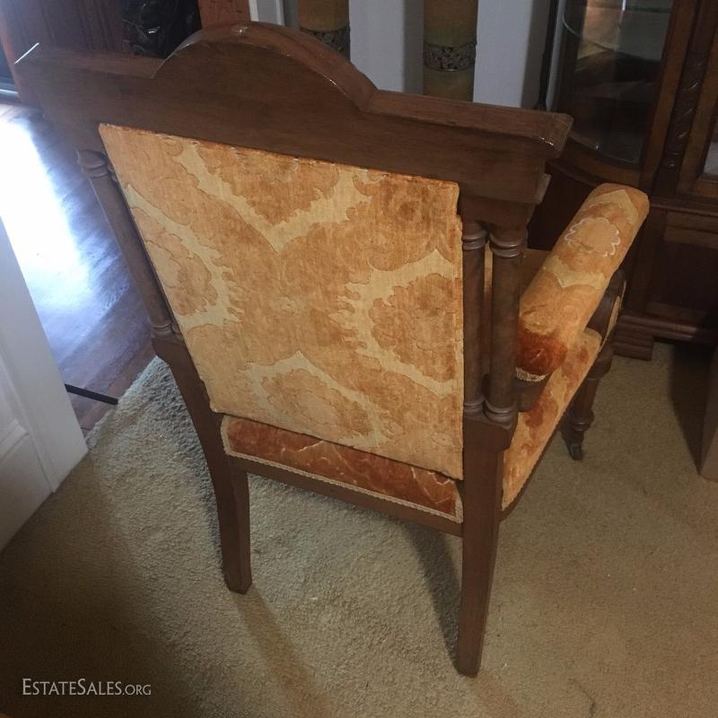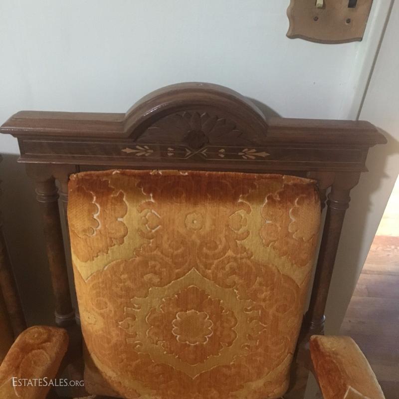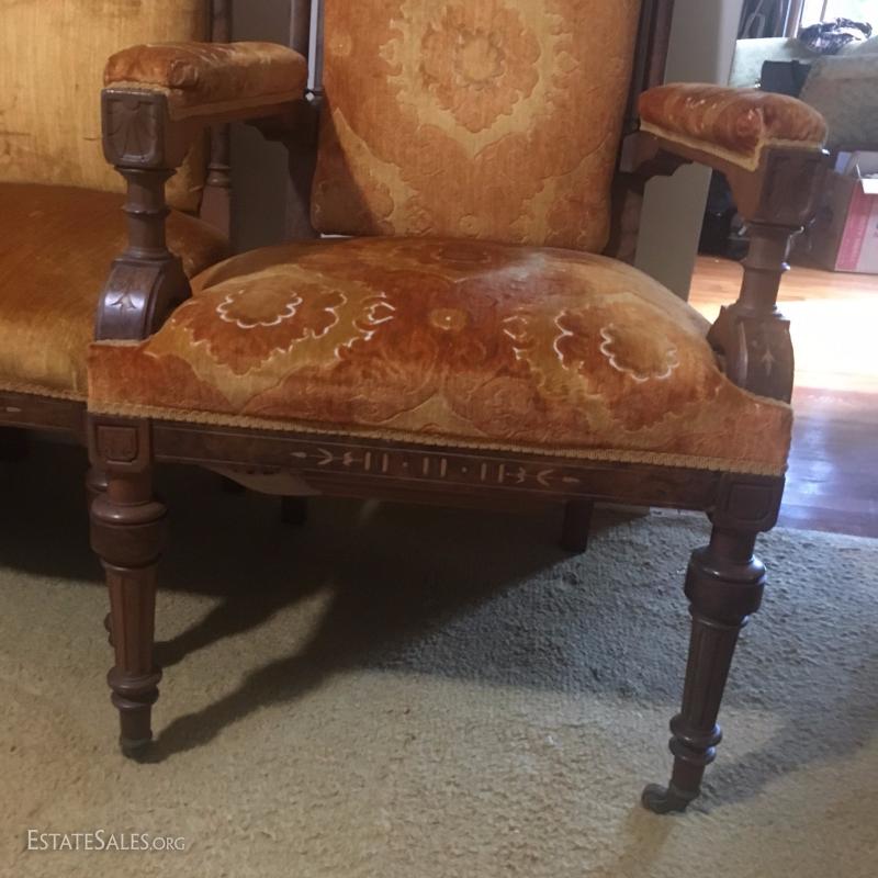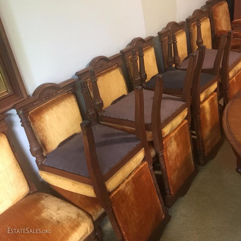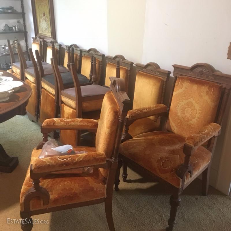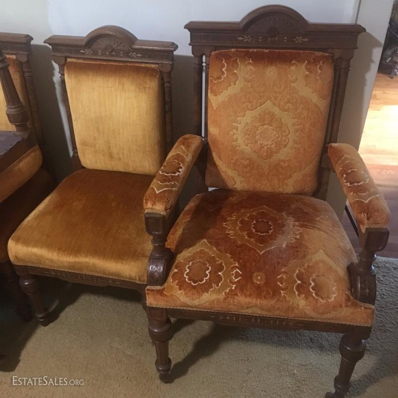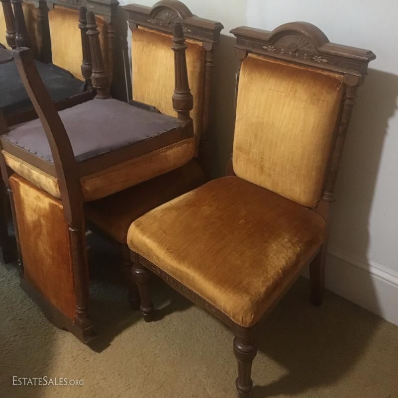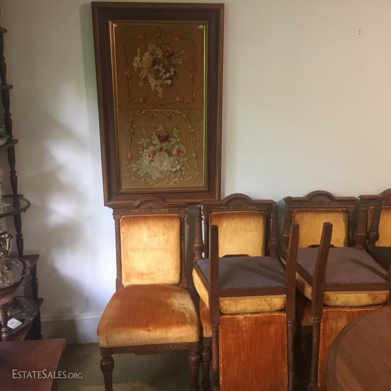 Total of 12 Victorian Walnut Dining Chairs in Eastlake style. They have a satin wood inlay along the top rail. Two armchairs (26"l by 22" w x 39.5"h) and ten side chairs (20.5"l x 20.5"w x 39"h). Orange velvet pattern on chairs. Art piece above chairs included as is original embroidered seat covers in a custom reclaimed frame from a stair railing. They just need to stay together. Frame measures (44"l x 28.5"w)