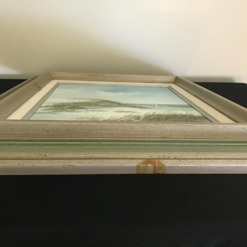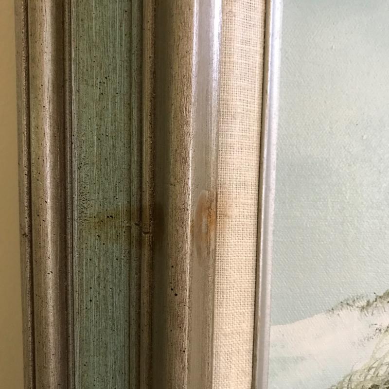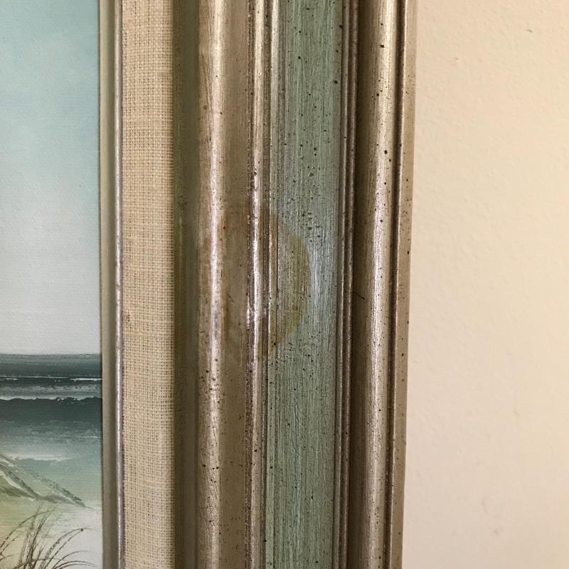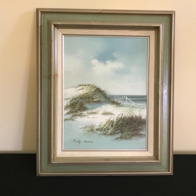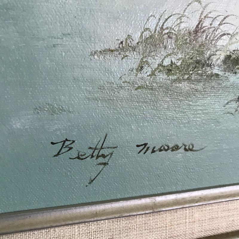Beautiful serene scene signed by Betty Moore appears to be an oil painting. Other than stains, the frame is in nice condition, see photos. Frame measures approx. 19.5” x 23.5”. Shipping available, please obtain a quote from UPS prior to bidding as art can be expensive to ship.