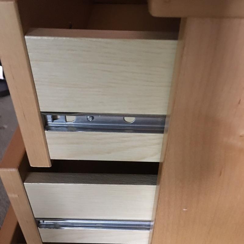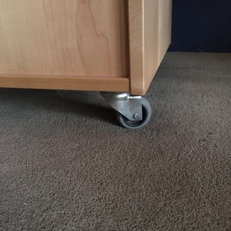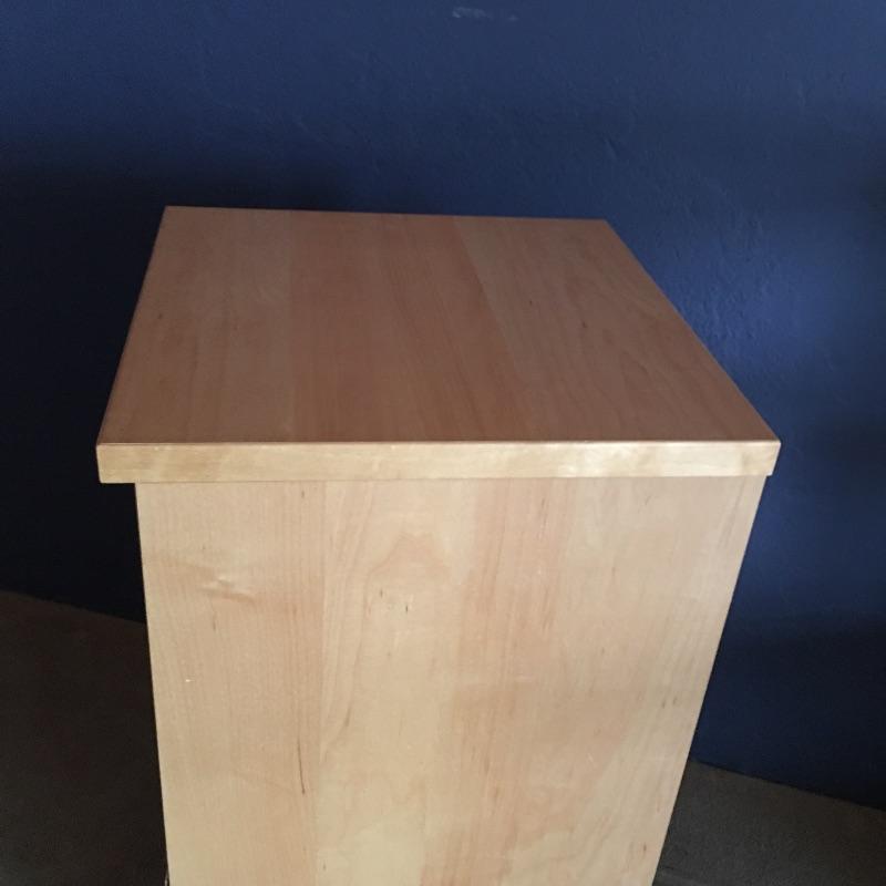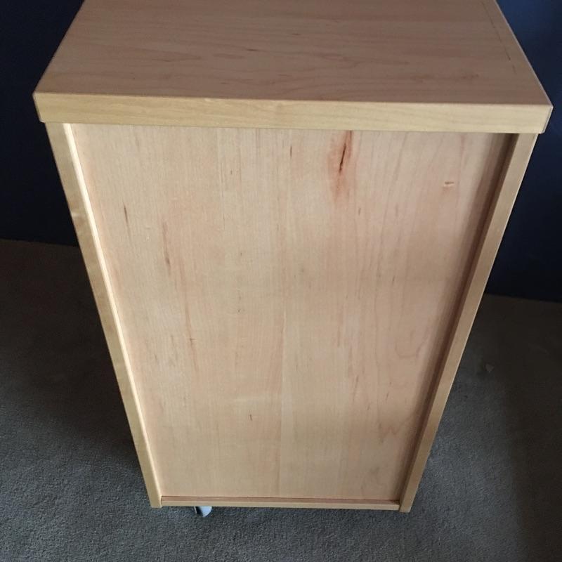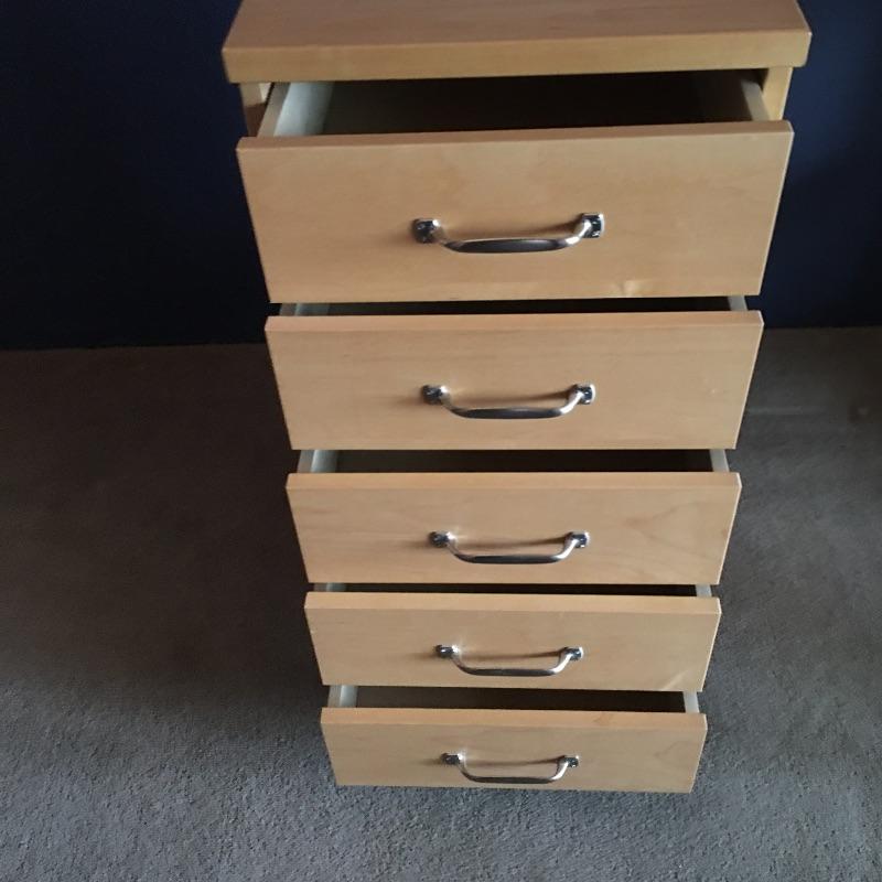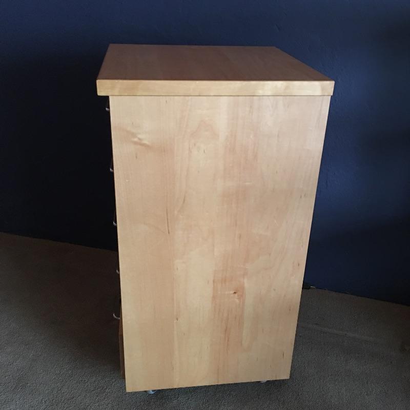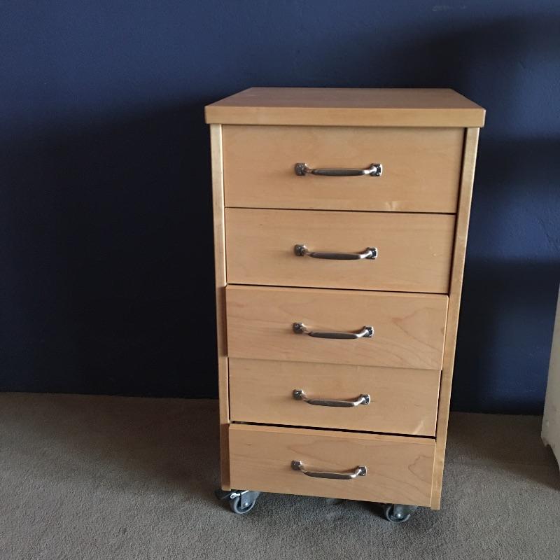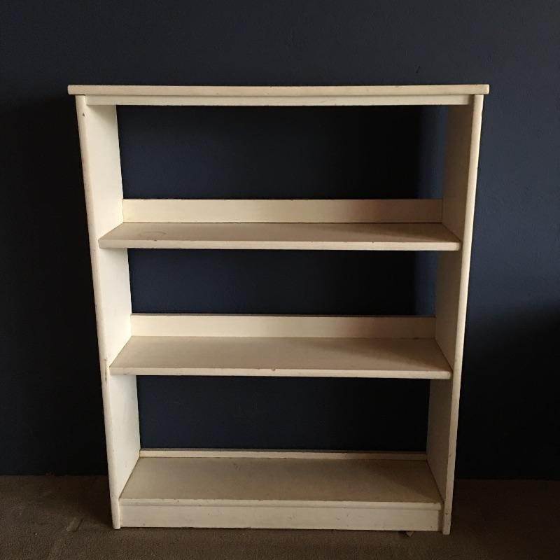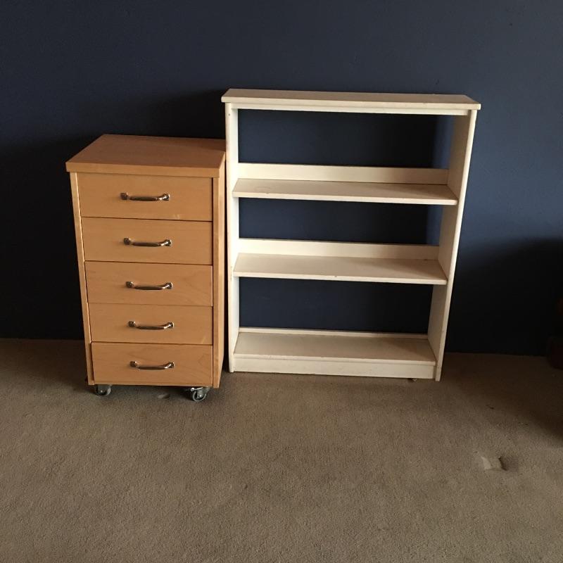 Small chest of drawers and shelf. Lot includes five drawer chest on wheels with metal hardware and likely manufactured wood. Small open back all wood bookshelf would be great for a child’s room or where space is at a premium.