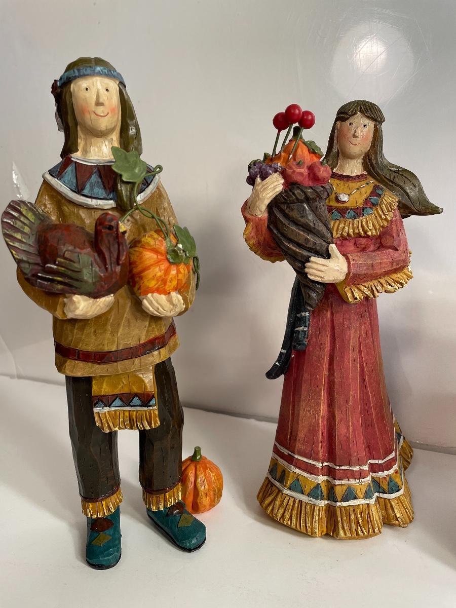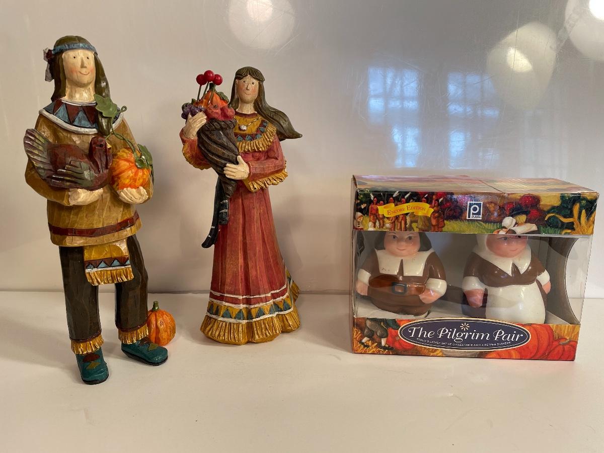 Pair of Thanksgiving Indian Figurines and a set of pilgrim salt and pepper shakers