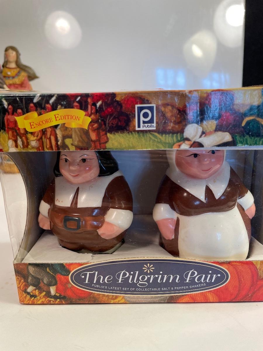 Lot Pair of Thanksgiving Indian Figurines and a set of pilgrim salt and pepper shakers