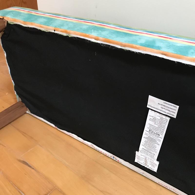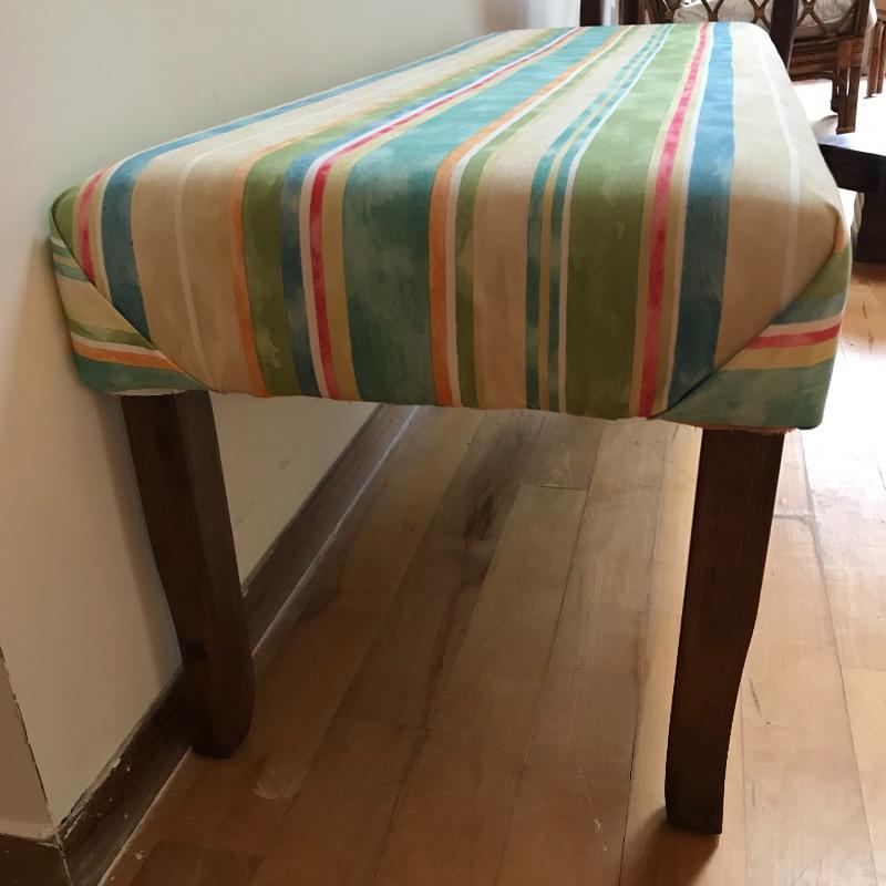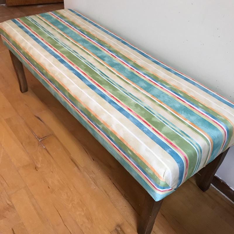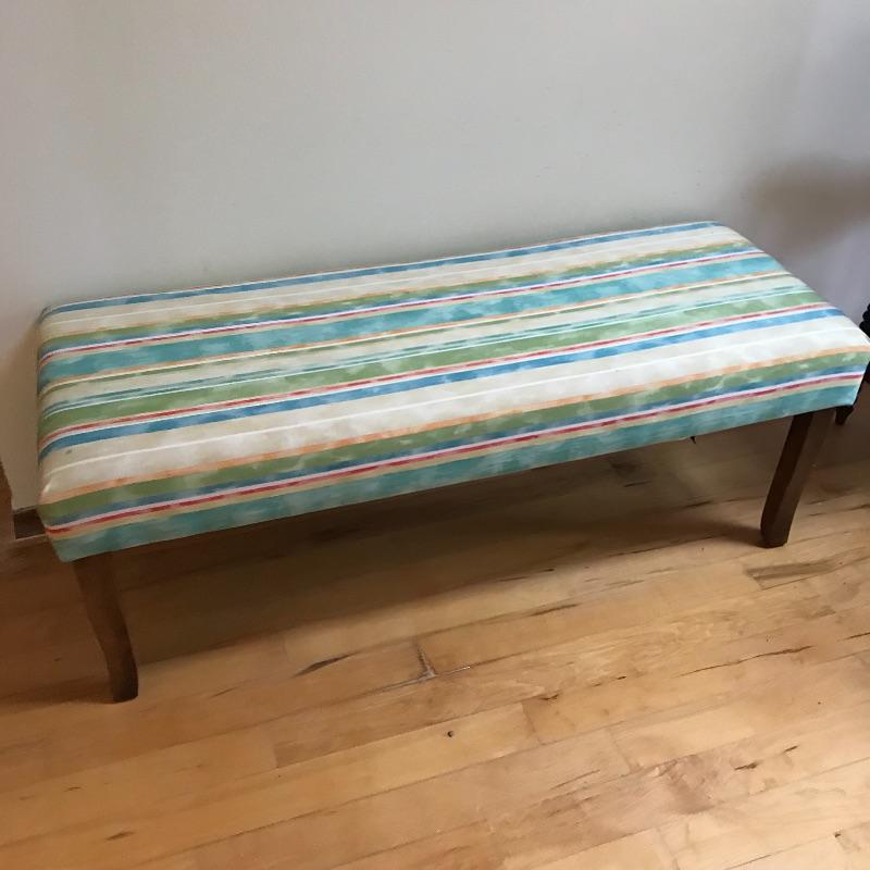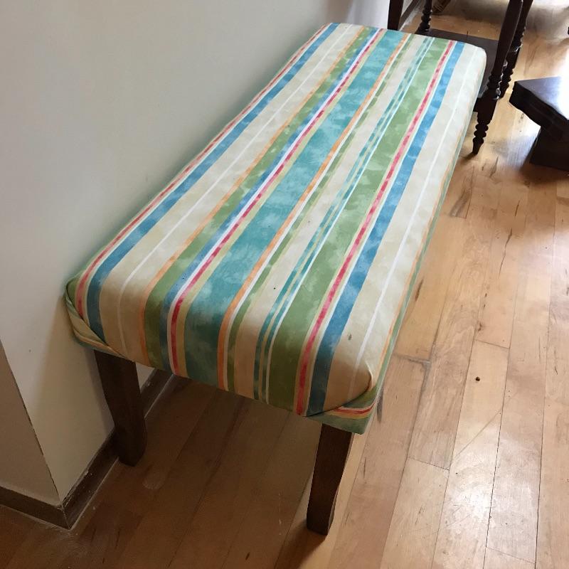 This comfy upholstered bench would be a great addition to your entryway or bedroom. Could easily be recovered with your favorite fabric and a staple gun. Approx. 48” x 18” x 18”. Local pickup only.