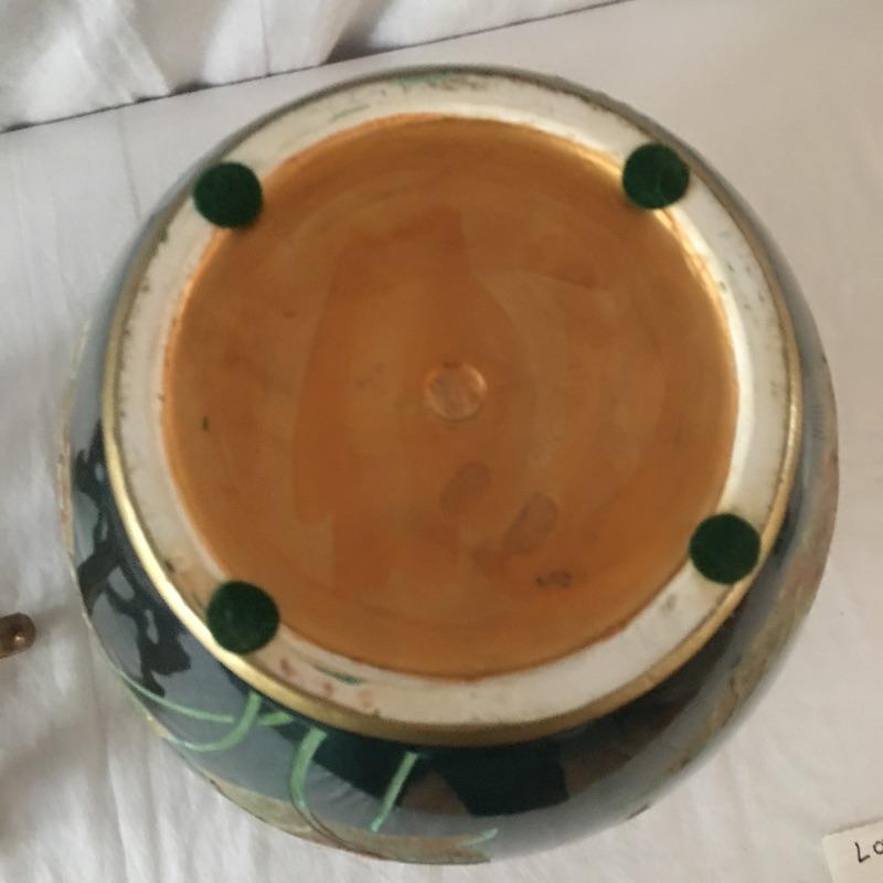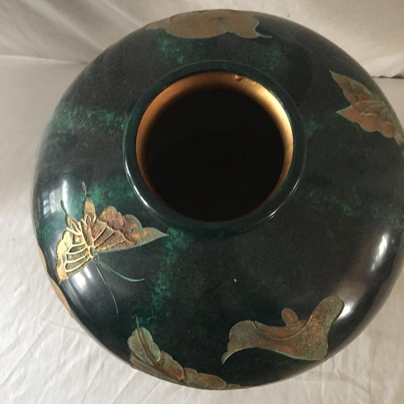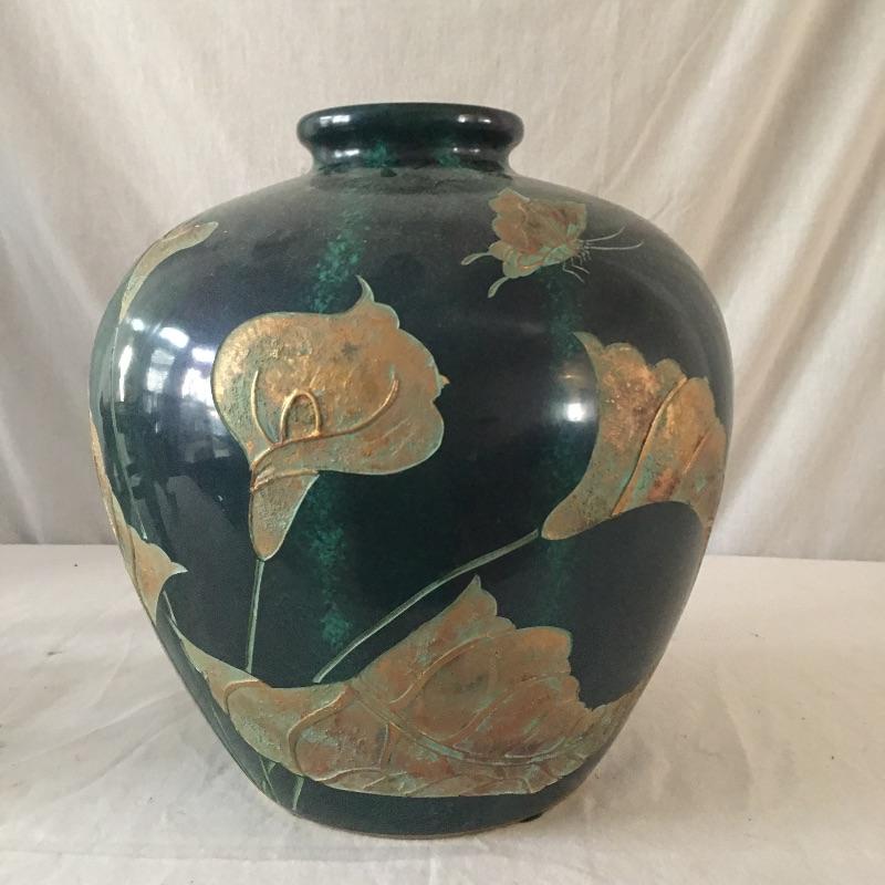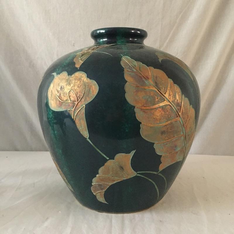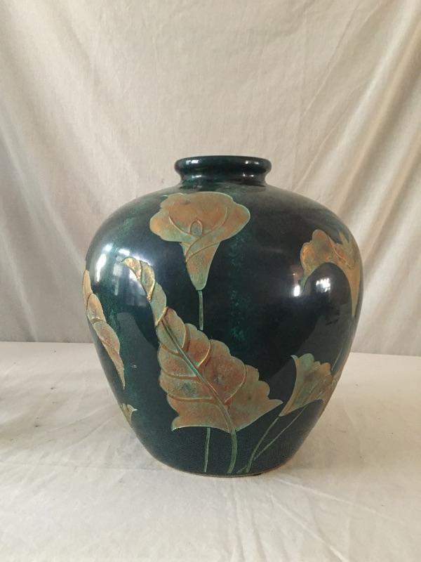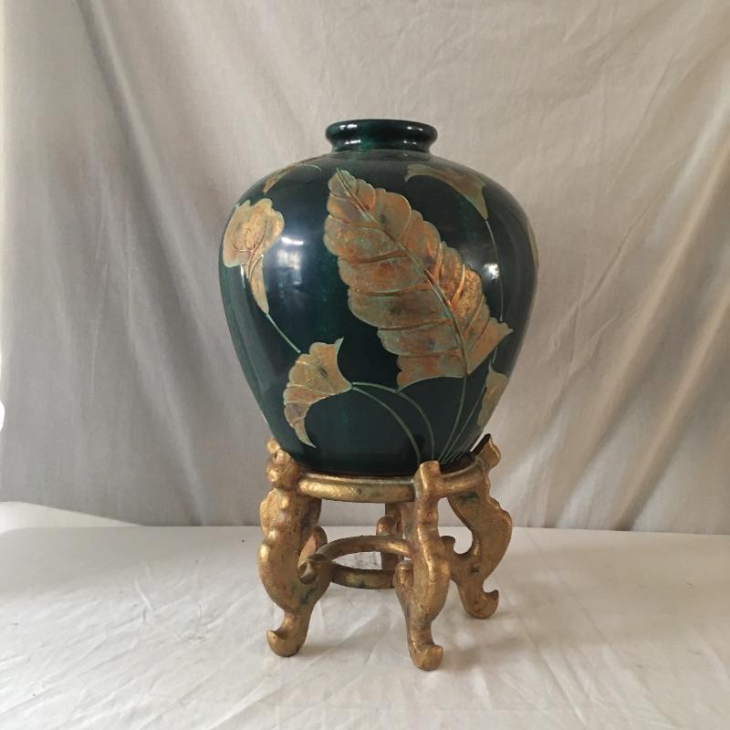 Large vase with stand. Beautiful vase that has a paper describing it as a Coromandel lacquer carving, but cannot be verified. An eye catching vase that is sure to look great in your home or office. Vase measures 12.5”D x 13.75” tall.