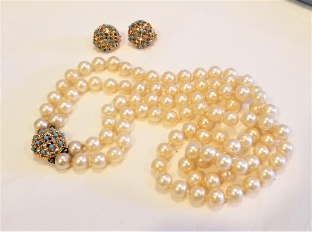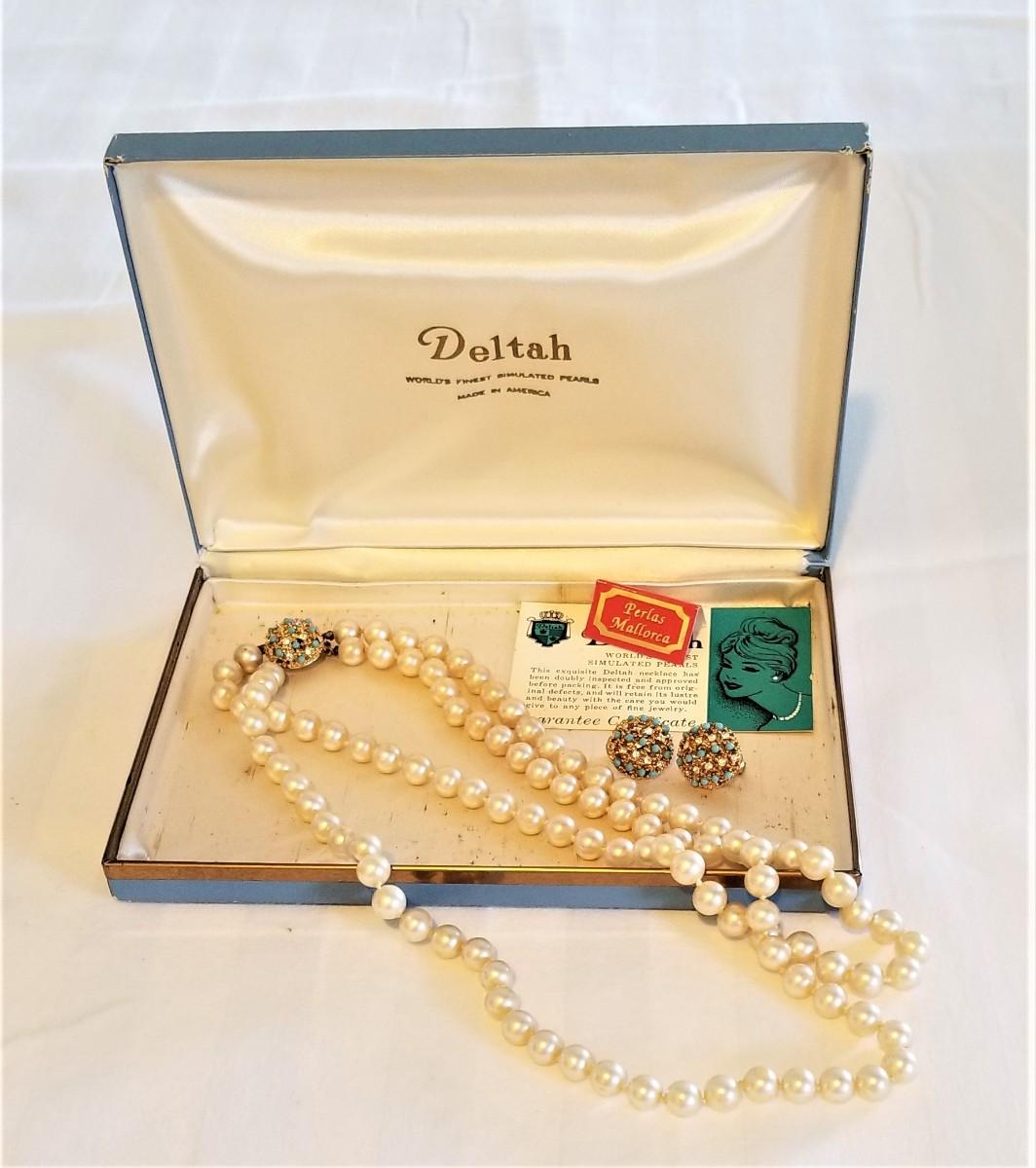 Nice double strand of costume pearls with matching clip earrings. Matching clasp set with faux turquoise and rhinestones. Pearls are individually knotted. The set is not marked, but they were found in this vintage Deltah Pearls box with brochure. Box has some age-related wear. Necklace is about 14 inches long and both necklace and earrings are in good vintage condition.