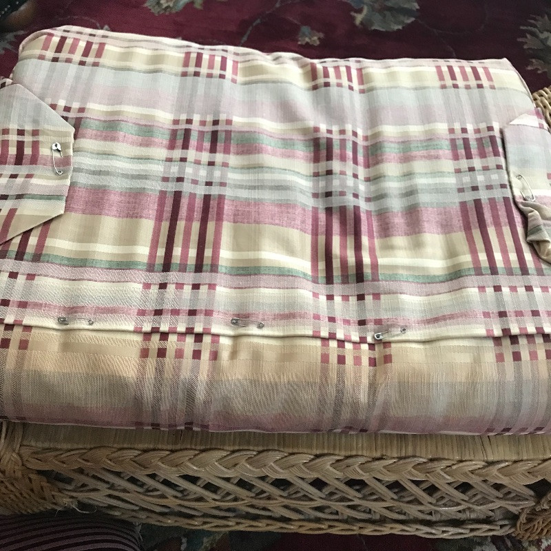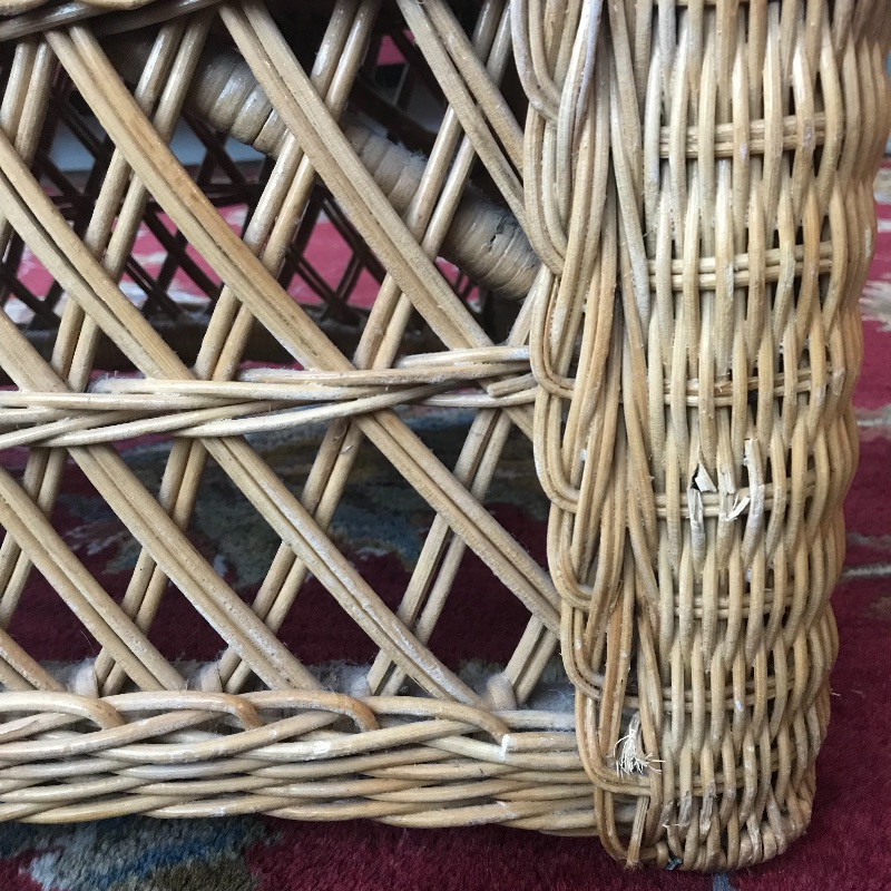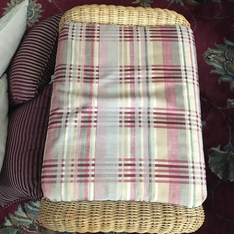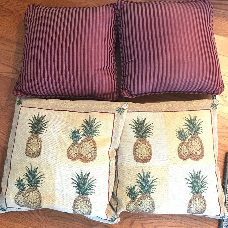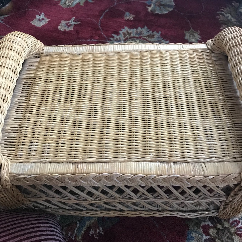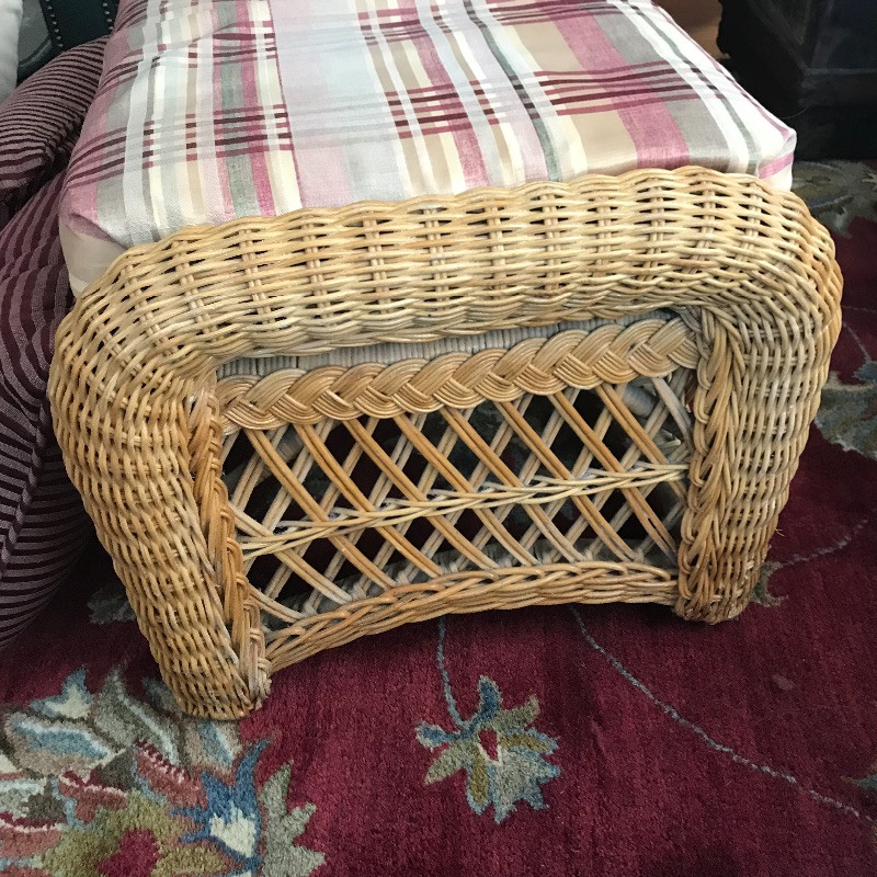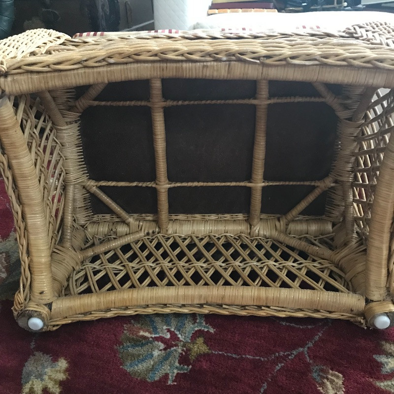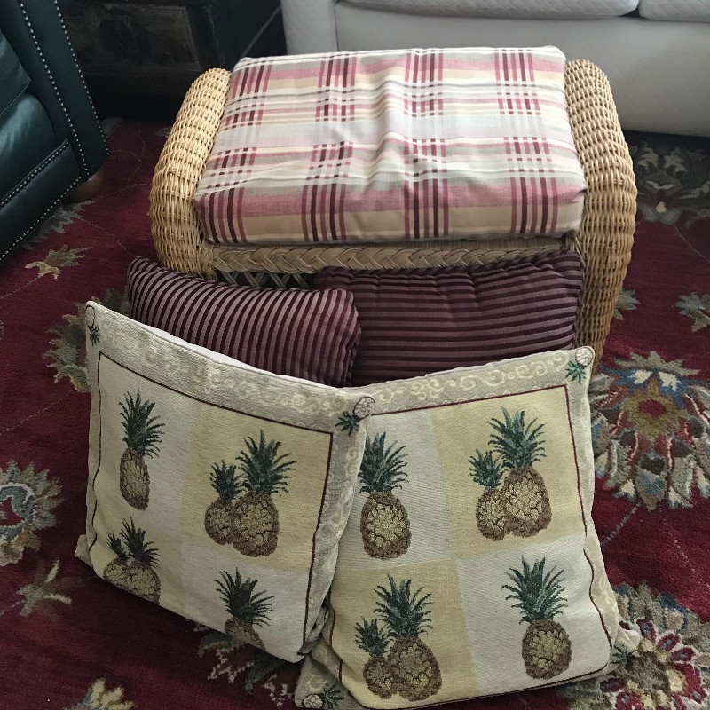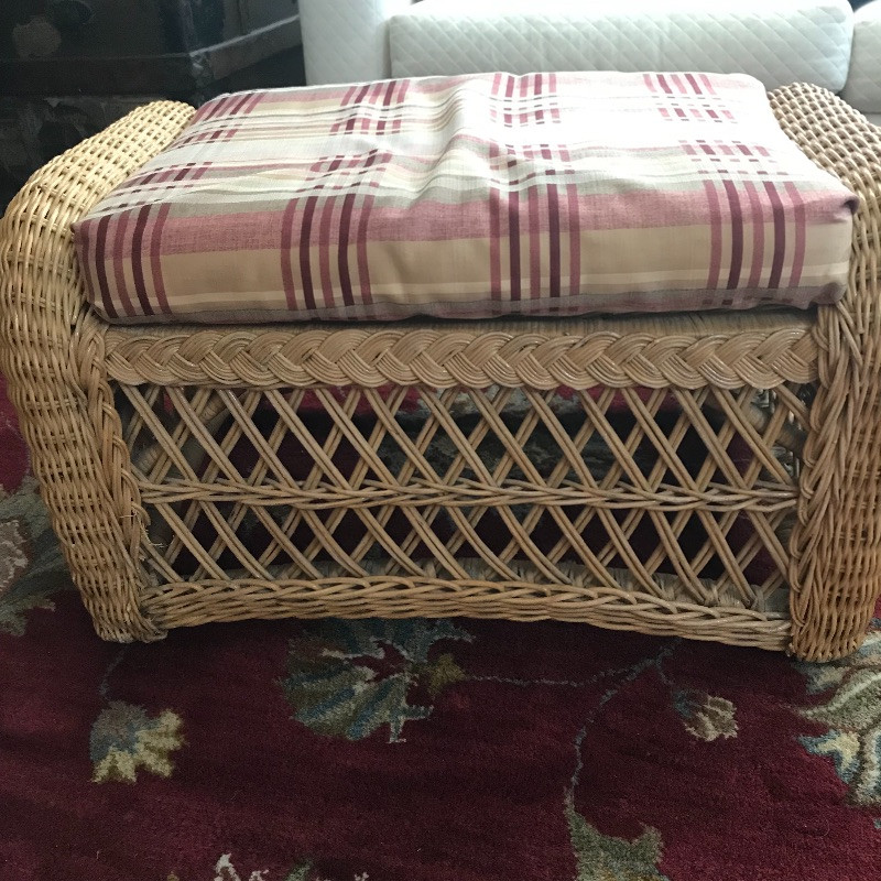 Put your feet up and relax with this lovely wicker ottoman that measures 27” x 18” x 16”. The cushion is removable and the current cover is pinned together, see images. Two pairs of throw pillows accompany the ottoman. The maroon striped pair is by Newport and the pineapple pair is a cover with zipper. Local Pickup Only.