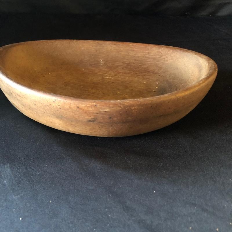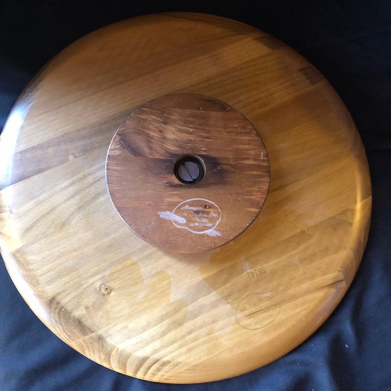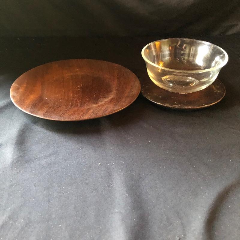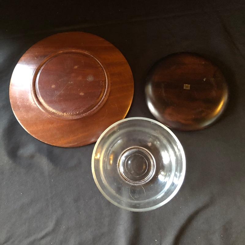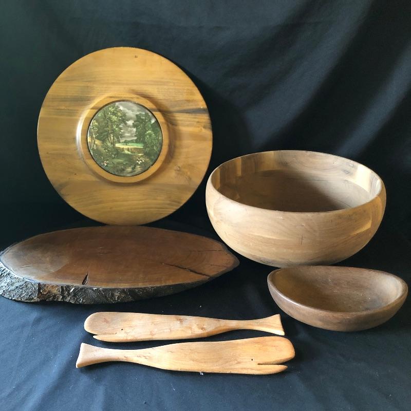 This is a fine assortment of wooden bowls and more. The lazy Susan has an inlaid tile in its center and has the makers mark which is a bit blurred but appears to say Margaret ?, it measures 14” diameter. Also included is a live edge wood slab, whale shaped utensils, a hanging half bowl and a variety of wood bowls in all shapes and sizes. The glass bowl sits upon a wood saucer that was made in Japan and the bowl measures 5.5” diameter.