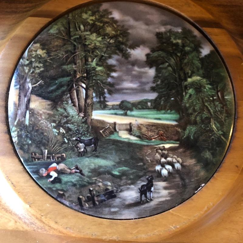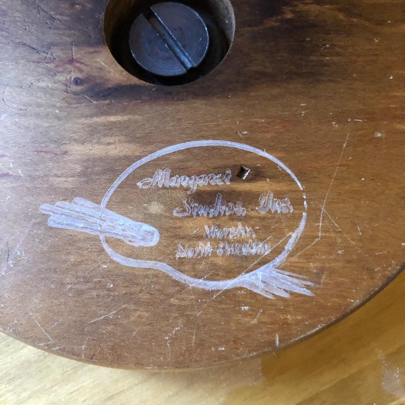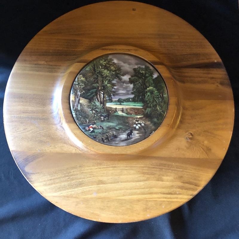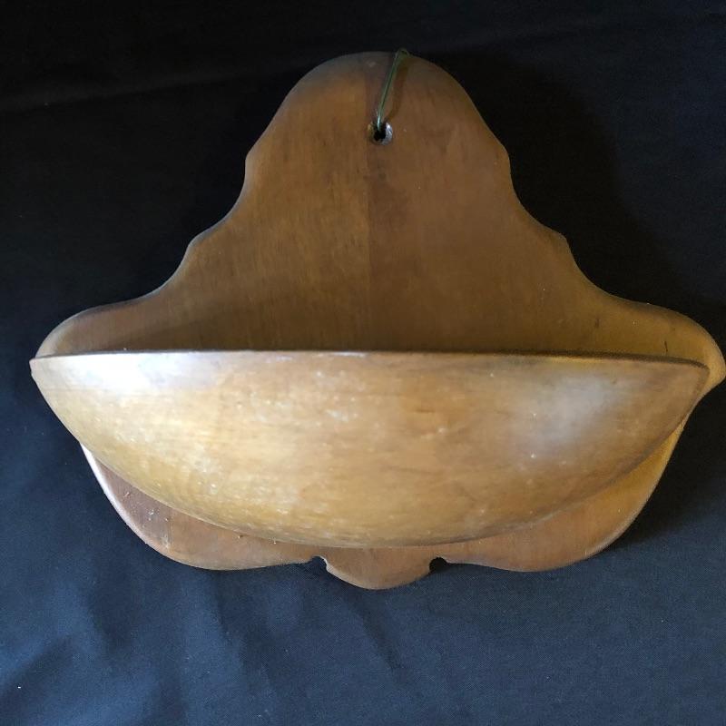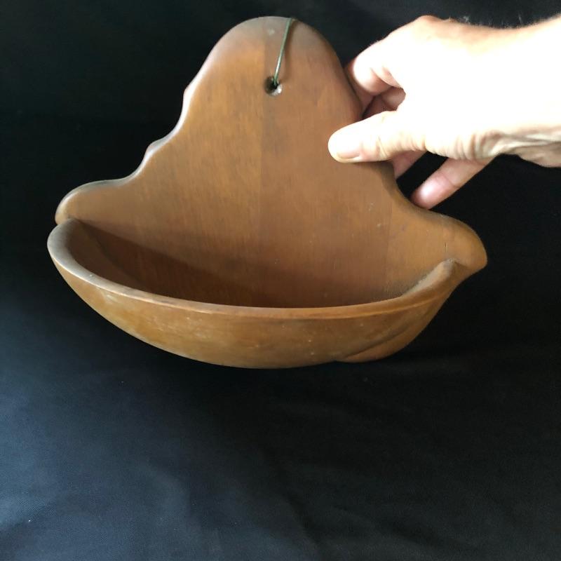 This is a fine assortment of wooden bowls and more. The lazy Susan has an inlaid tile in its center and has the makers mark which is a bit blurred but appears to say Margaret ?, it measures 14” diameter. Also included is a live edge wood slab, whale shaped utensils, a hanging half bowl and a variety of wood bowls in all shapes and sizes. The glass bowl sits upon a wood saucer that was made in Japan and the bowl measures 5.5” diameter.