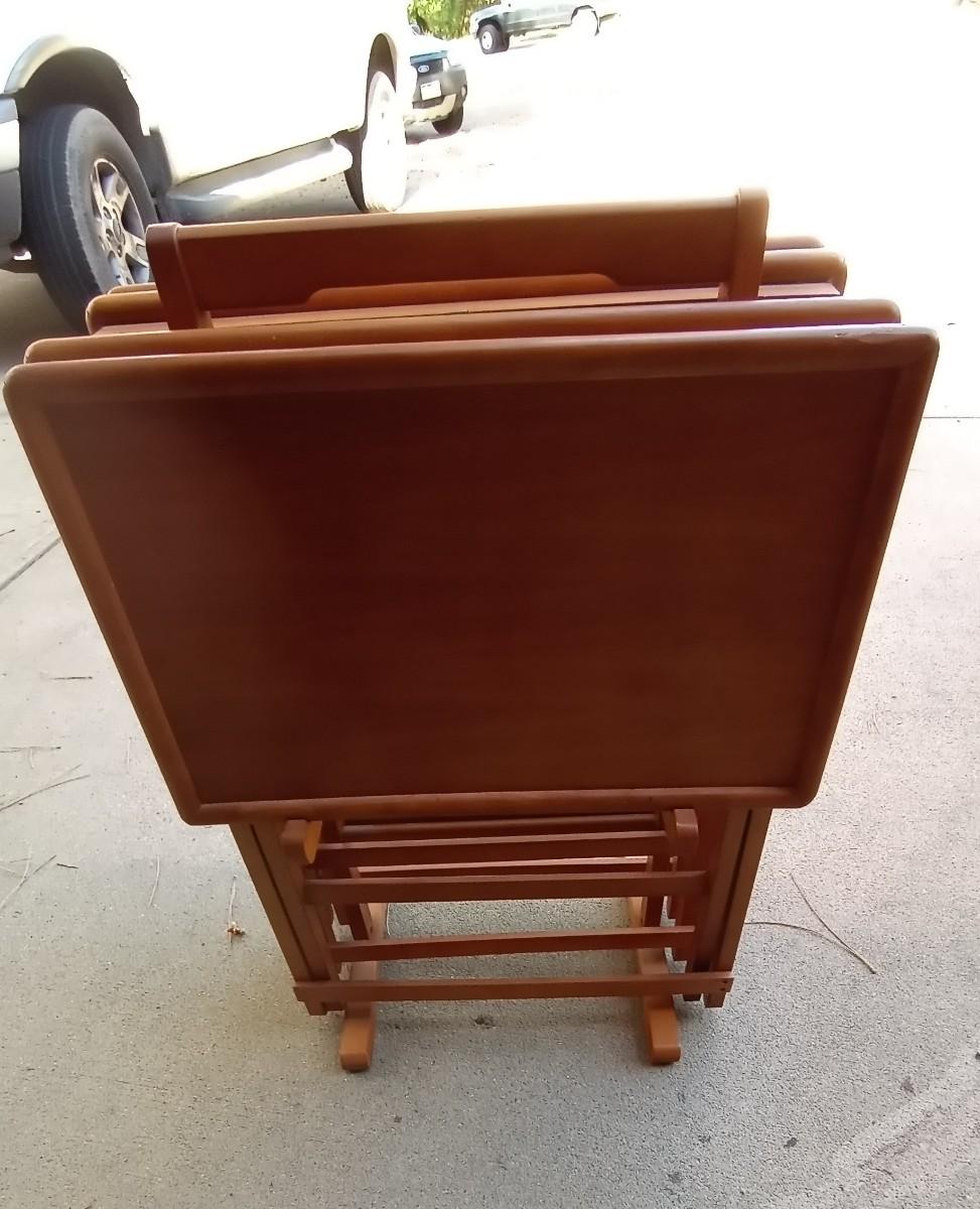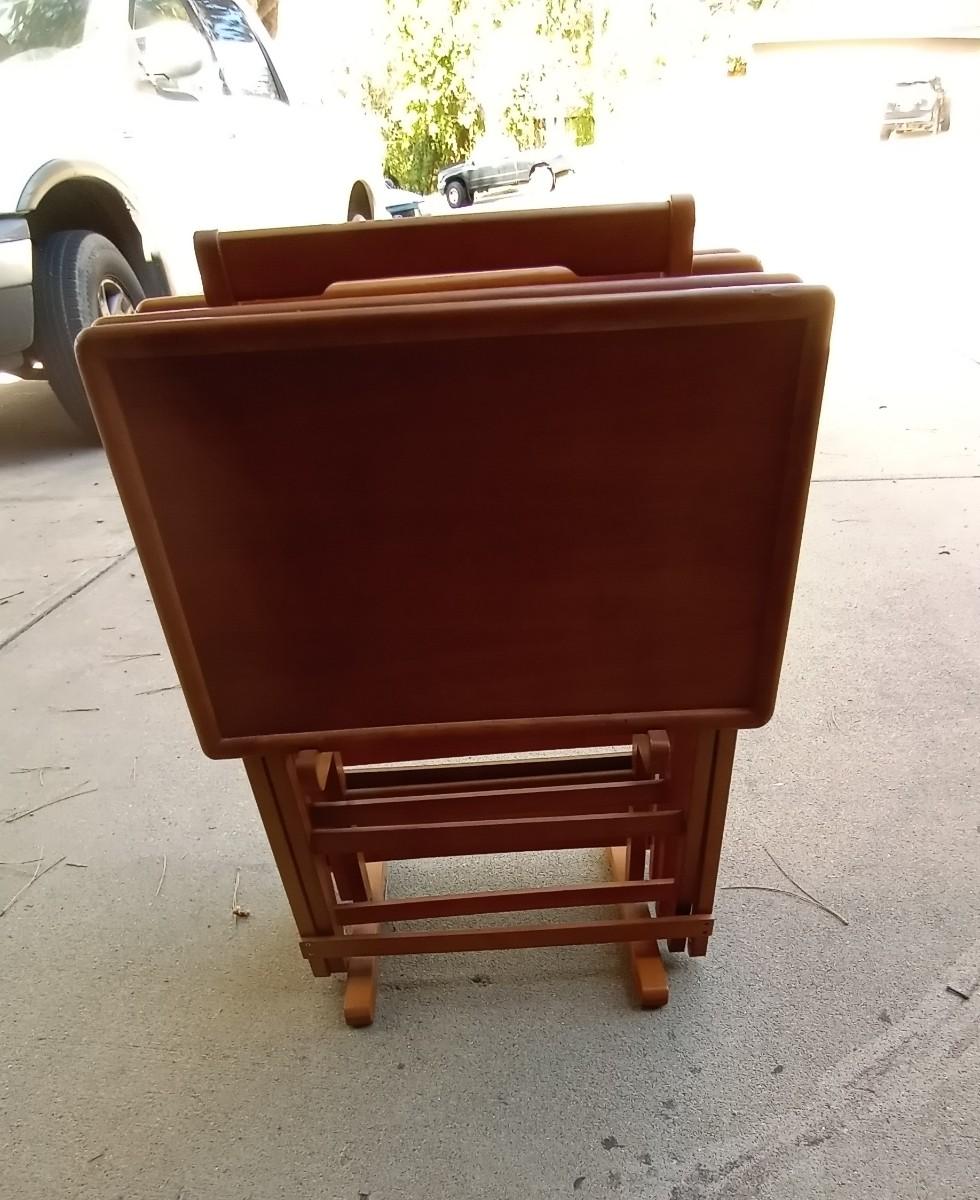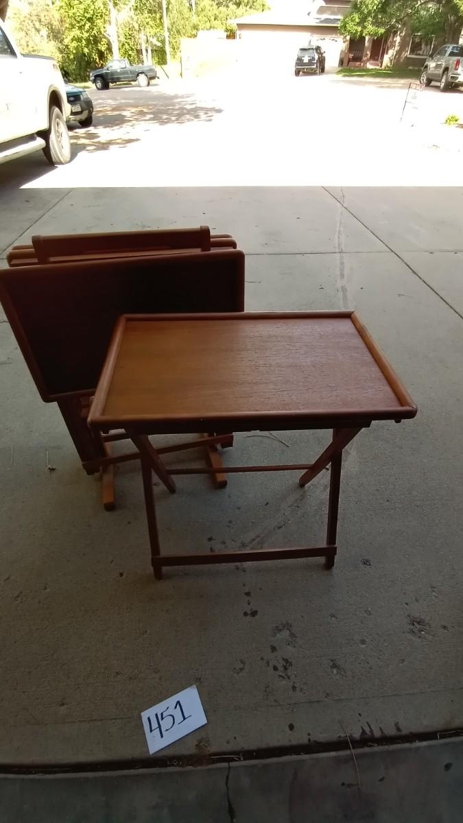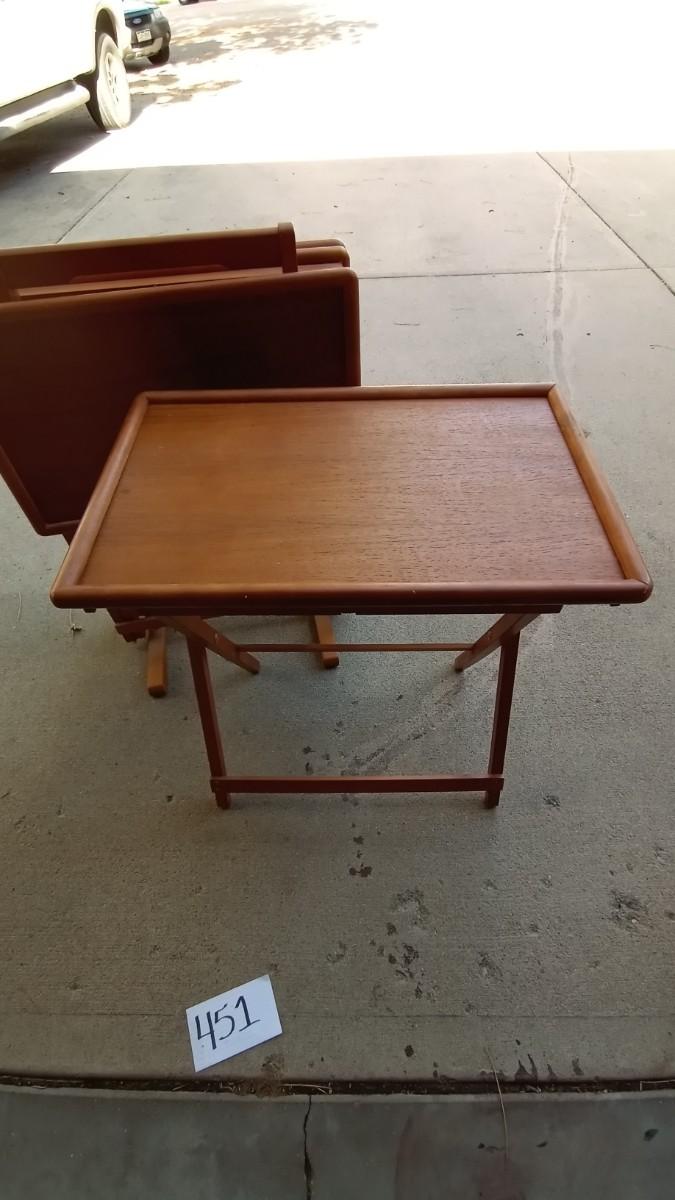 LOT 451 FOUR WOODEN TRAYS WITH HOLDER