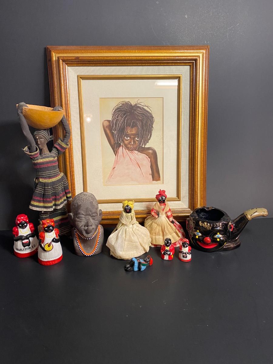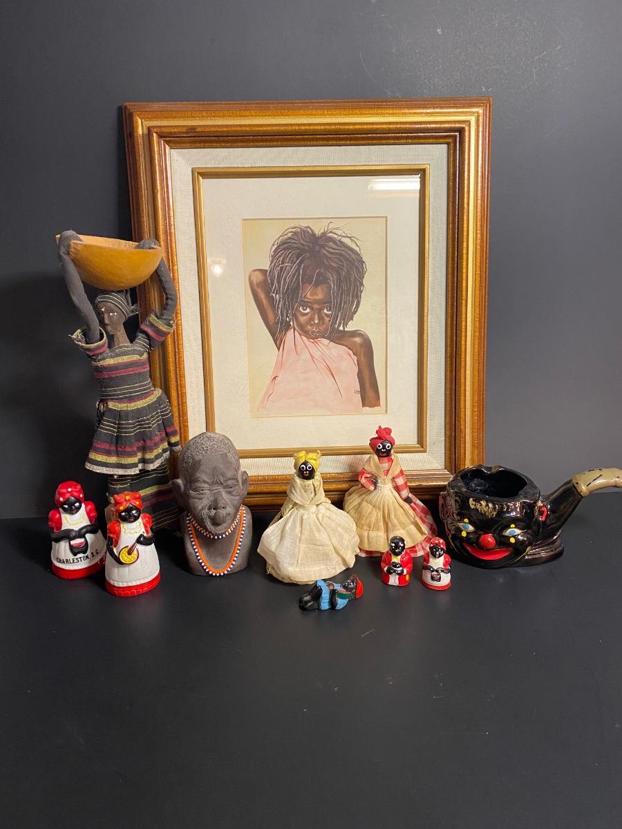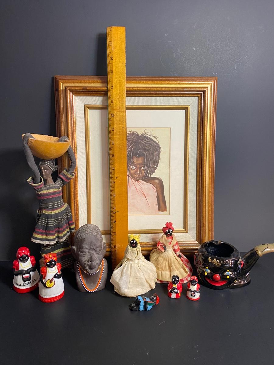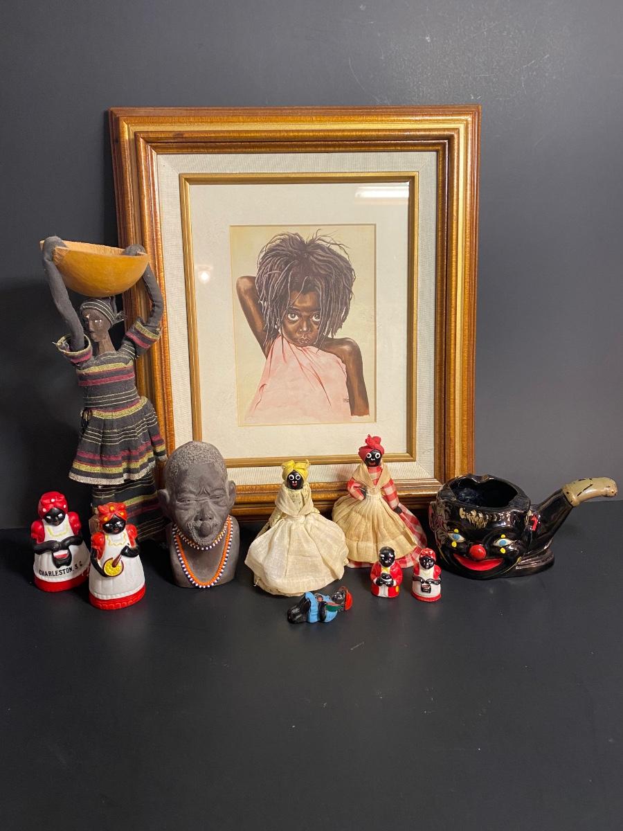 Southern folk art and more: framed print “Pretty Eyes” by Tom McKinney. signed sculpture for Kenya, vintage toothpick holder, ashtray and more
