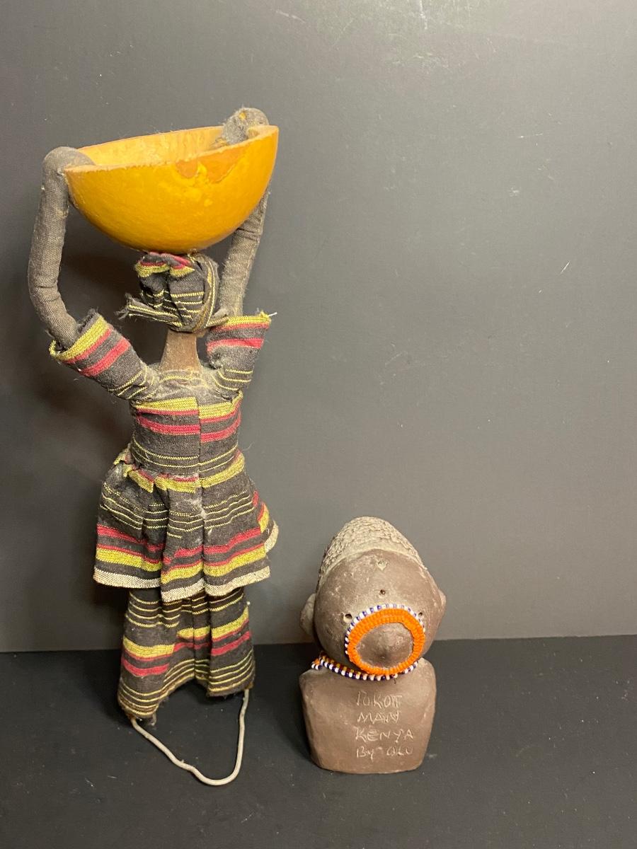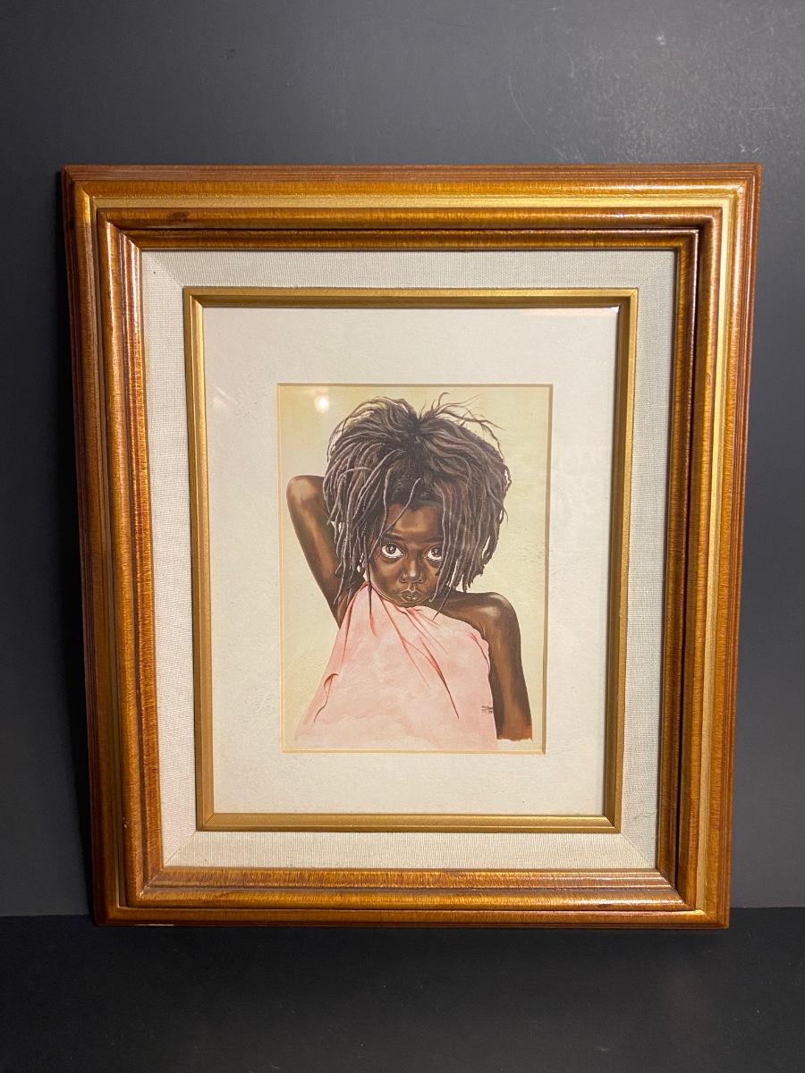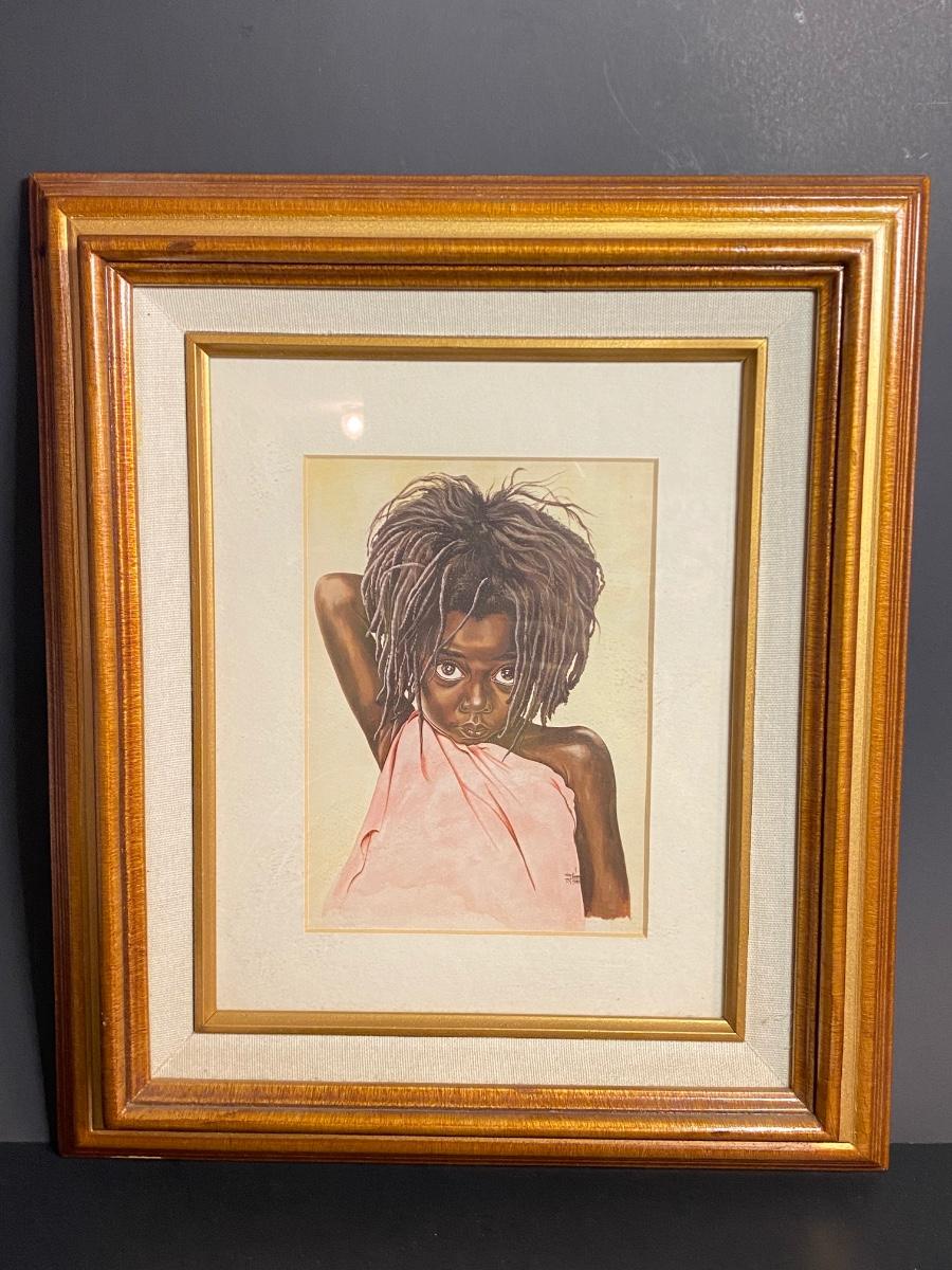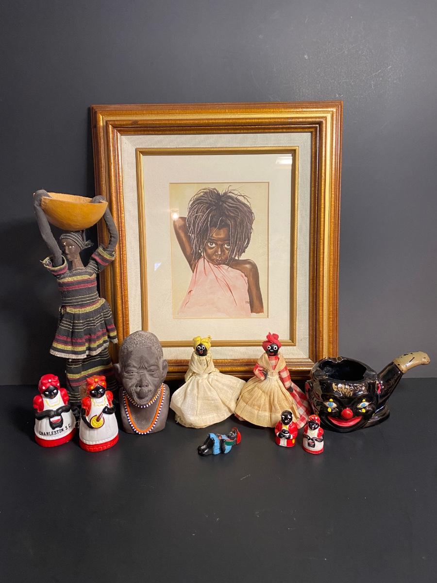 Southern folk art and more: framed print “Pretty Eyes” by Tom McKinney. signed sculpture for Kenya, vintage toothpick holder, ashtray and more