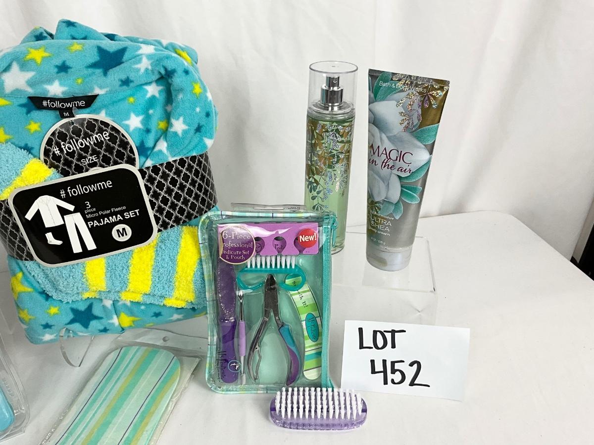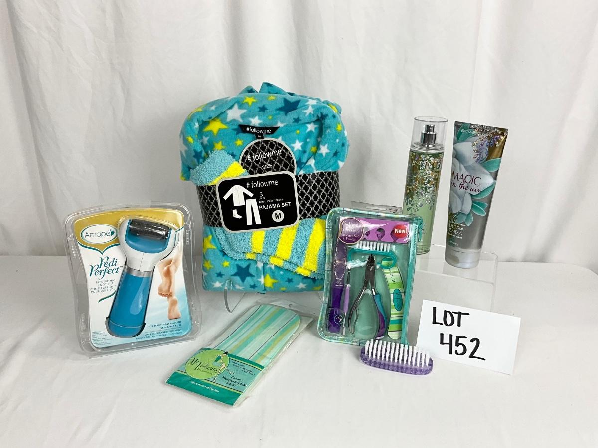 The lot contains a pajama set that is new with socks in a size medium, pedi perfect, Bath & Body Works lotion and fragrance spray, spa socks, nail brush and a pedicure kit.