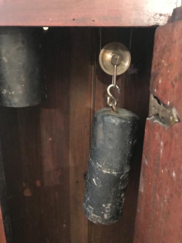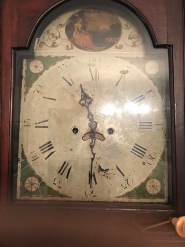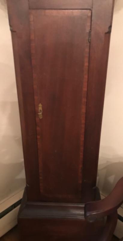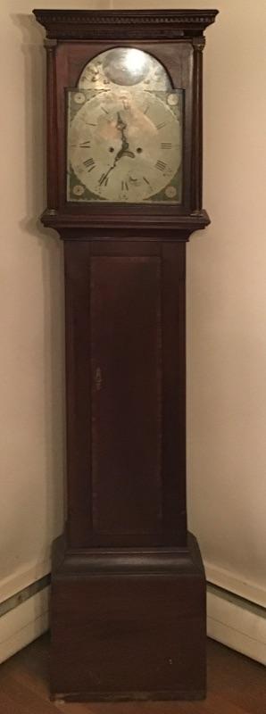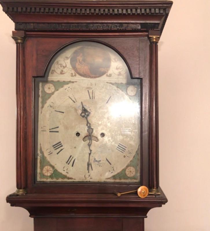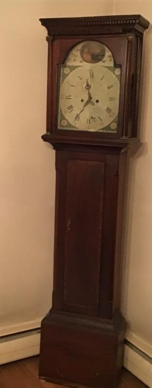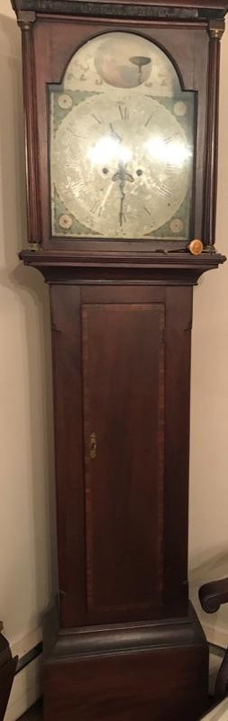 ANTIQUE GRANDFATHER CLOCK WITH AN ENGLISH BELL STRIKE MOVEMENT CIRCA 1830 PROBABLY PA DUTCH. 17.25”W x 9”D x 78.5”T