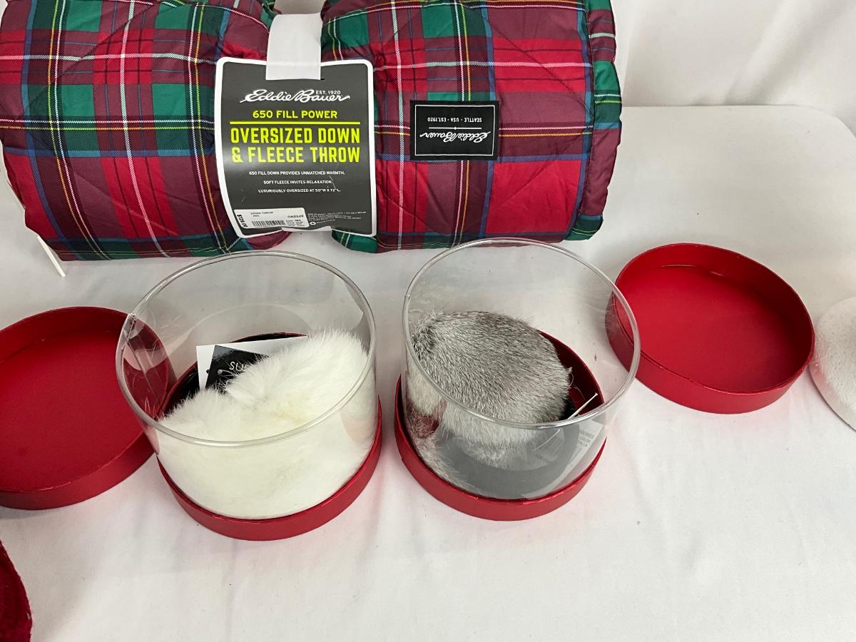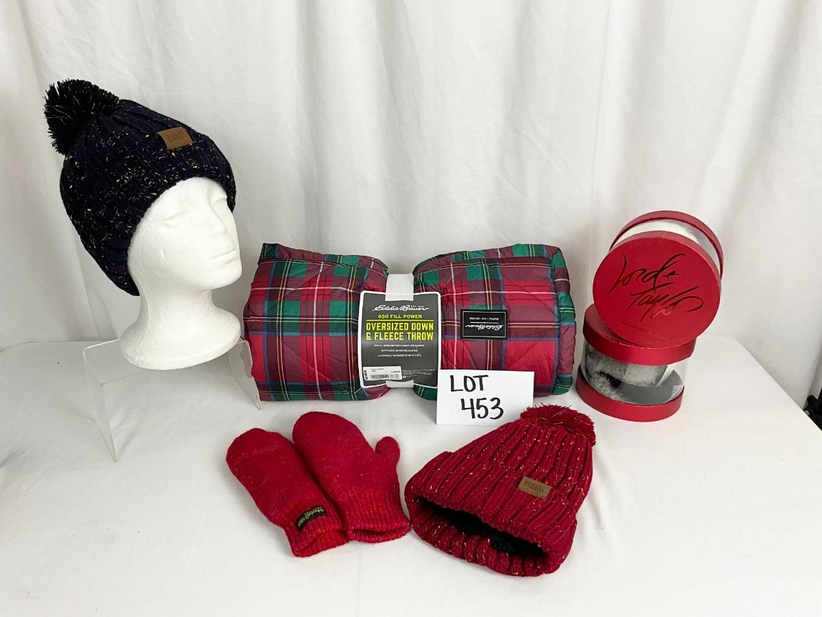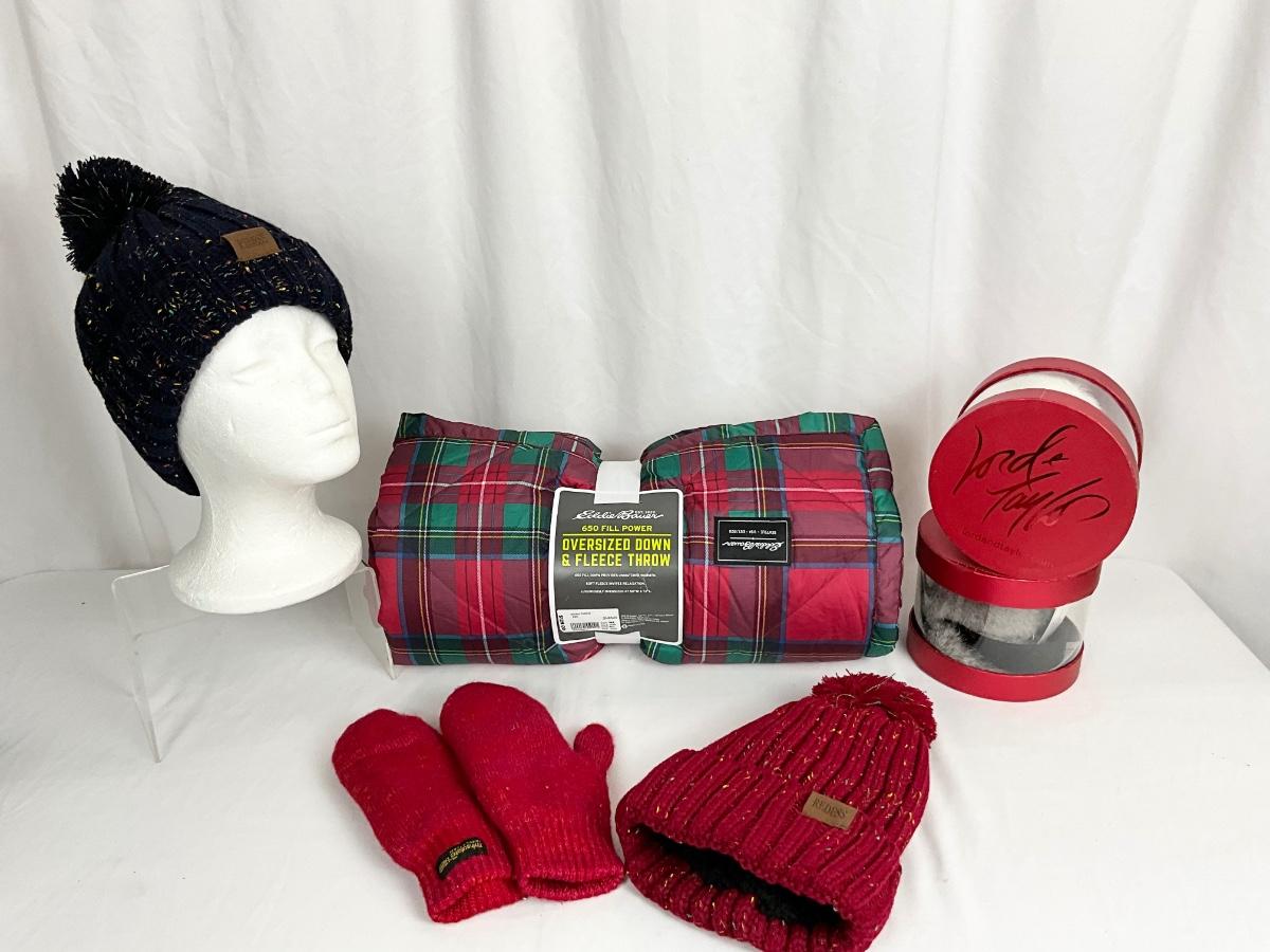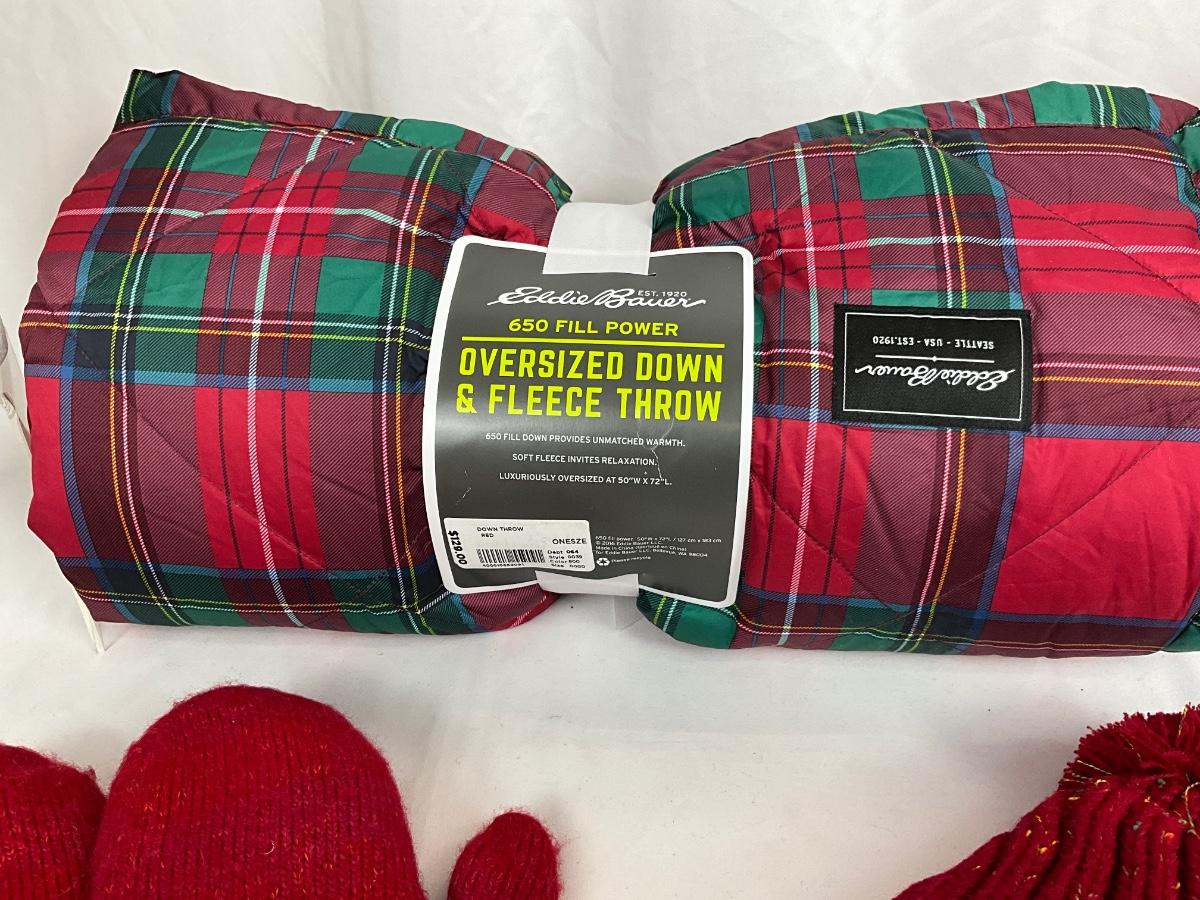 The items in this lot are brand new. There is an Eddie Bauer plaid down blanket that is new with msrp $129, 2 Redess knit hats, thinsulate red gloves and 2 Lord & Taylor ear muffs.