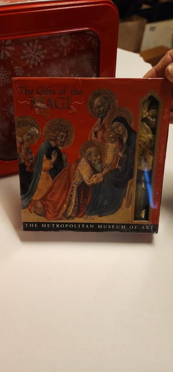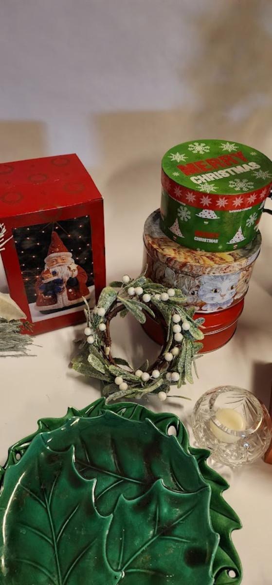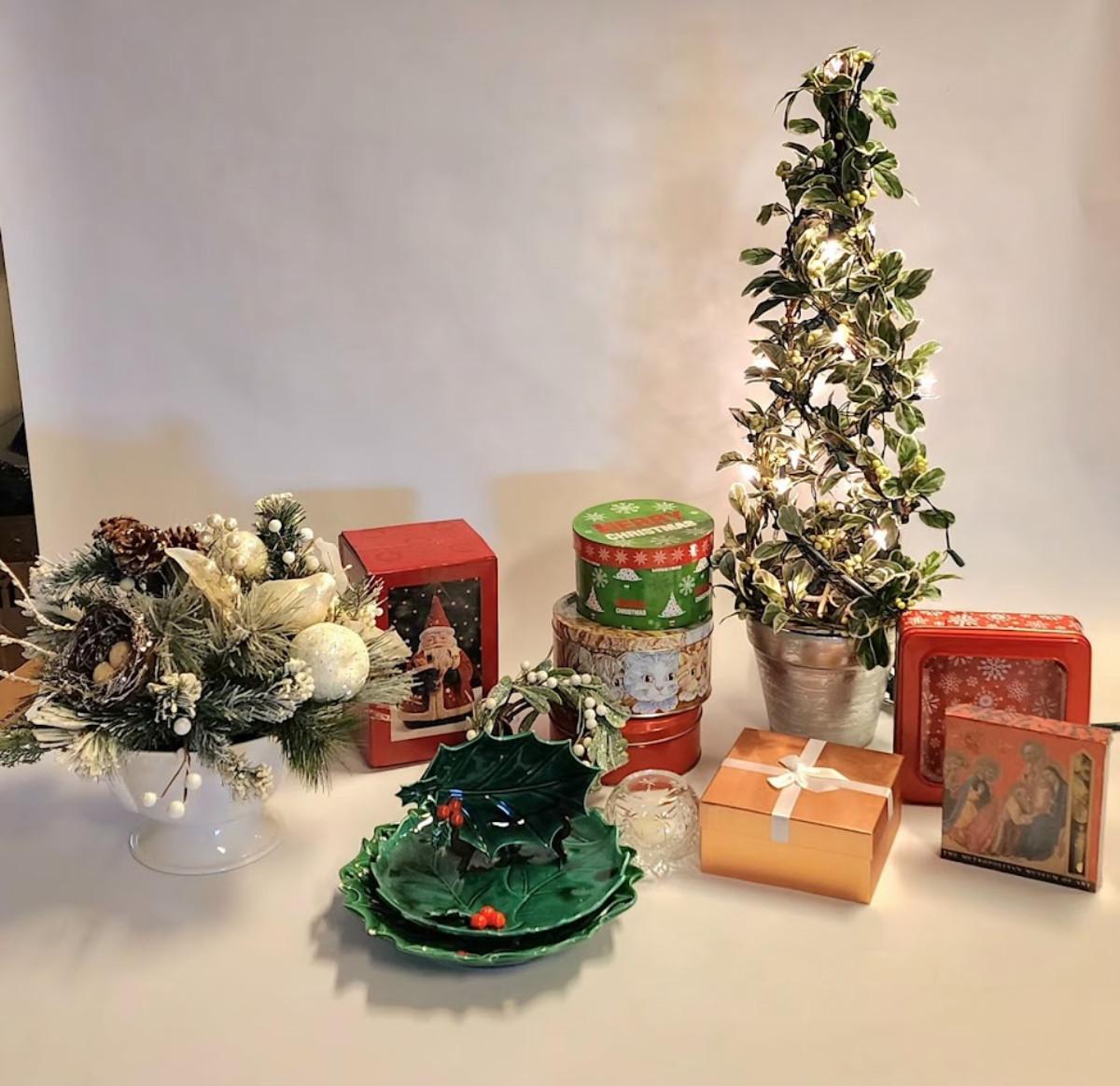 Lot includes: Winter Floral Arrangements, Vintage Santa Tin Box, Green and Red Christmas Tin, Stacked Christmas-Themed Tins, Potted Faux Topiary Tree With Lights, Red Christmas Tin With Snowflake Design, Holly Leaf Serving Dish Set, Gold Gift Box with Ribbon, Glass Votive Candle Holder, Religious Icon Artwork