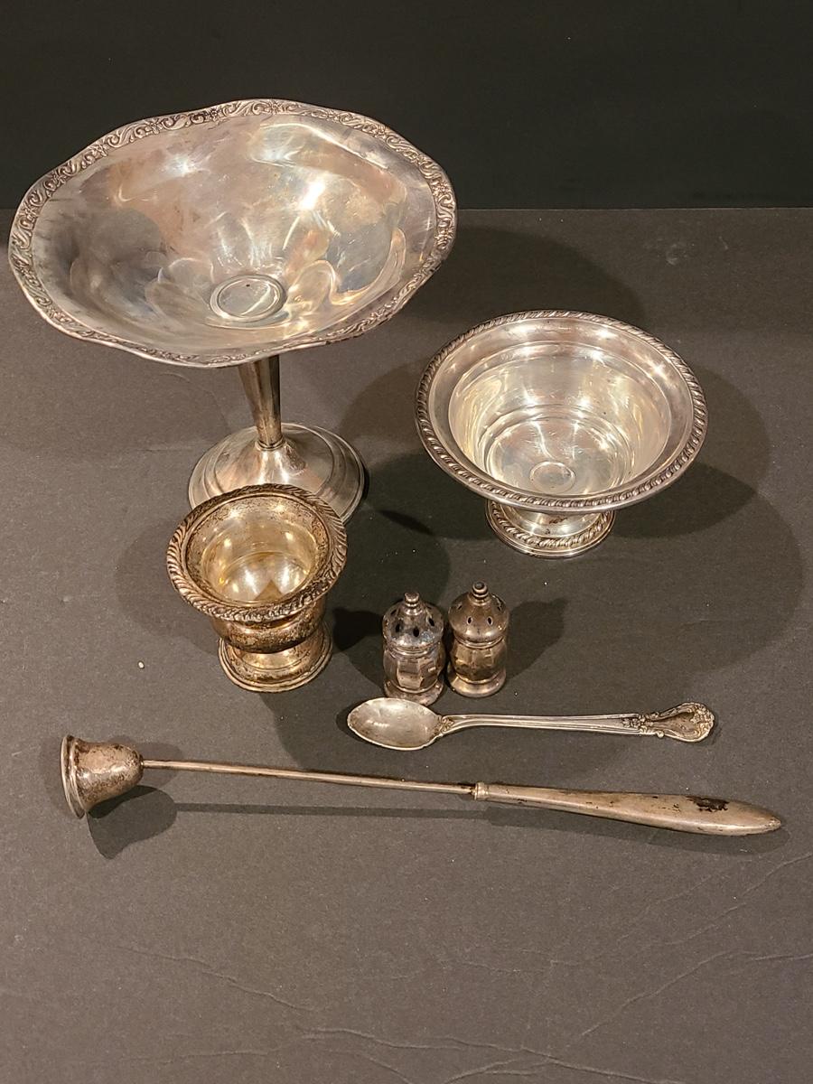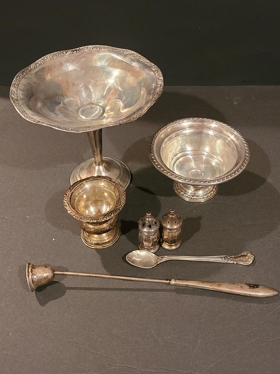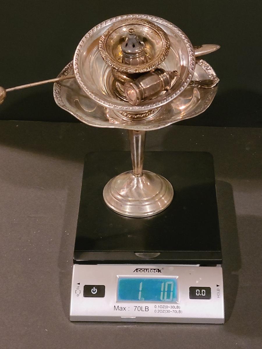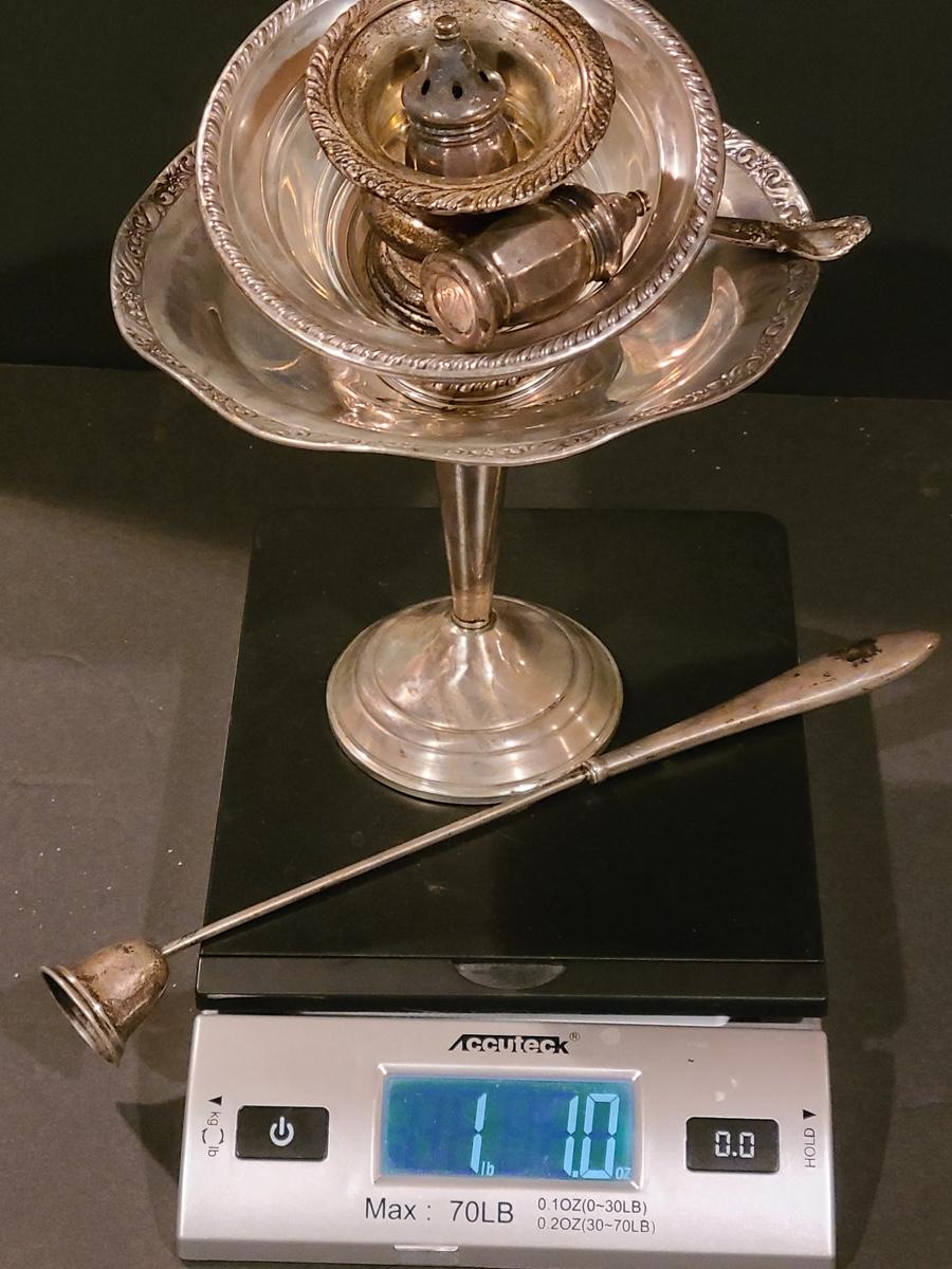 One pound, one ounce of sterling with two having weighted bases. All of these pieces are marked sterling, but they all have condition issues. Please see all pictures. The pictures show condition, measurements if taken, and what is included in the lot. Due to the large amount that we photograph and the time frame, we are not always able to take measurements. All items unless noted, are pre-owned and have been used. If you purchased furniture, you must bring help. We do not allow one person to carry large furniture out on their own. Bring help, tools and a truck for the safety of our client’s homes, and your personal safety. Company policy. Thank you