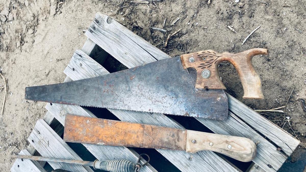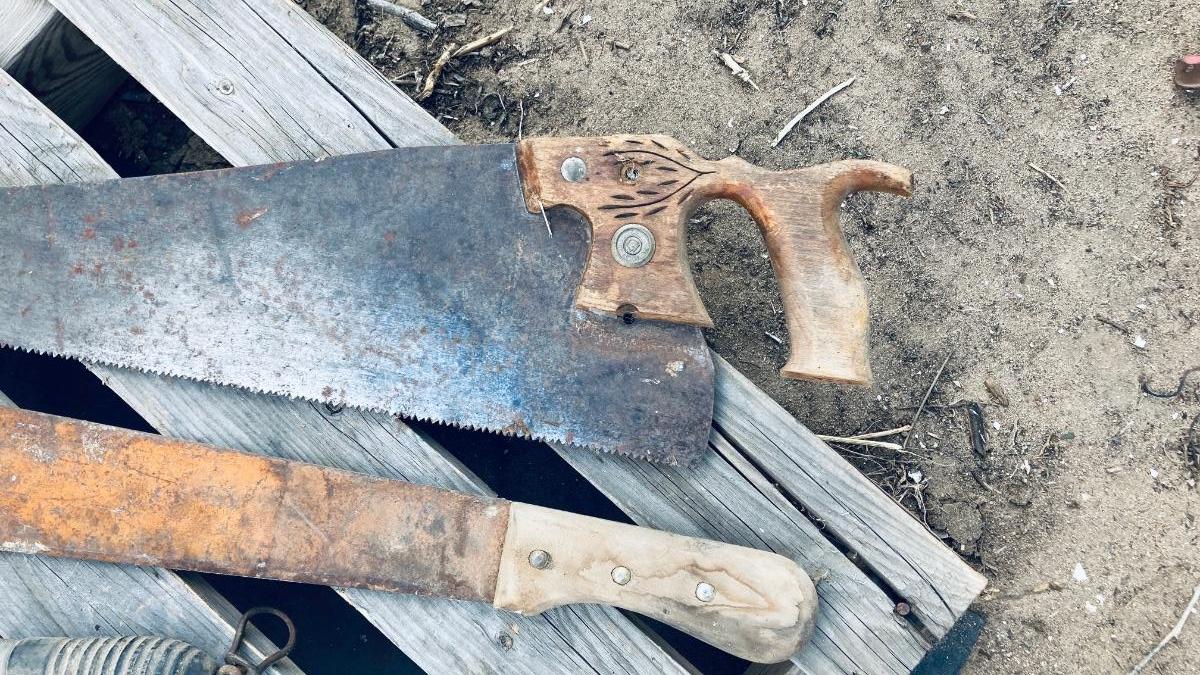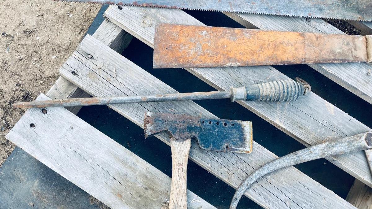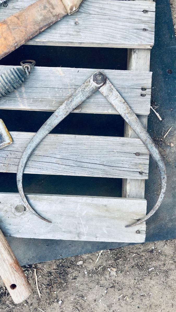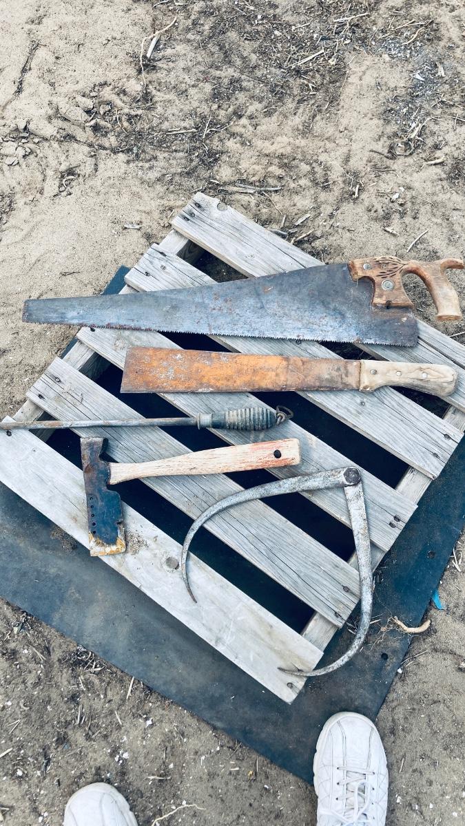 LOT 457 OLD SAW, ROOFING HAMMER, OUTSIDE DIMENSION CALIPER TOOL, KNIFE SHARPENER, PRIMITIVE KNIFE