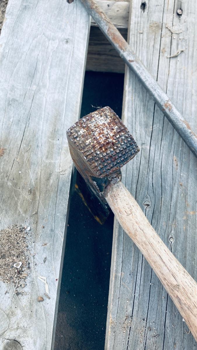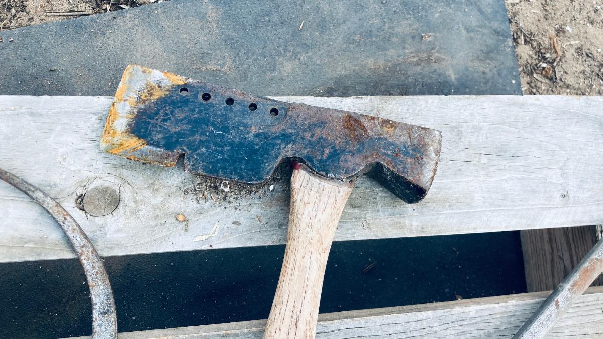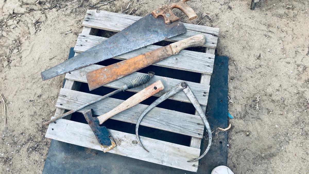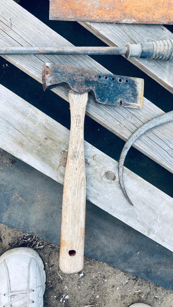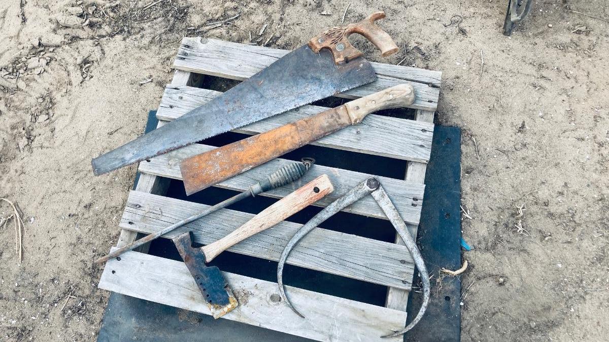 LOT 457 OLD SAW, ROOFING HAMMER, OUTSIDE DIMENSION CALIPER TOOL, KNIFE SHARPENER, PRIMITIVE KNIFE